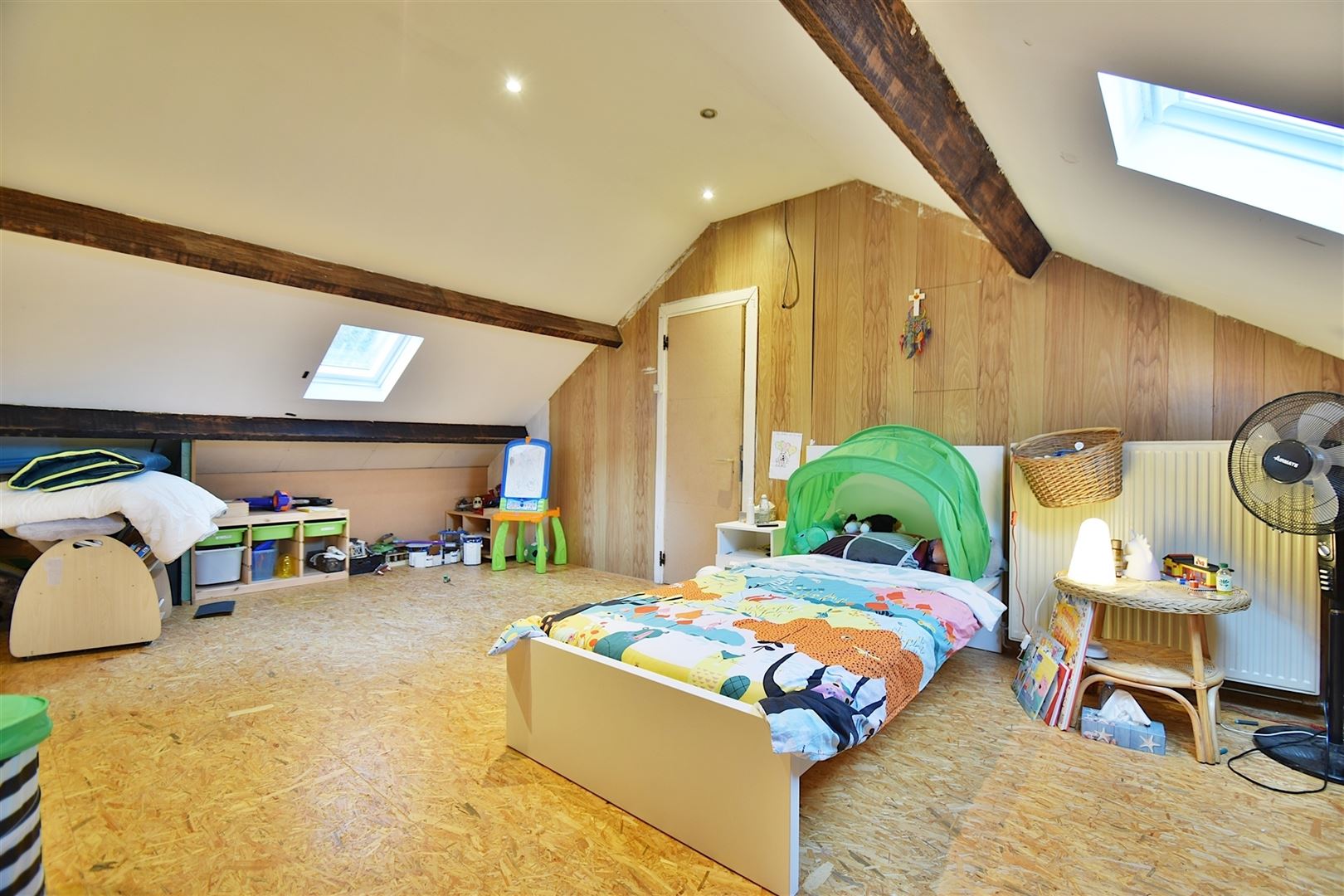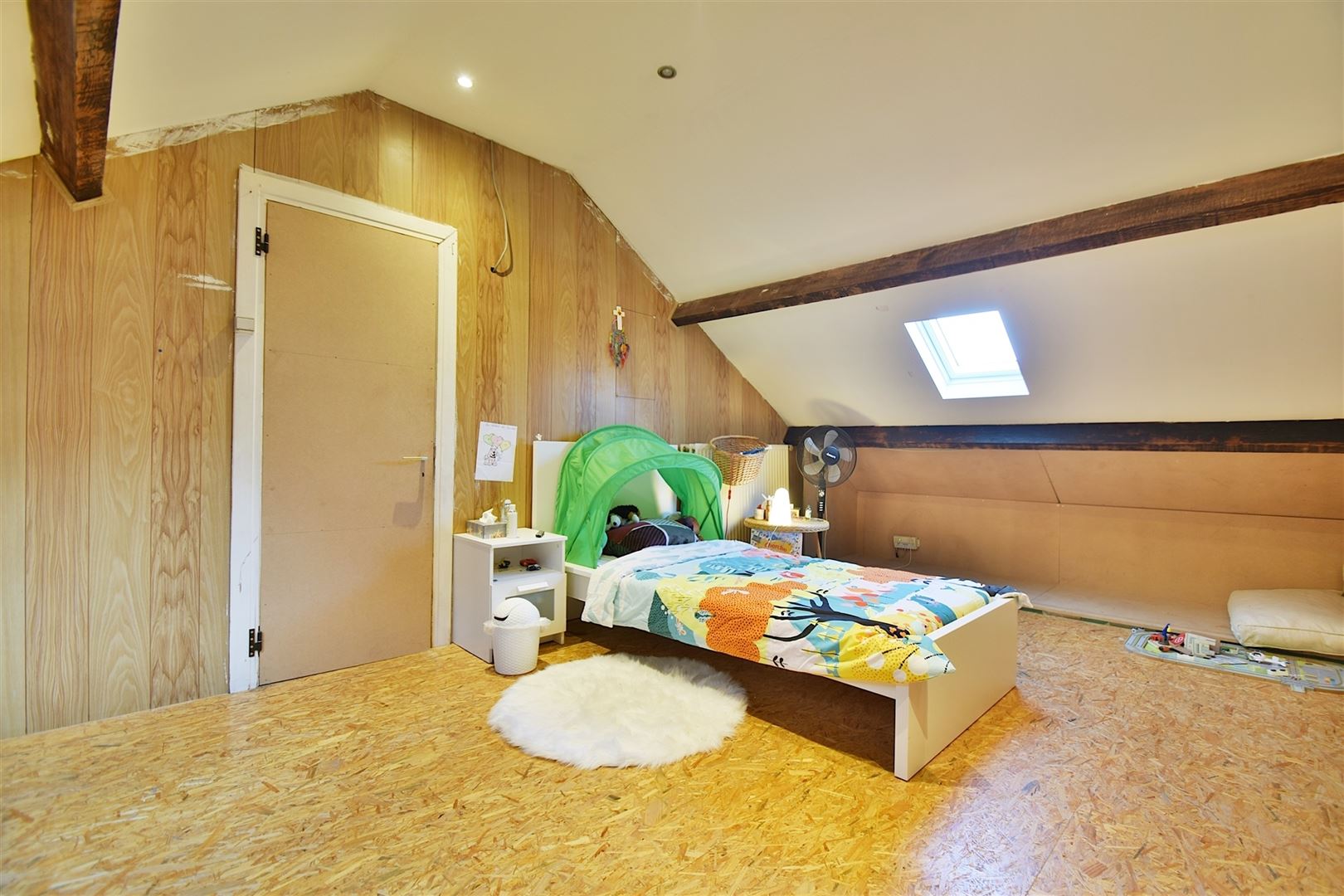 Au 1er étage: Un palier, une vaste chambre de +/- 30 m² et un espace grenier.