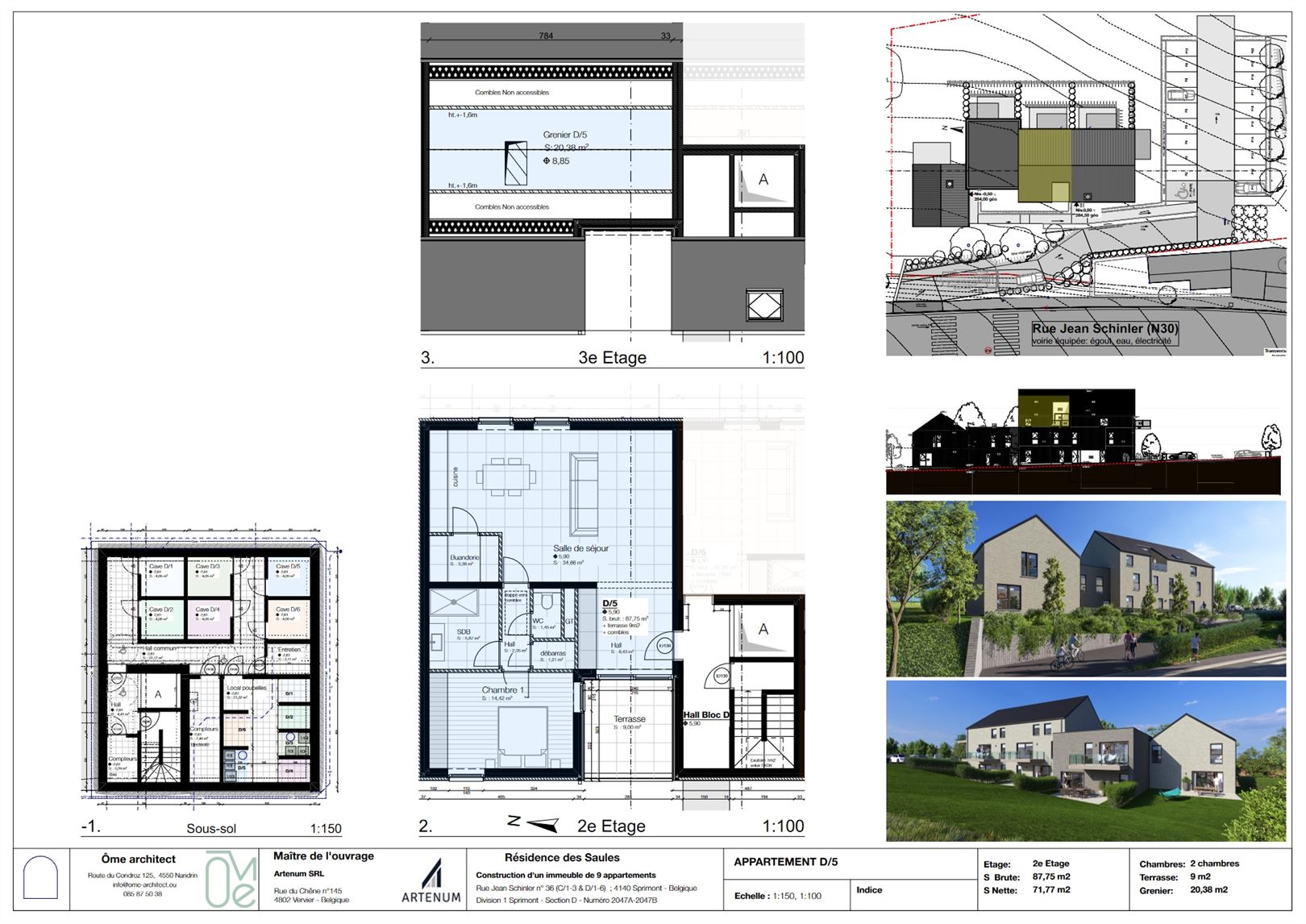 Situé au 2ème étage, cet appartement offre une belle superficie habitable de ± 75 m². Le hall d'entrée s'ouvre sur un spacieux séjour de +/- 37 m² très lumineux grâce à une large baie vitrée qui communique avec une terrasse extérieure bien orientée SUD-OUEST. Le hall de nuit donne accès à la chambre, à la salle de douche, à la buanderie, au WC indépendant ainsi qu'à un espace grenier. Possibilité d'acquérir un ou plusieurs emplacements de parking ainsi qu'une cave privative en sous-sol en supplément. L'utilisation de matériaux de grande qualité, ainsi que sa recherche d'excellence en terme de performance énergétique (basse énergie - Q-ZEN) confère à ce bien un style exclusif et haut de gamme. Caractéristiques techniques: chauffage par le sol, pompe à chaleur air/eau, VMC simple flux, ascenseur, parlophone. Prix: 230.000 € htva. Vente sous régime TVA 21%. www.immo-bertrand.be