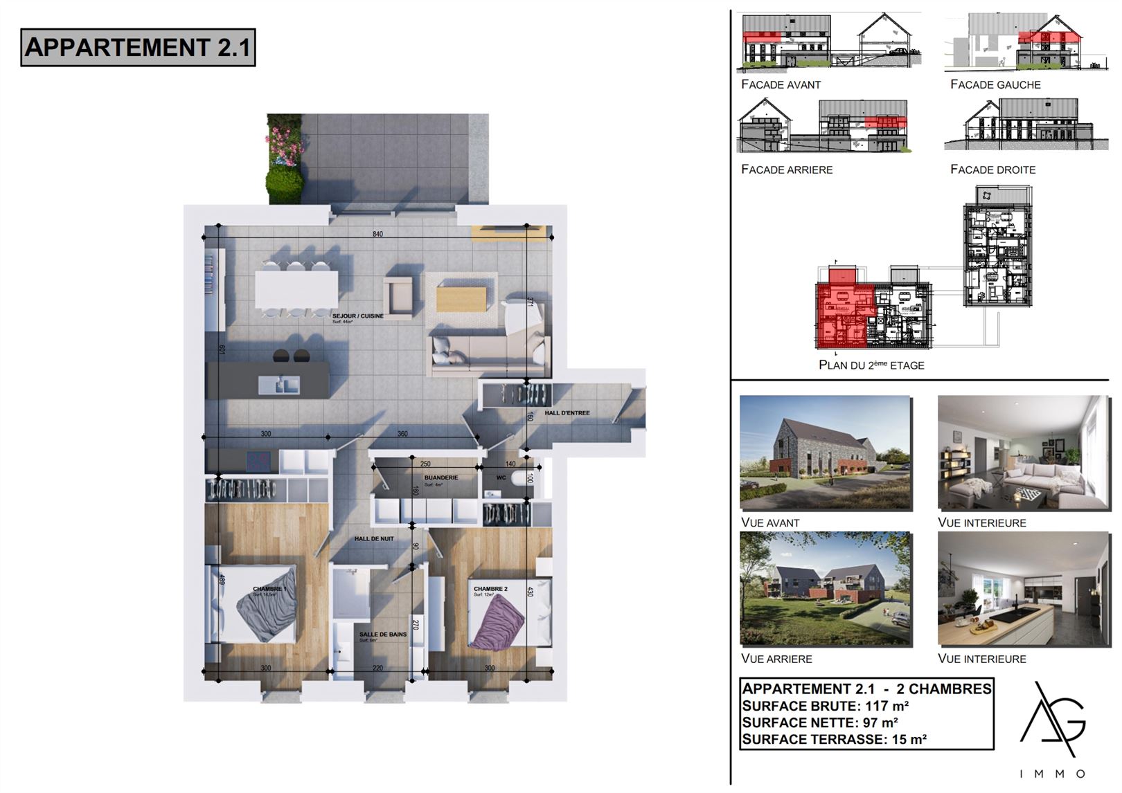 Situé au cœur du charmant village de Nandrin, appartement 2 chambres de 97 m² situé au 2e étage de la résidence avec une spacieuse terrasse de 15 m² . L'agencement de l'appartement comprend un hall d'entrée avec des toilettes séparées un grand séjour avec cuisine ouverte, une arrière-cuisine, 2 chambres, une salle de douche et une buanderie. Les finitions sont de haute qualité, avec un ascenseur et une isolation thermique et acoustique soigneusement réalisée. Le prix comprend une cuisine entièrement équipée ainsi que des revêtements de sol en carrelage et/ou parquet. Il est également possible d'acheter une cave et un emplacement de parking, intérieur ou extérieur, en supplément. Le paiement est prévu à la livraison, qui est estimée pour 2026. La vente est soumise à la TVA de 21%
