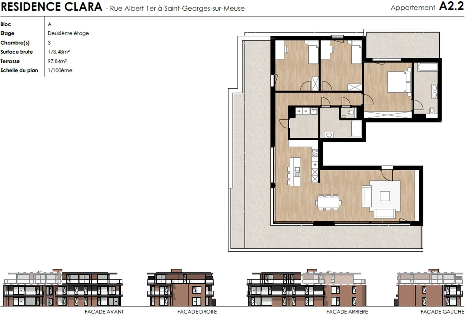 Situé au 2ème étage du "Bloc A", ce bel appartement est composé d'un beau séjour ouvert sur la cuisine entièrement équipée et offrant l'accès à la terrasse de 97 m², 3 agréables chambres, une salle de douche, une salle de bain, une buanderie et une toilette indépendante. Caractéristiques techniques : PEB "A" annoncé, grandes ouvertures sur l'extérieur avec vue sur jardin, châssis aluminium triple vitrage, chauffage par le sol via pompe à chaleur individuelle air/eau, panneaux photovoltaïques, VMC double flux et ASCENSEUR.