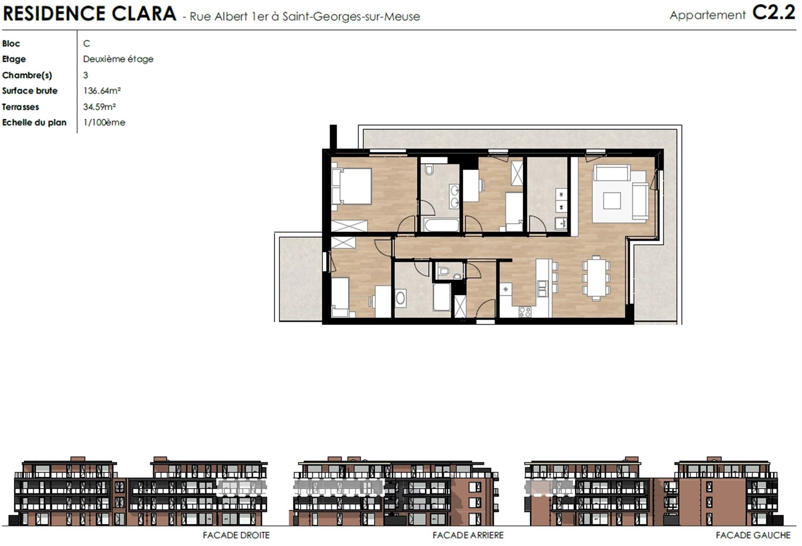 Situé au 2ème étage du "Bloc C", ce bel appartement est composé d'un beau séjour ouvert sur la cuisine entièrement équipée et offrant l'accès à la terrasse de 34 m², 3 agréables chambres, une salle de douche, une salle de bain, une buanderie et une toilette indépendante.