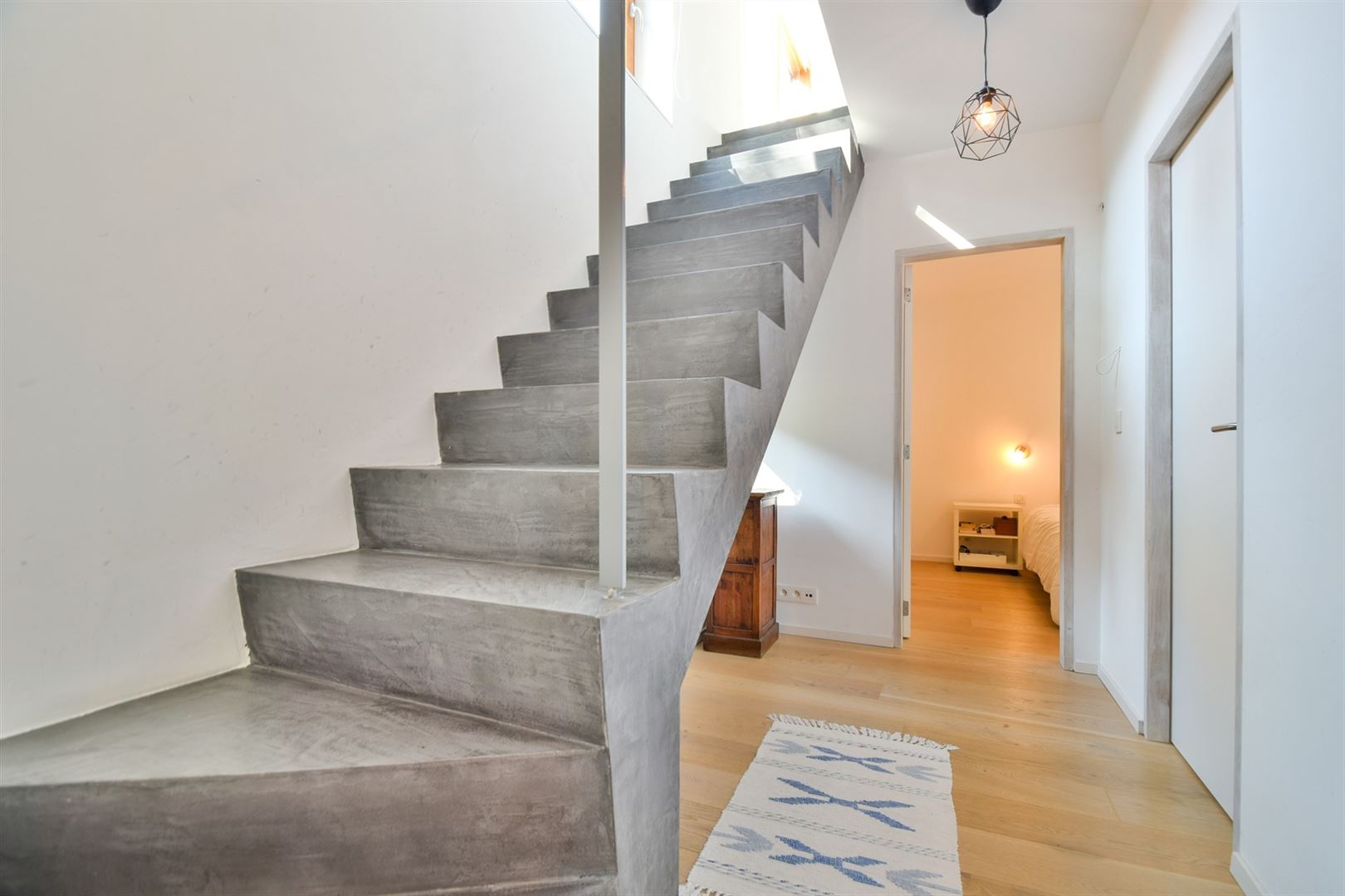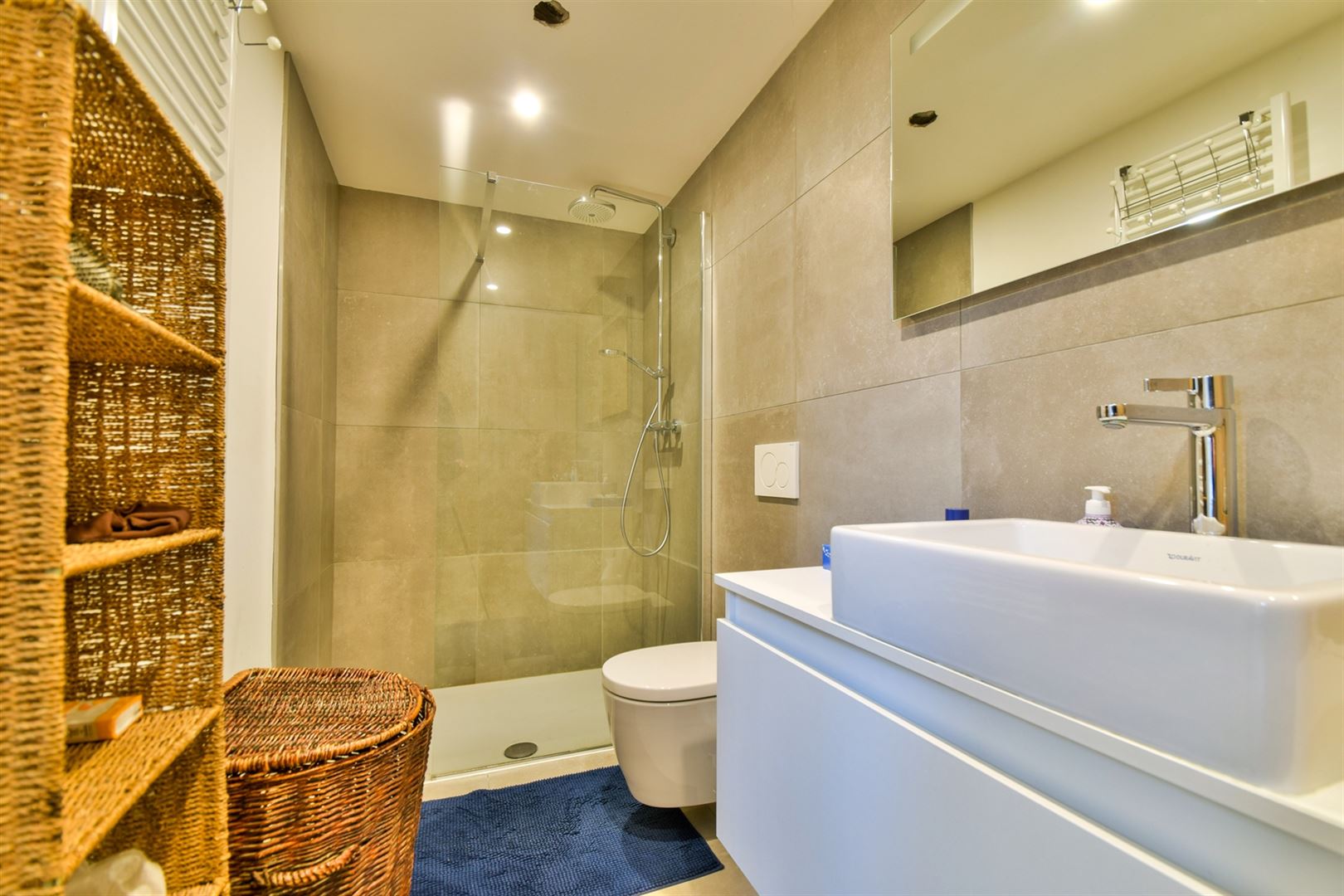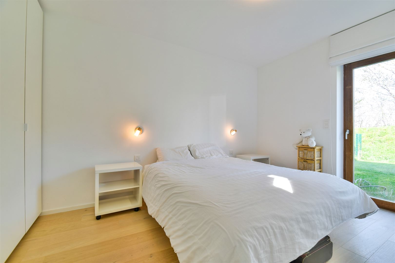Rez-de-jardin : hall de nuit desservant deux chambres, une salle de douche moderne et une buanderie discrètement intégrée.