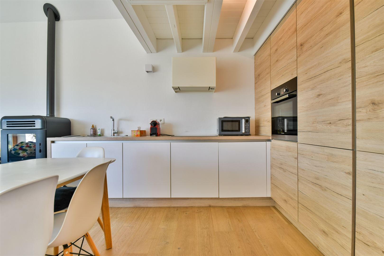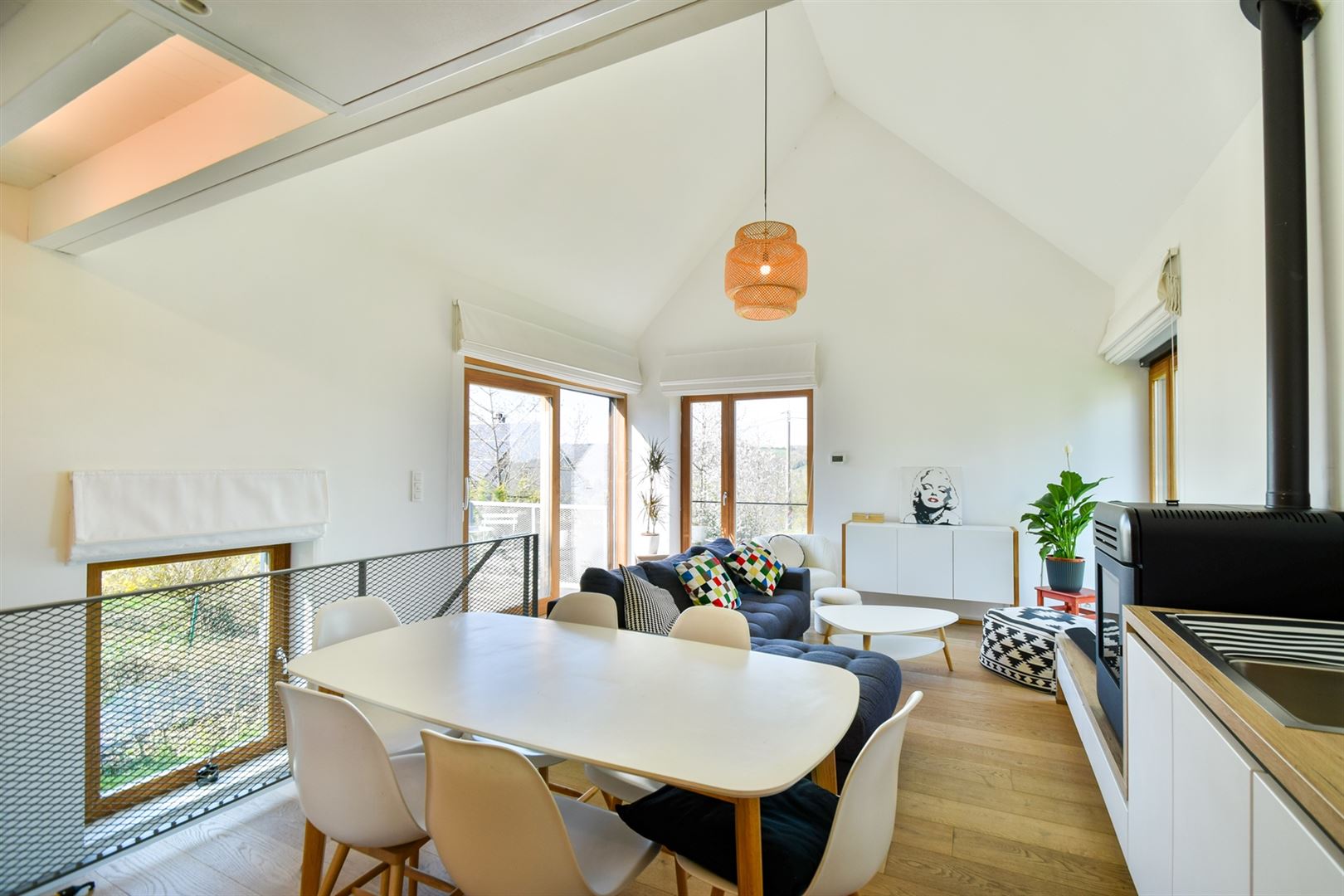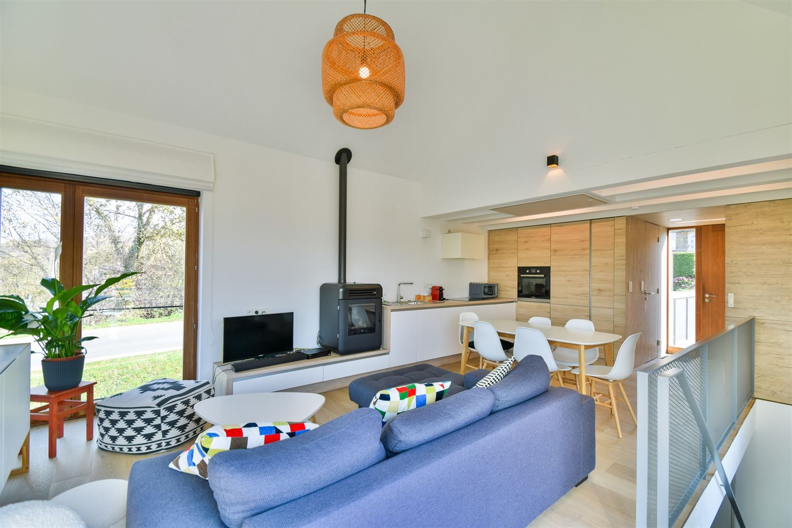 Rez-de-chaussée : hall d’entrée avec rangements sur mesure, une toilette indépendante, un bel espace de vie, très lumineux avec poêle à pellets, cuisine ouverte contemporaine entièrement équipée.