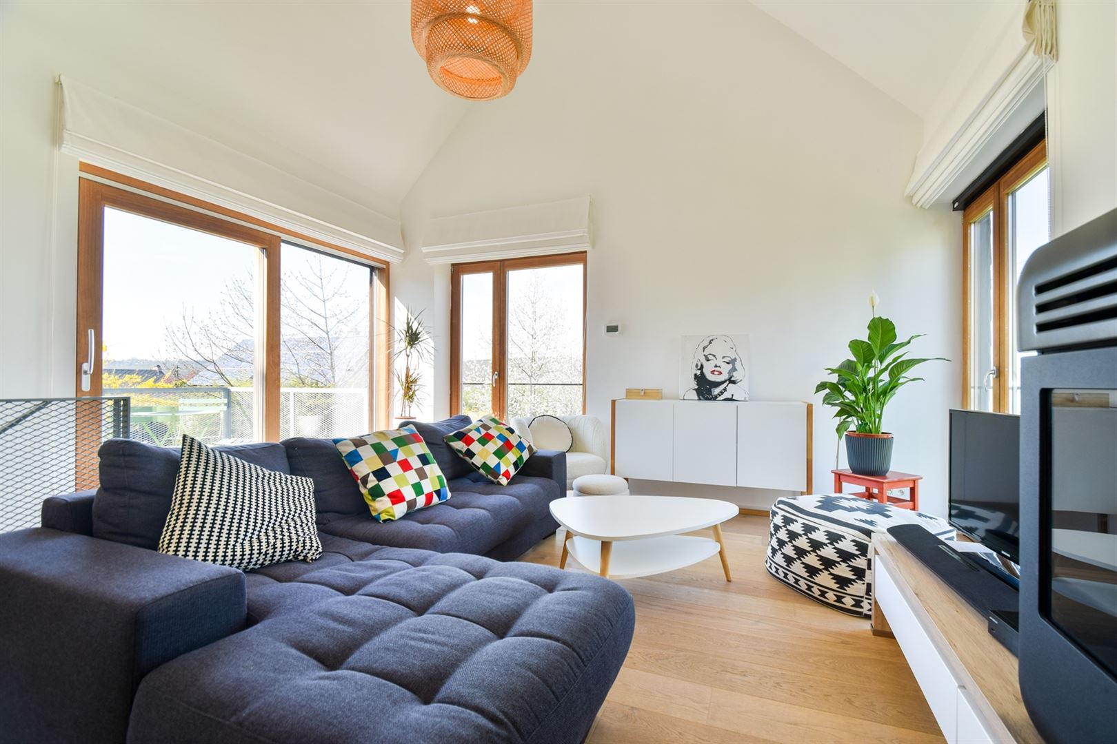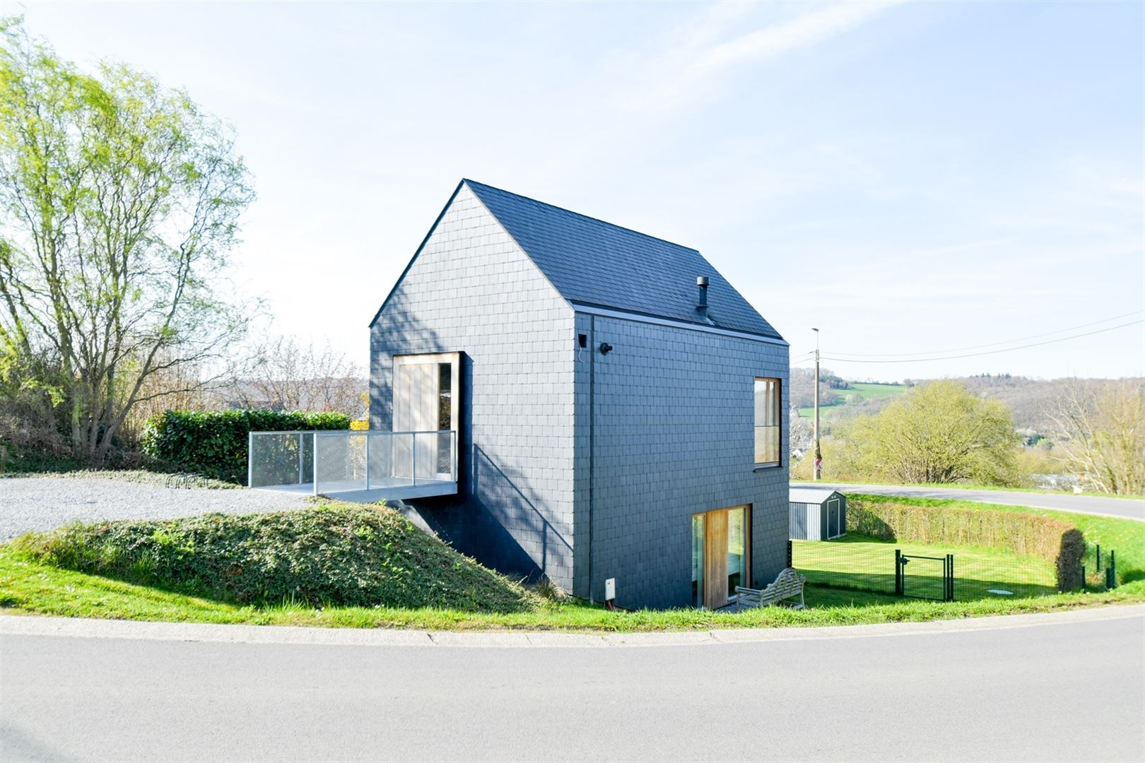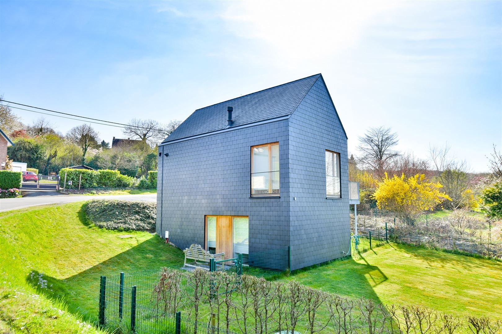 Finitions haut de gamme : parquet semi-massif, châssis haut rendement en bois Afzélia double vitrage, chauffage par le sol au gaz, poêle à pellets, toiture en ardoises naturelles, électricité bi-horaire conforme, excellent PEB B.