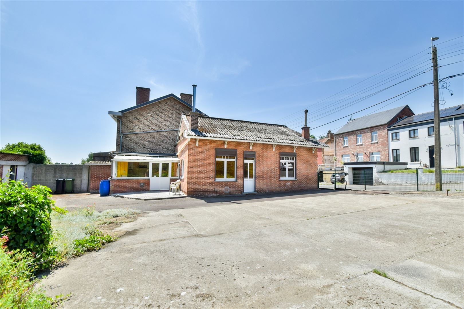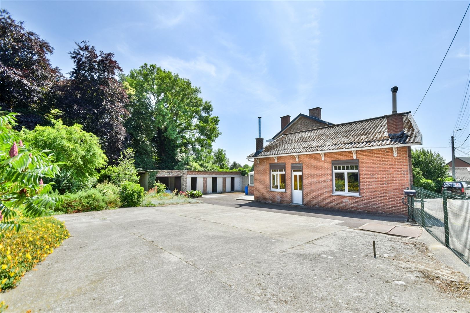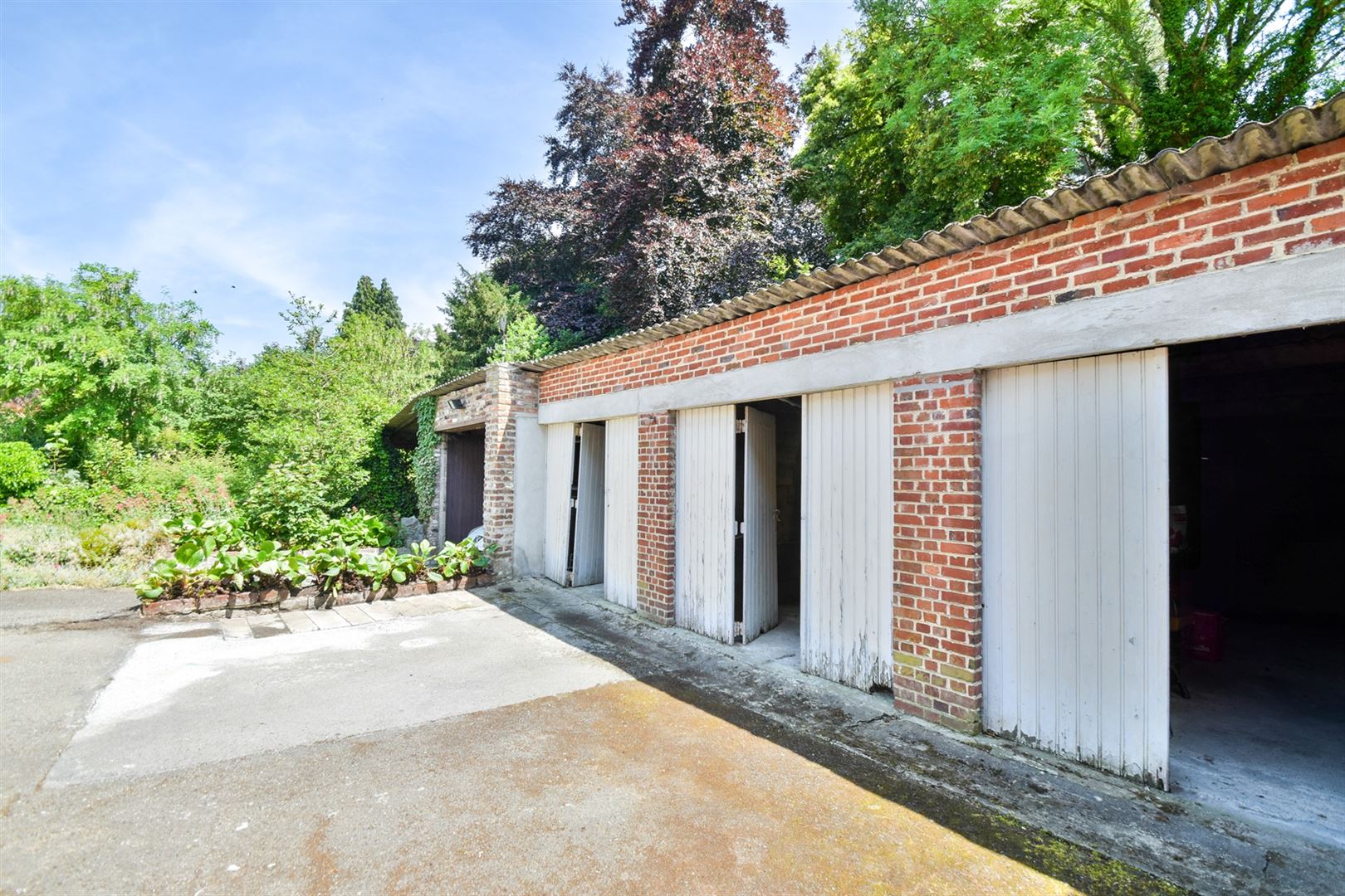 À l’extérieur : quatre grands garages individuels (± 23 m², 18 m², 18 m² et 18 m²), une grande cour ainsi que de nombreux emplacements de parking.