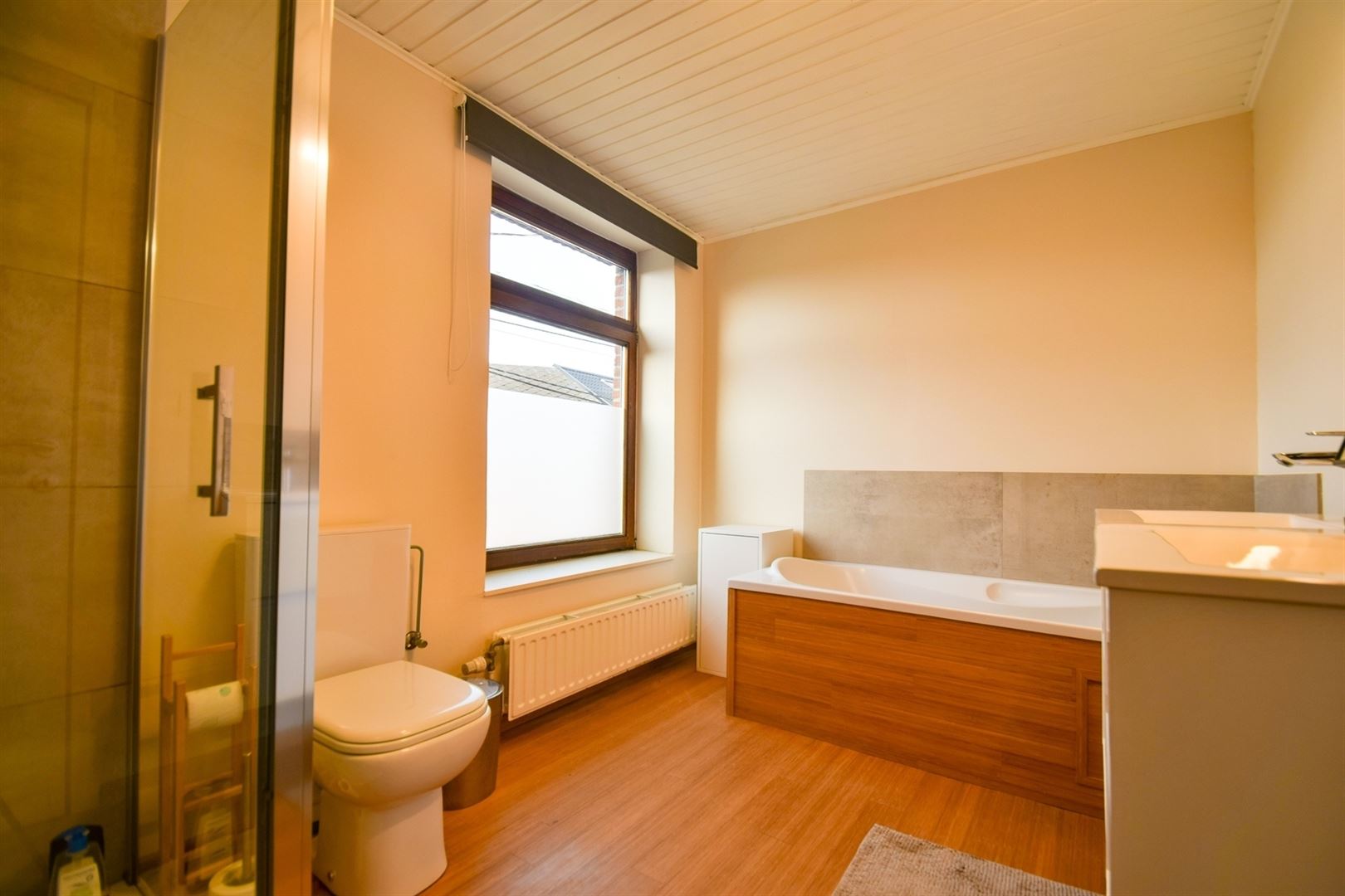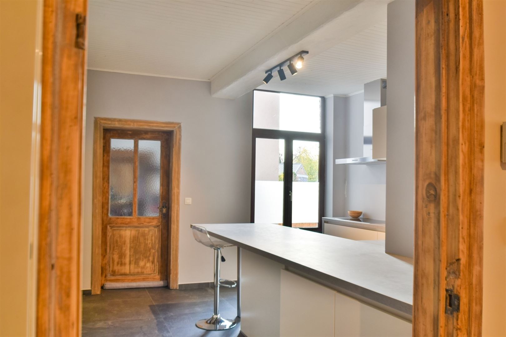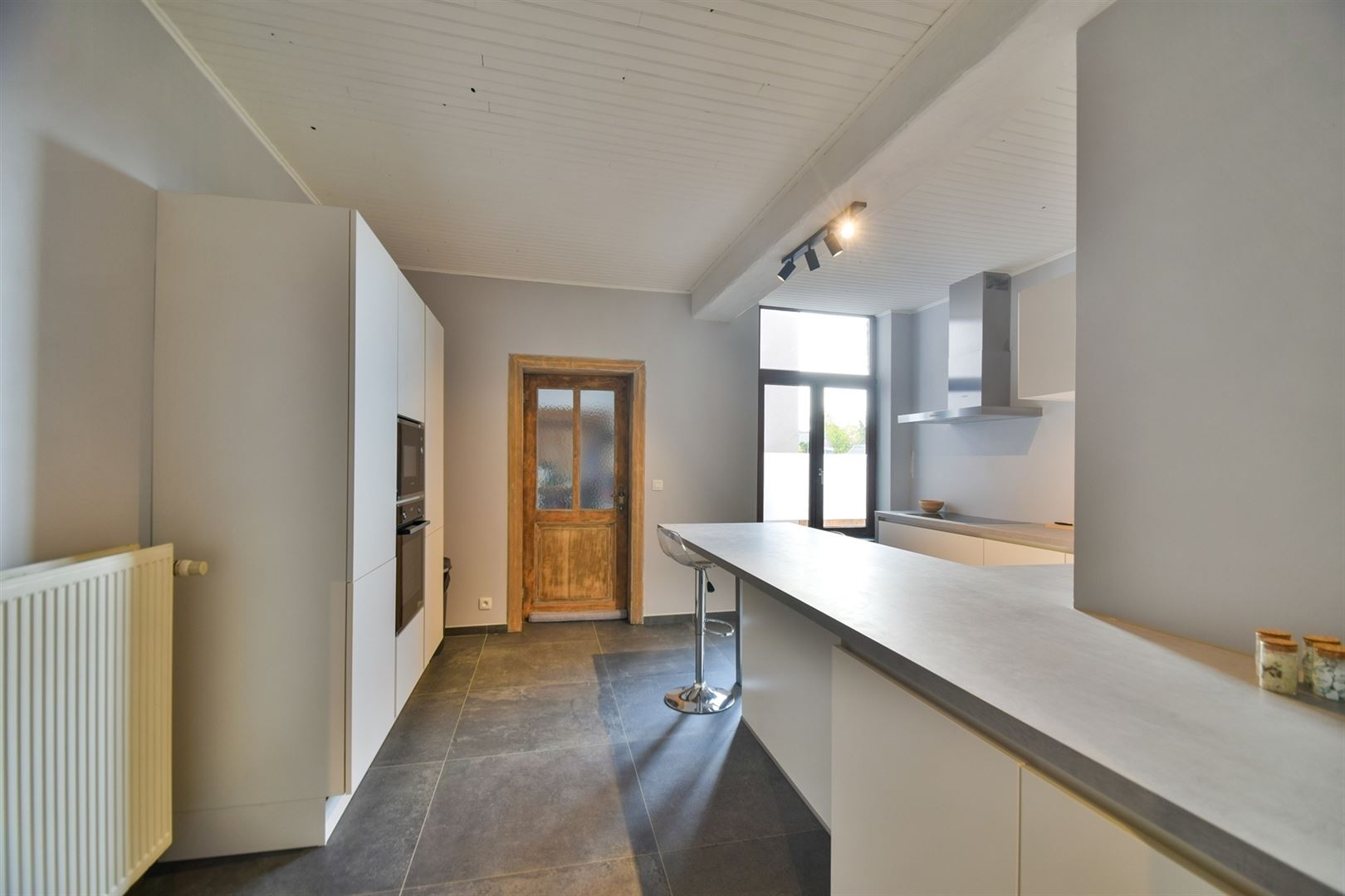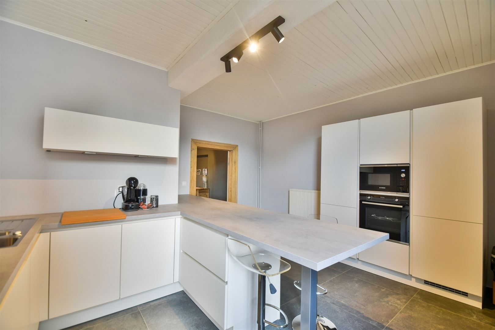 Au rez-de-chaussée : hall d'entrée, lumineux séjour de ±33 m², belle cuisine entièrement équipée avec îlot central, ainsi qu'une buanderie avec WC.