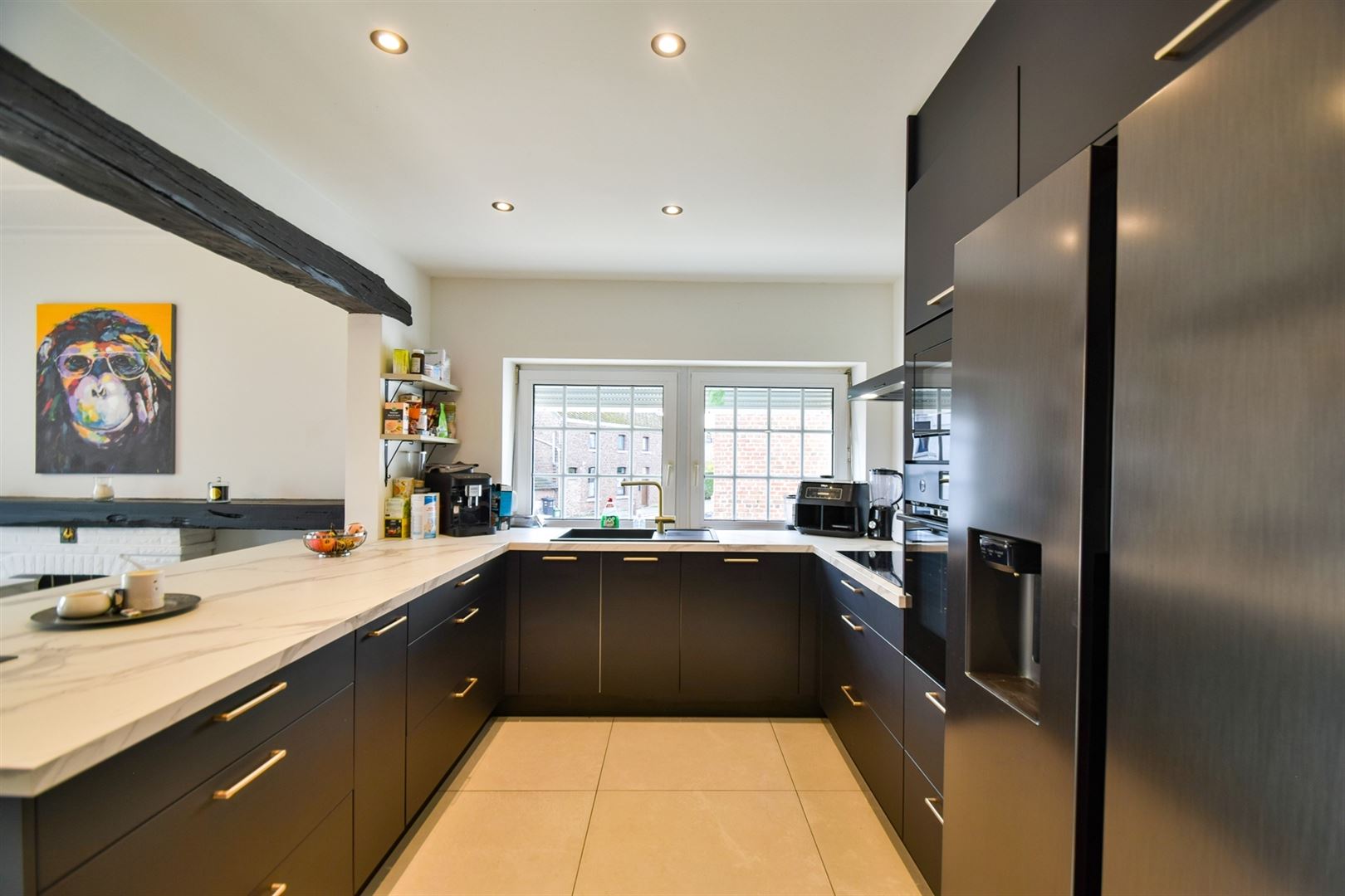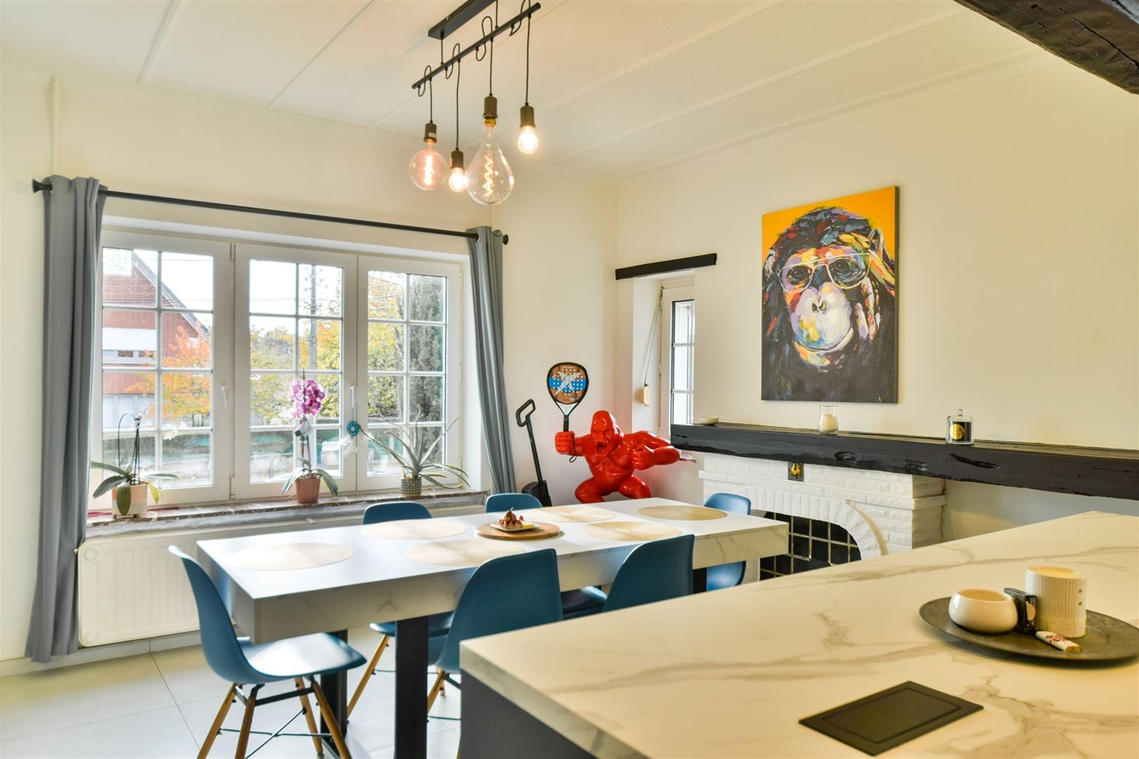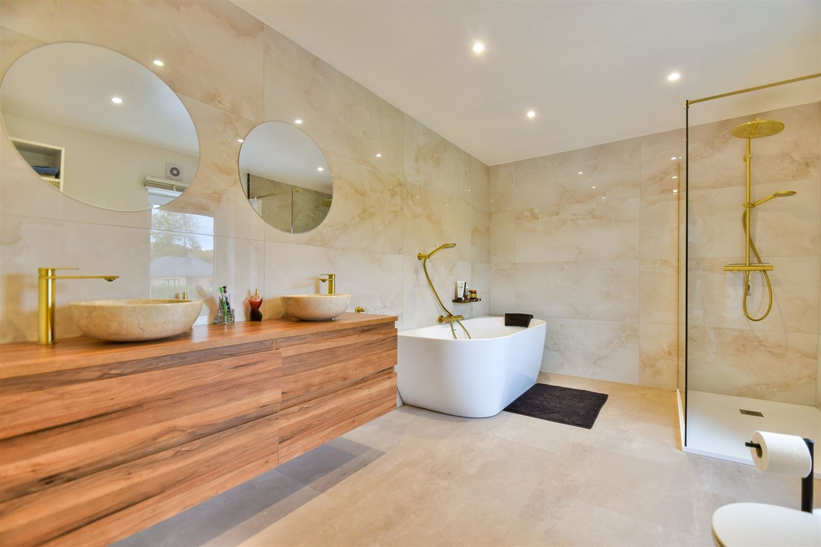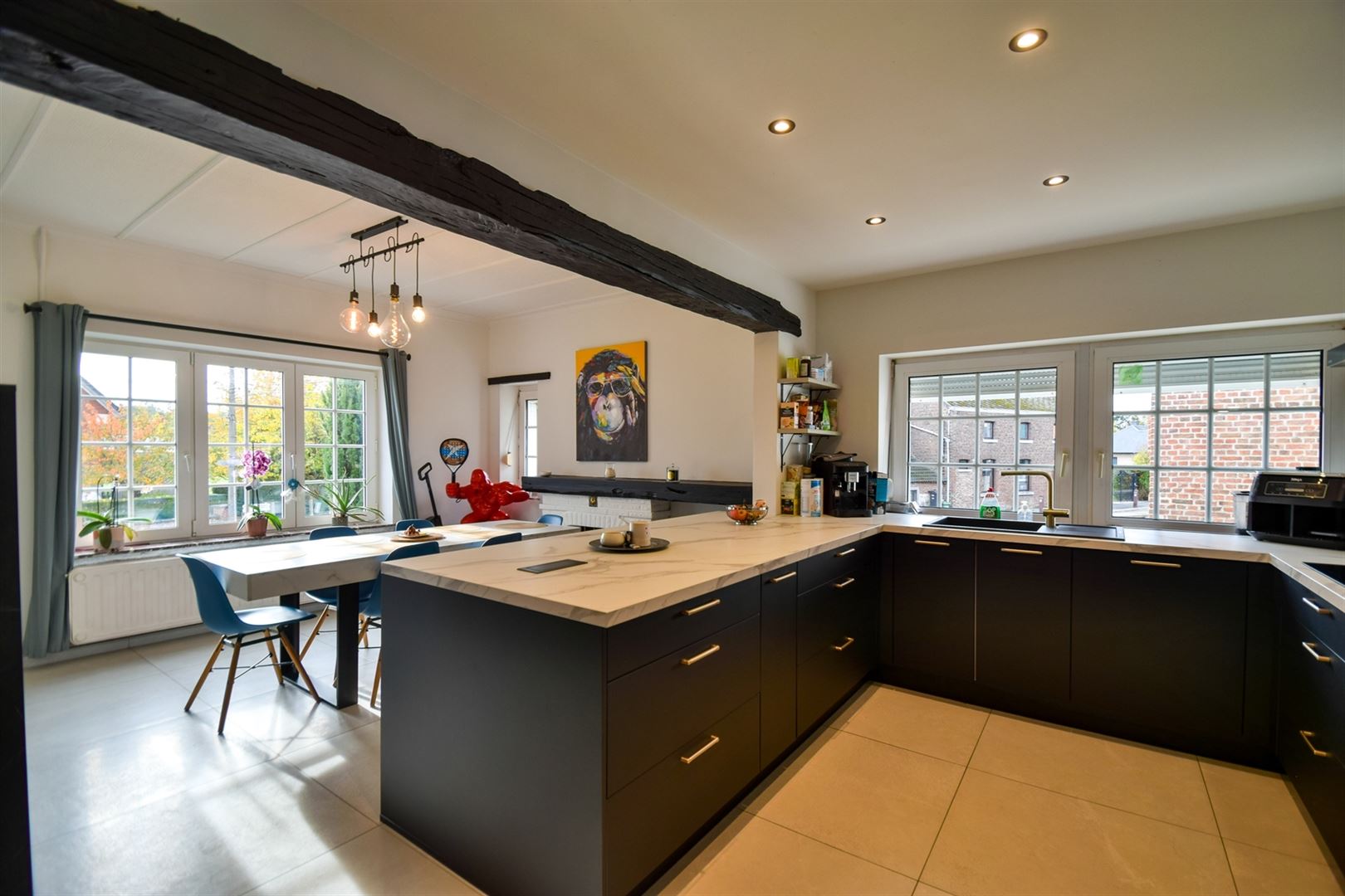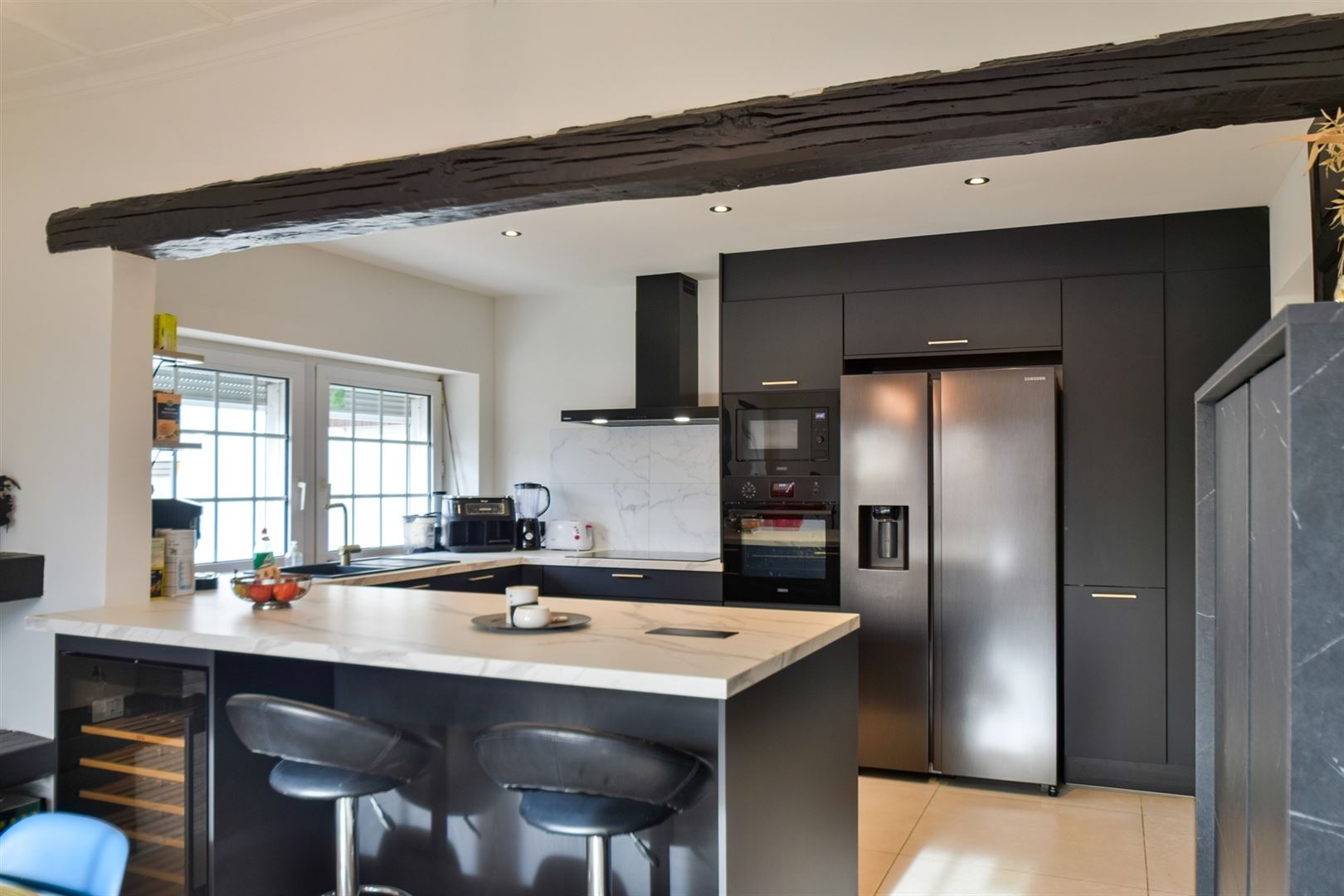 Au rez-de-chaussée : un hall d’entrée, un salon d’environ 25 m² avec poêle à pellets, une lumineuse salle à manger ouverte sur la cuisine de qualité, entièrement équipée et dotée d’une cave à vin encastrée, une véranda de 22 m² avec espace buanderie offrant un accès direct aux extérieurs, idéale comme bureau ou pièce de vie supplémentaire, une toilette indépendante et un garage de ± 24 m². Au