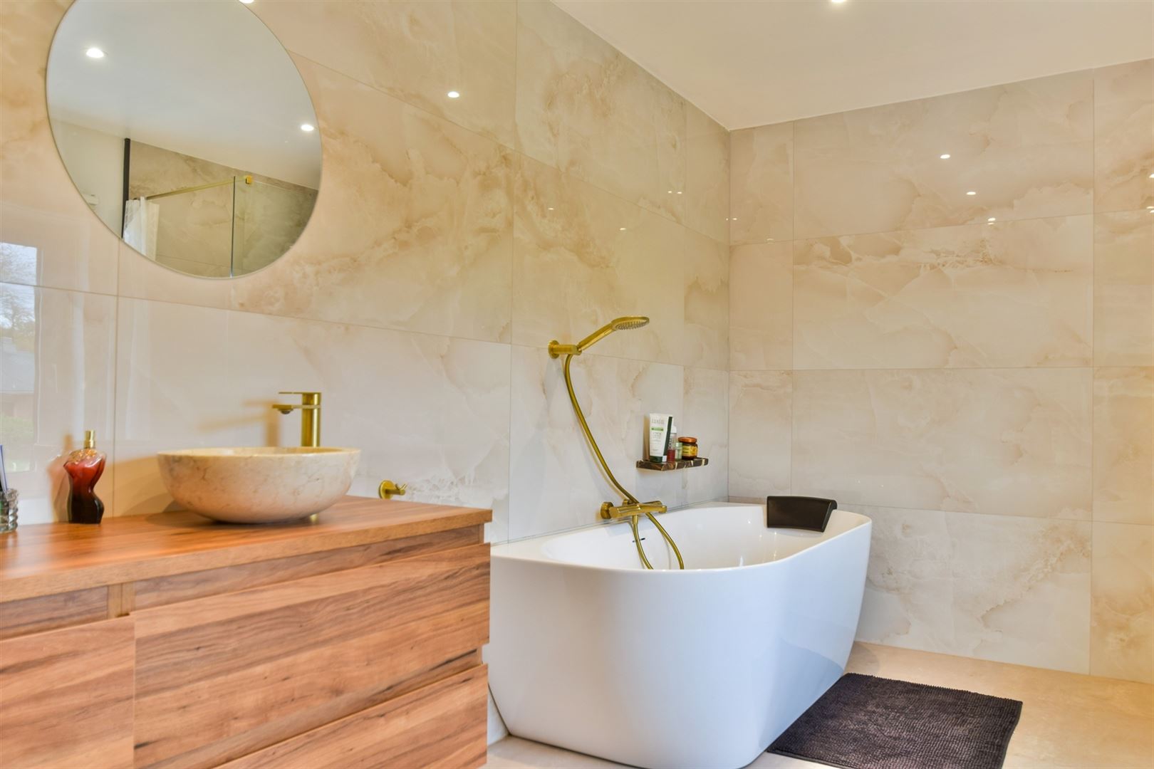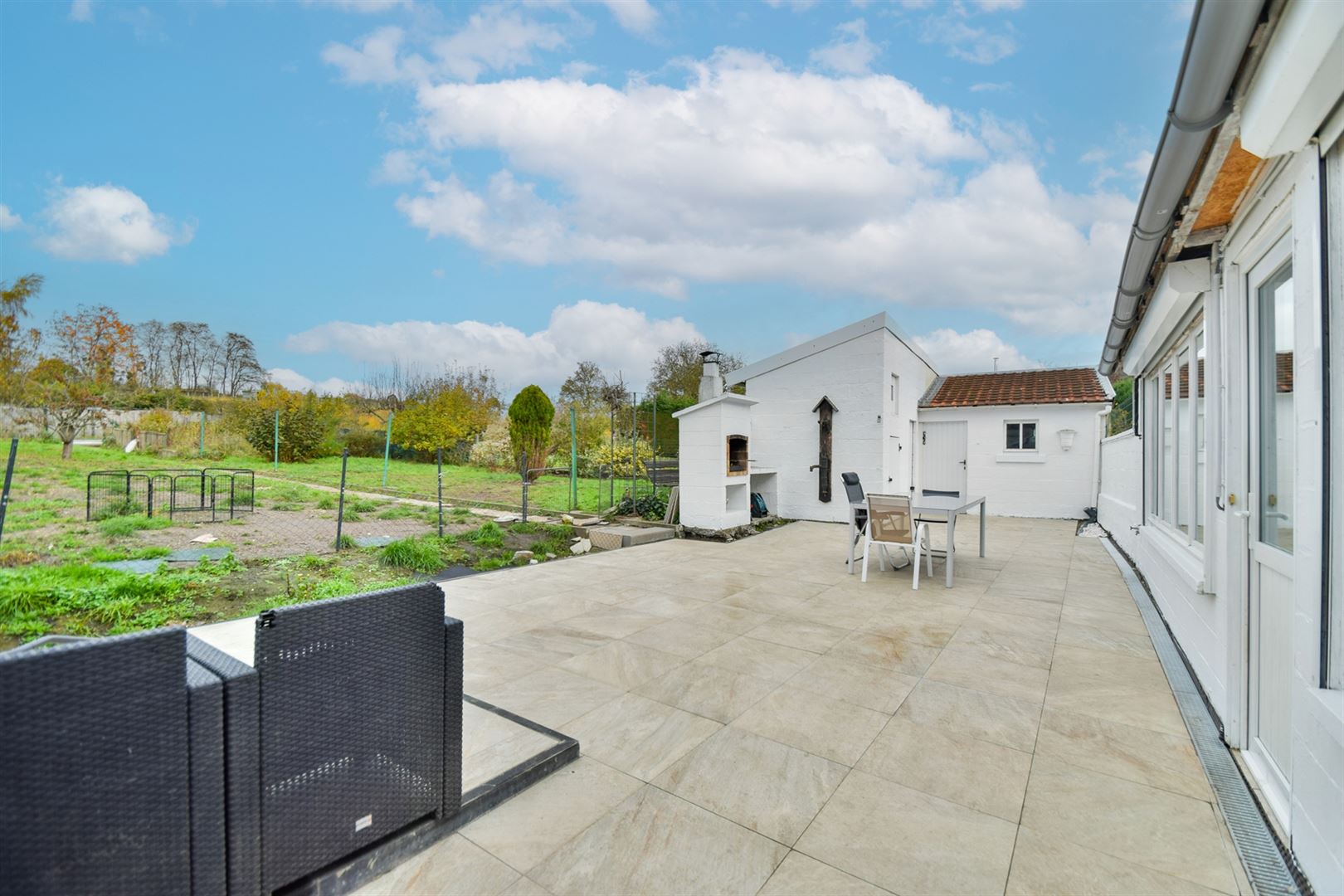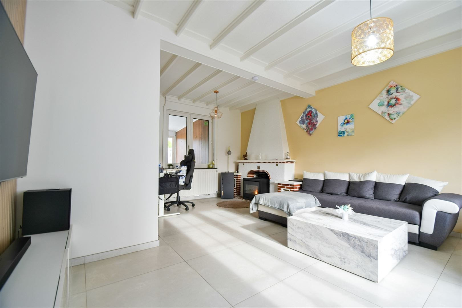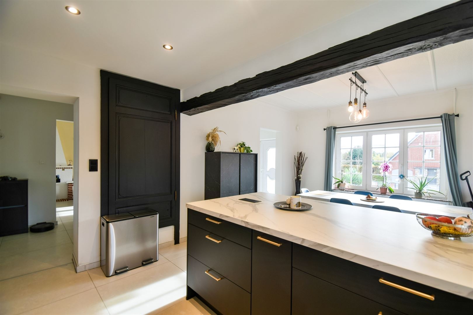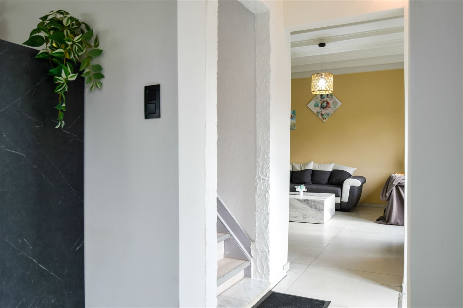 Au rez-de-chaussée : un hall d’entrée, un salon d’environ 25 m² avec poêle à pellets, une lumineuse salle à manger ouverte sur la cuisine de qualité, entièrement équipée et dotée d’une cave à vin encastrée, une véranda de 22 m² avec espace buanderie offrant un accès direct aux extérieurs, idéale comme bureau ou pièce de vie supplémentaire, une toilette indépendante et un garage de ± 24 m². Au