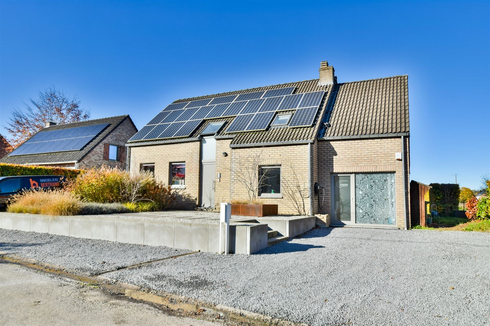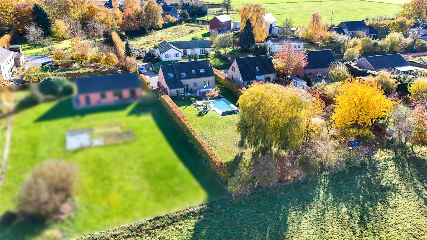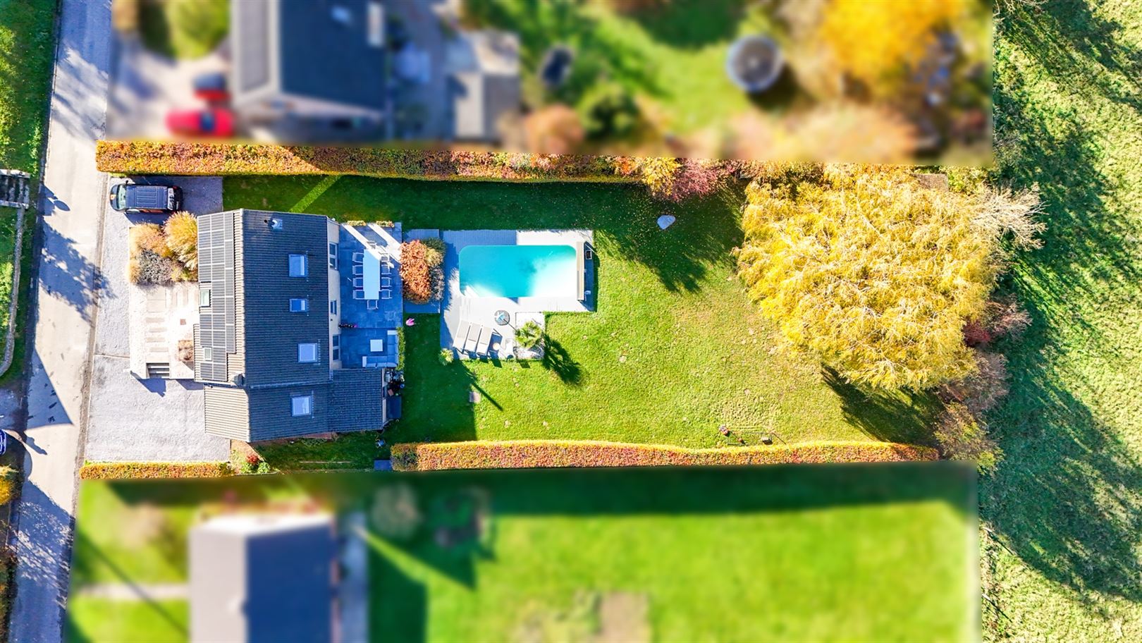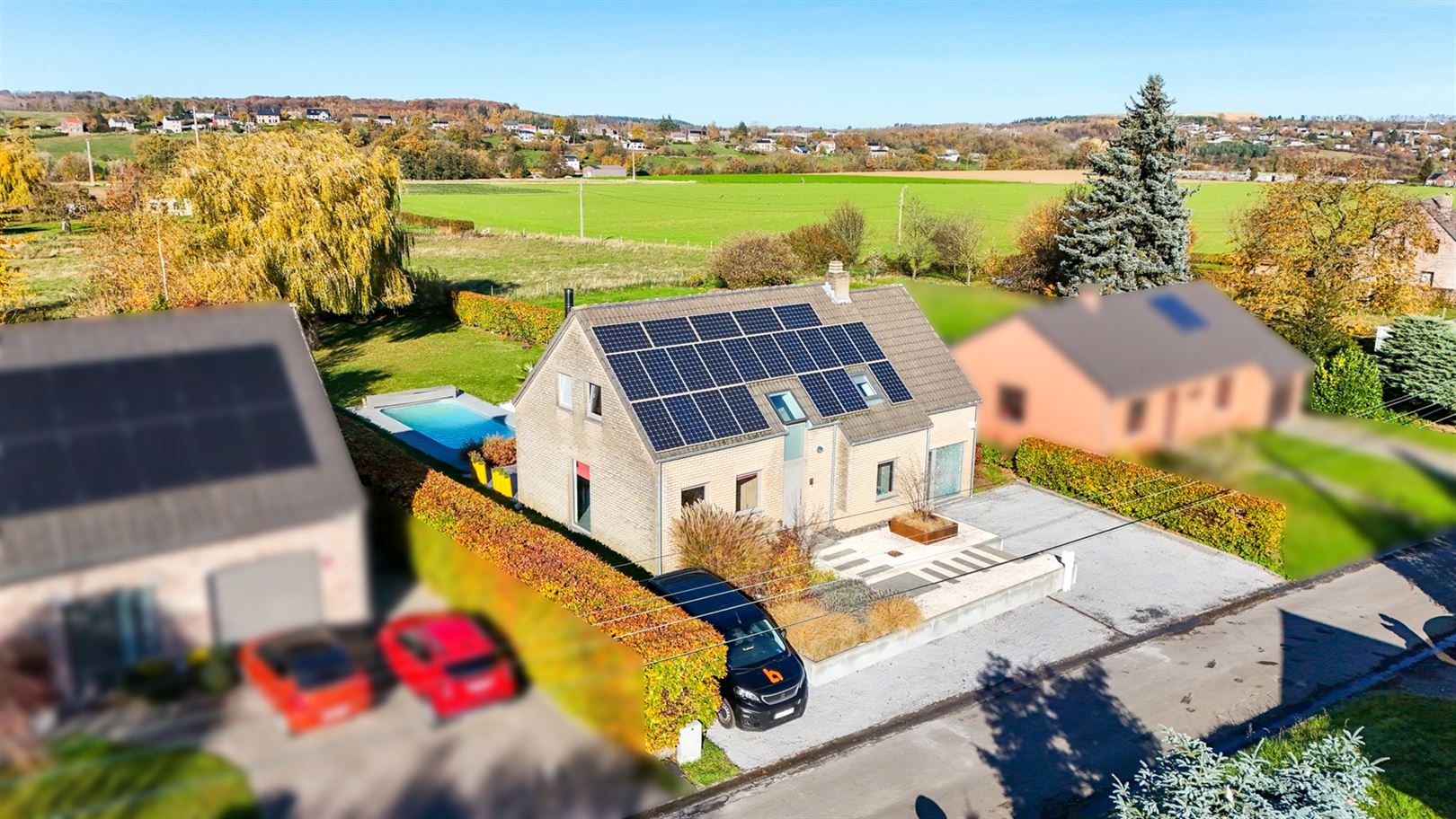 Caractéristiques techniques : châssis PVC double vitrage, chauffage central au mazout et poêle à bois, 22 panneaux photovoltaïques, adoucisseur d’eau, vides ventilés, citerne d’eau de pluie et robot tondeuse.