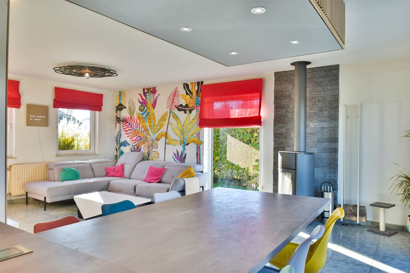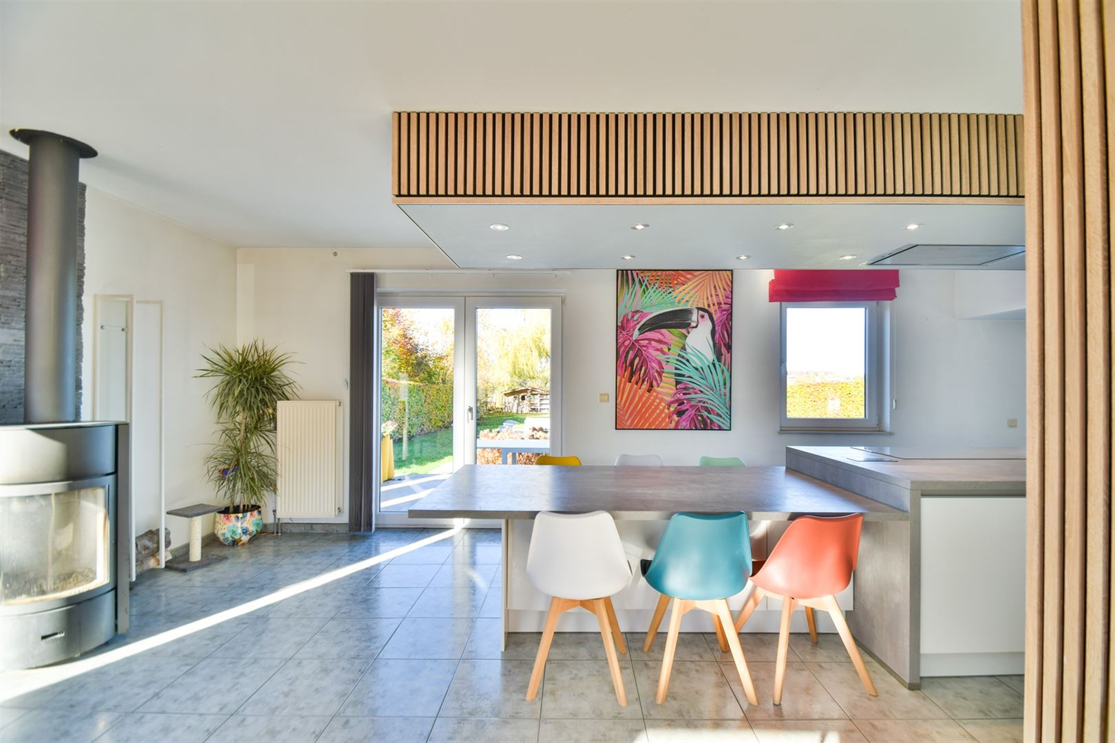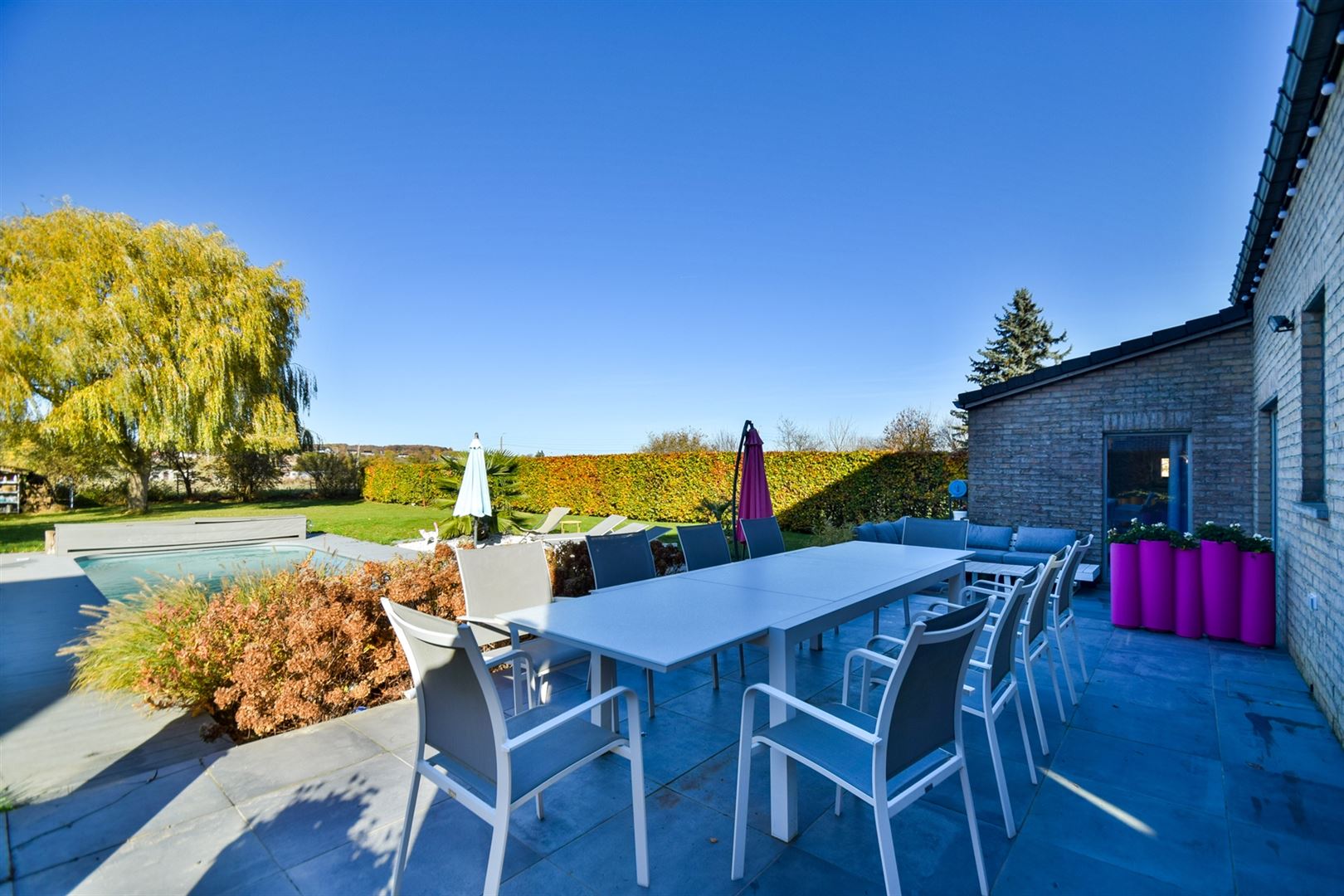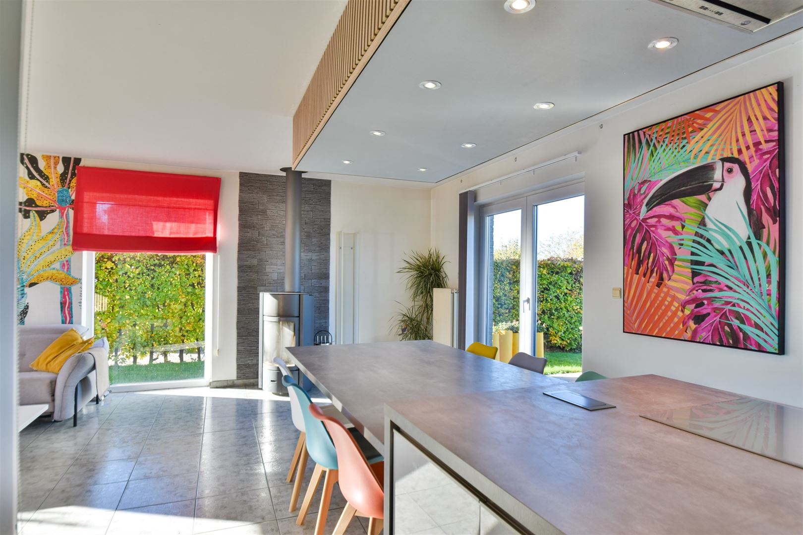 Caractéristiques techniques : châssis PVC double vitrage, chauffage central au mazout et poêle à bois, 22 panneaux photovoltaïques, adoucisseur d’eau, vides ventilés, citerne d’eau de pluie et robot tondeuse.