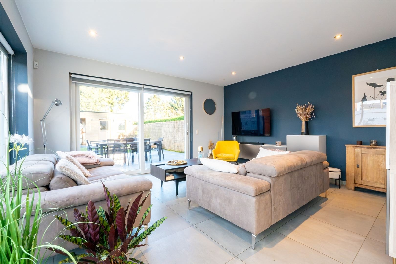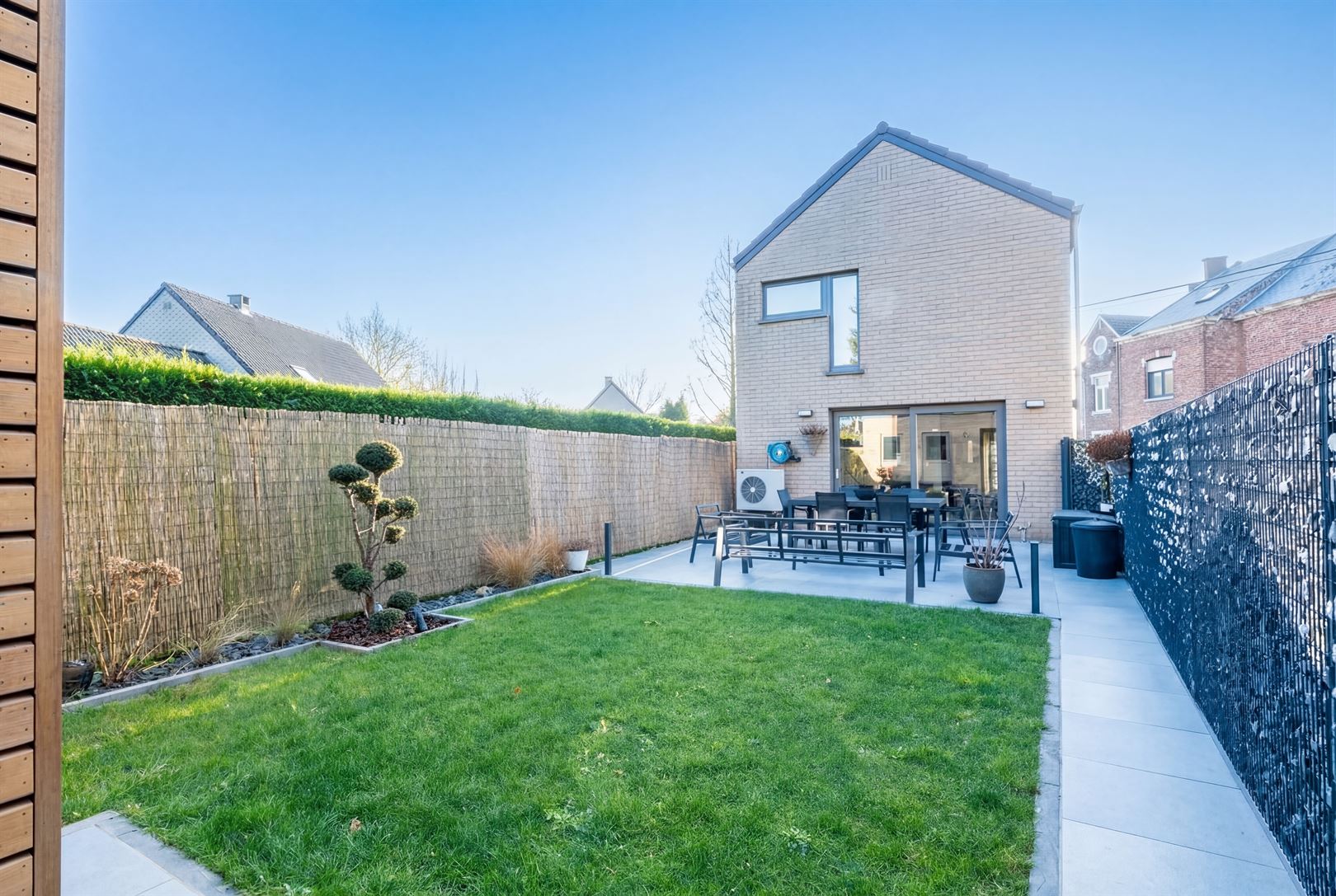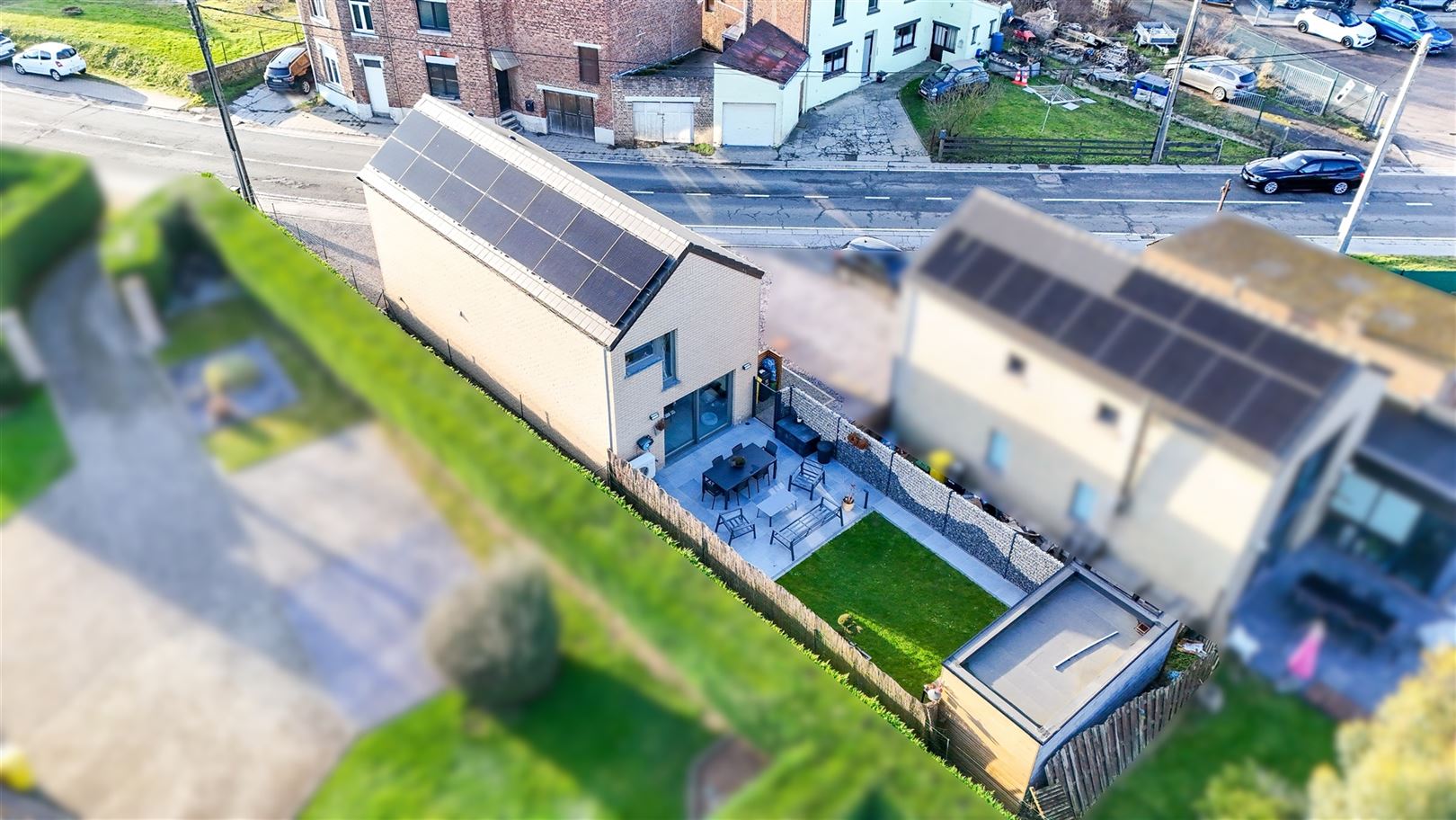 Caractéristiques techniques : PEB A+, châssis PVC double vitrage, chauffage par le sol et eau chaude via pompe à chaleur, 14 panneaux photovoltaïques, micro-station d’épuration, système d’alarme, borne de recharge pour véhicule et citerne d’eau de pluie.