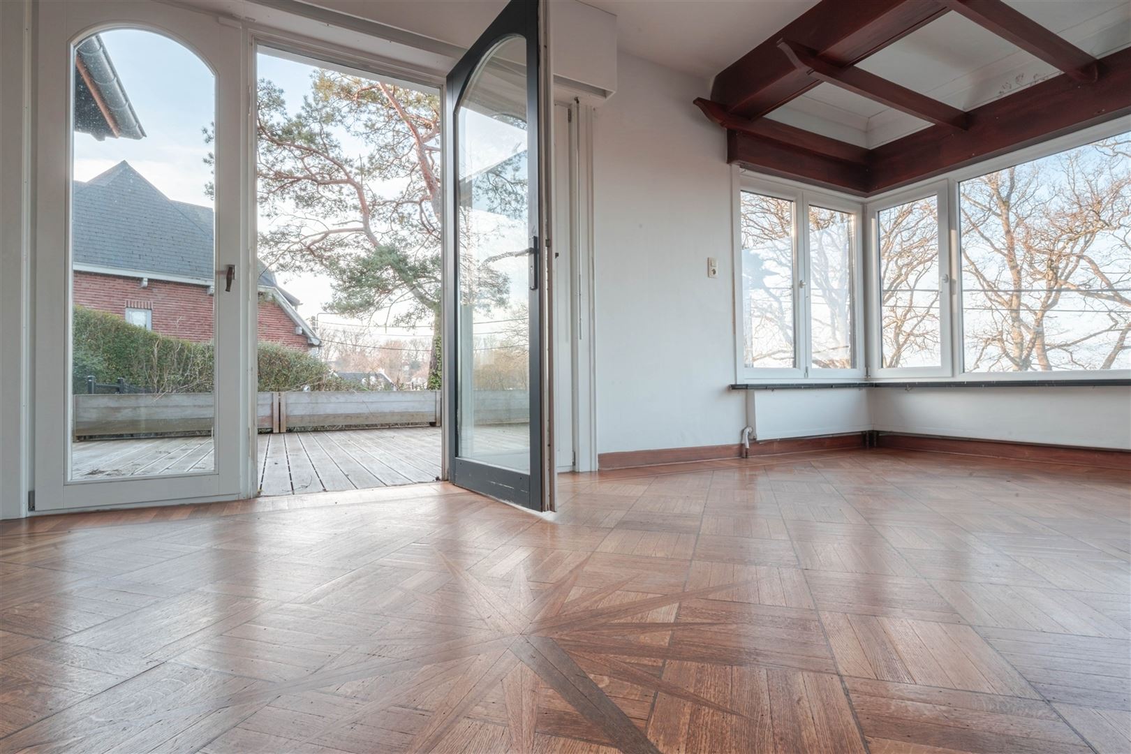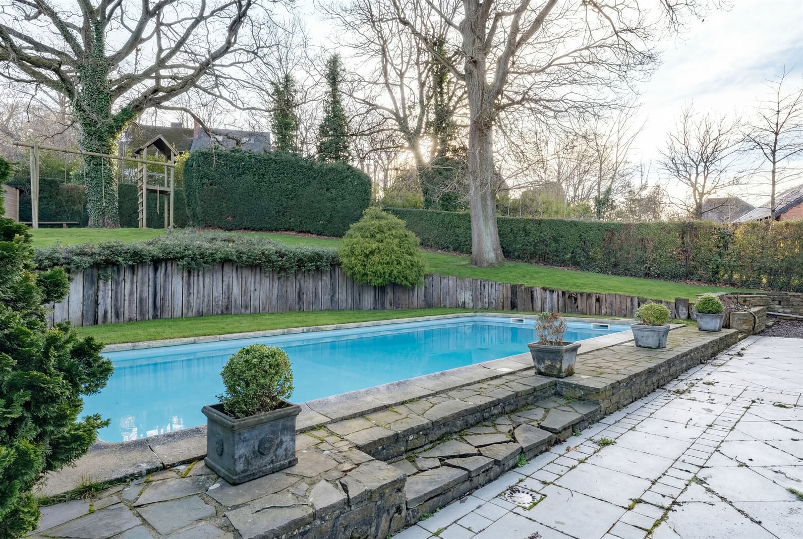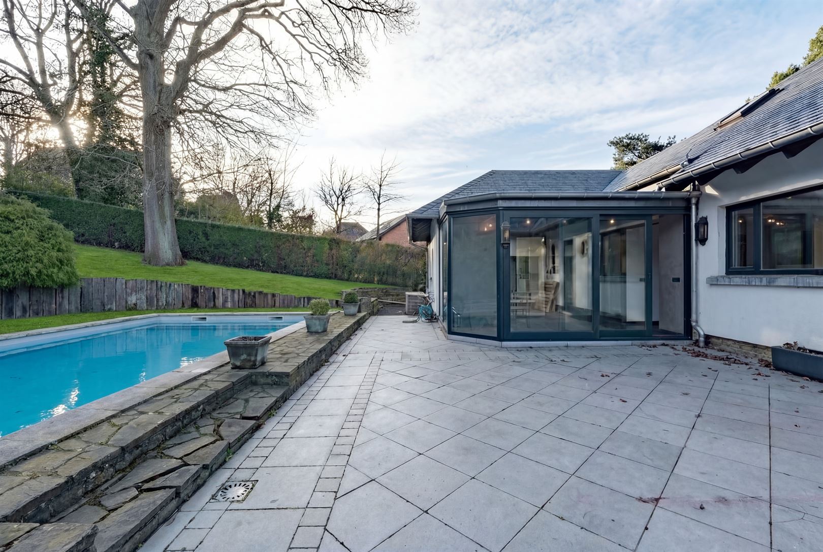 À l’extérieur : une vaste terrasse et un jardin clôturé orienté sud-est, une piscine chauffée via pompe à chaleur, une seconde terrasse à l’avant de 28 m² ainsi qu’un abri de jardin.