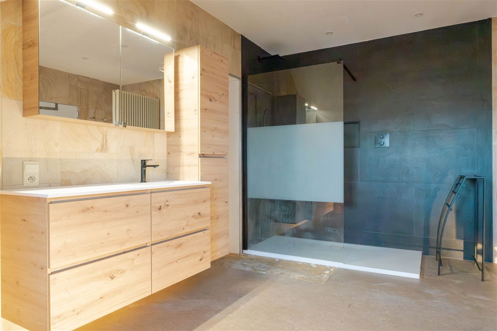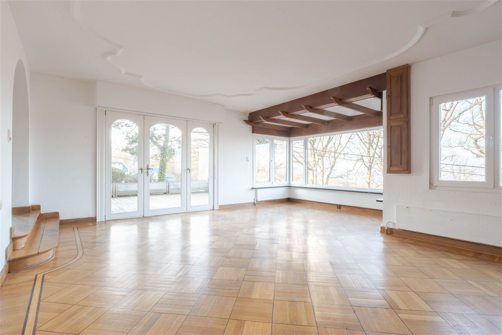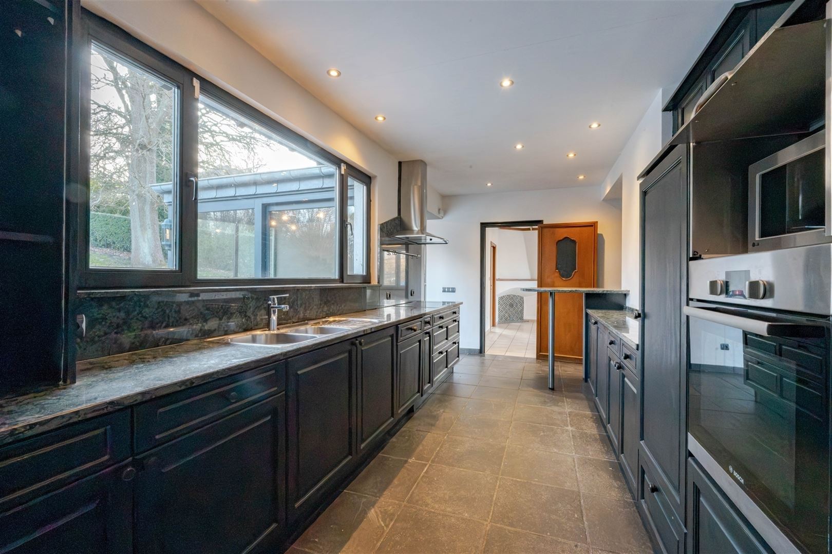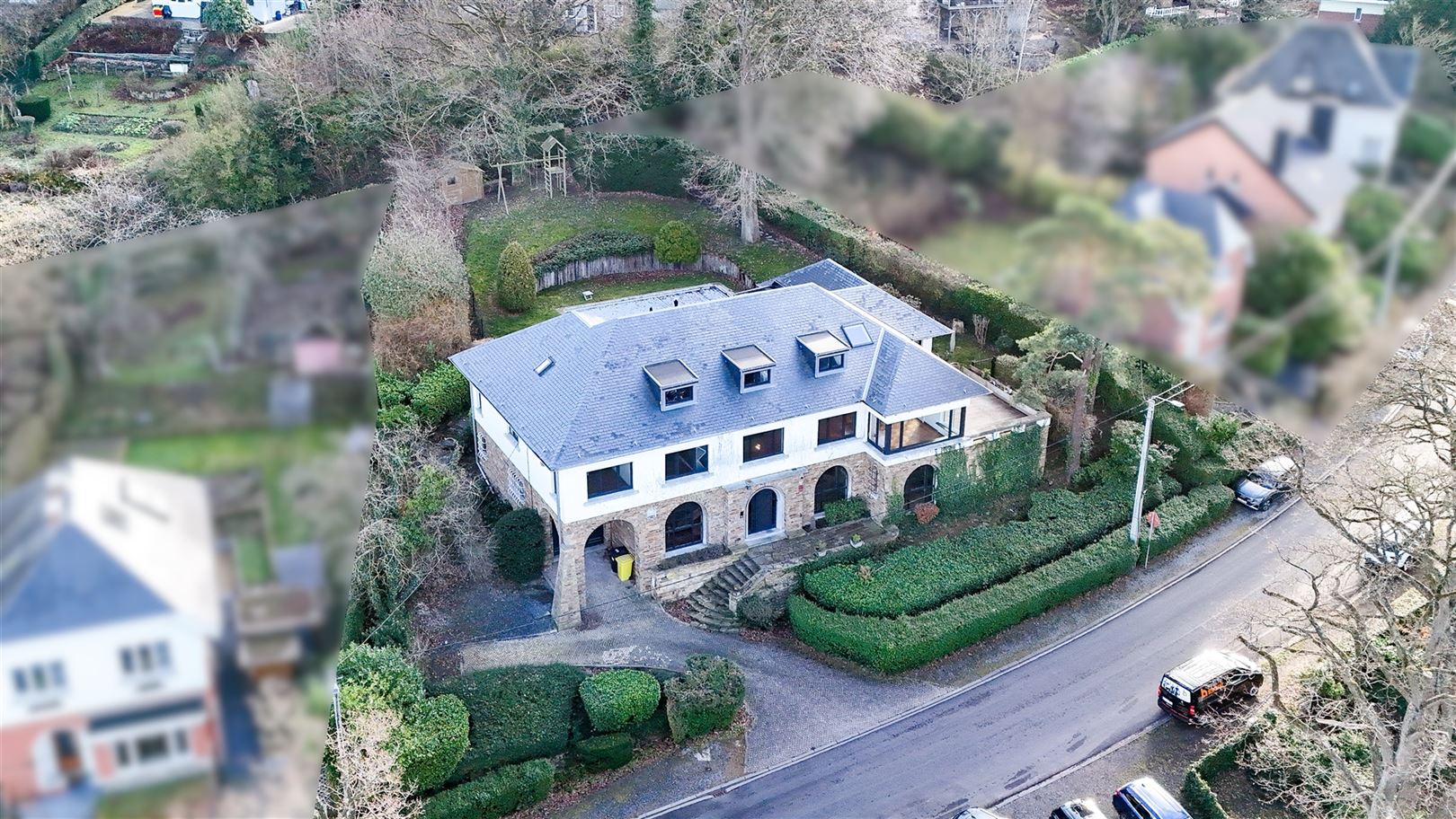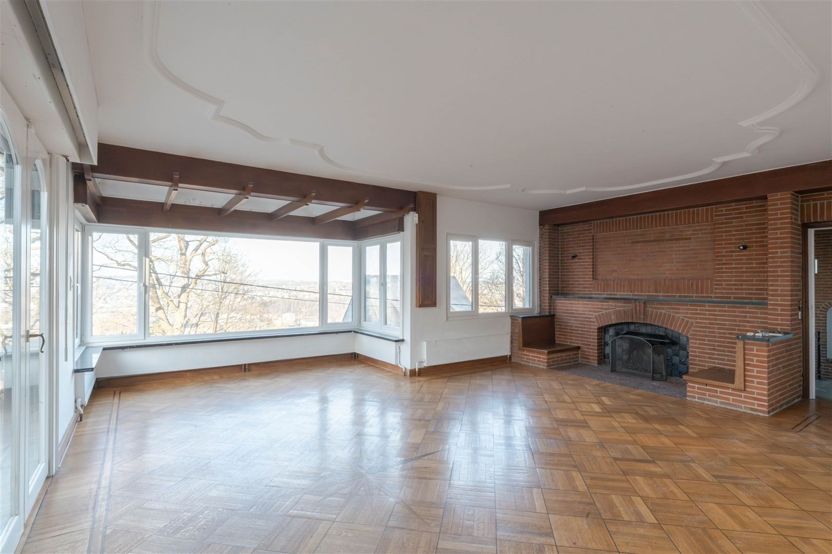 Au rez-de-jardin : un splendide séjour de 40 m² équipé de matériaux de qualité et offrant une vue exceptionnelle sur la ville, une lumineuse salle à manger, une cuisine entièrement équipée, une buanderie, 4 agréables chambres (+/- 19 m², 13 m², 15 m² et 12 m²), une salle de douche et une toilette indépendante.