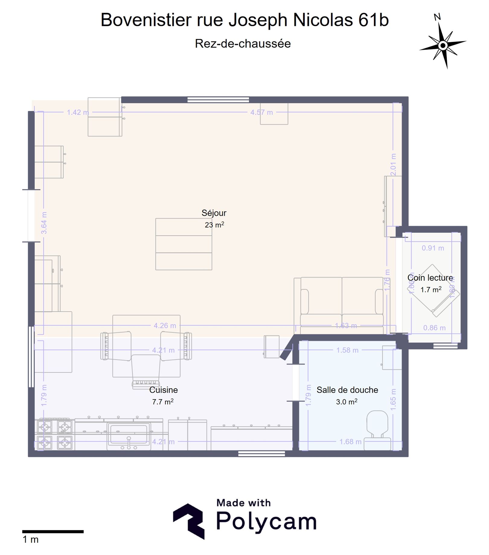 Au rez-de-chaussée : un vaste et lumineux séjour de 32 m² avec cuisine ouverte ainsi qu’une salle de douche.