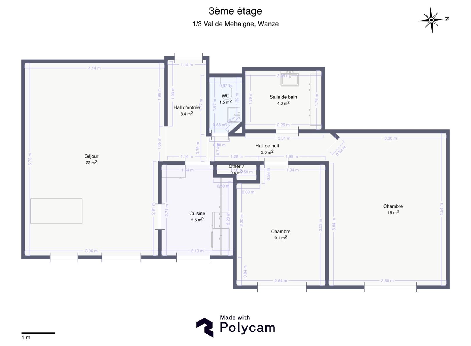 Au 3ème étage: un hall d’entrée avec WC indépendant, un lumineux séjour de 23 m², une cuisine, un hall de nuit desservant deux chambres confortables de 16 m² et 9 m², ainsi qu’une salle de bain.