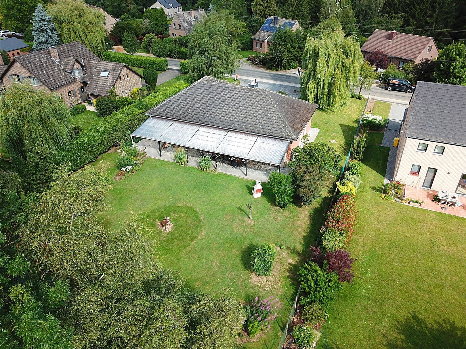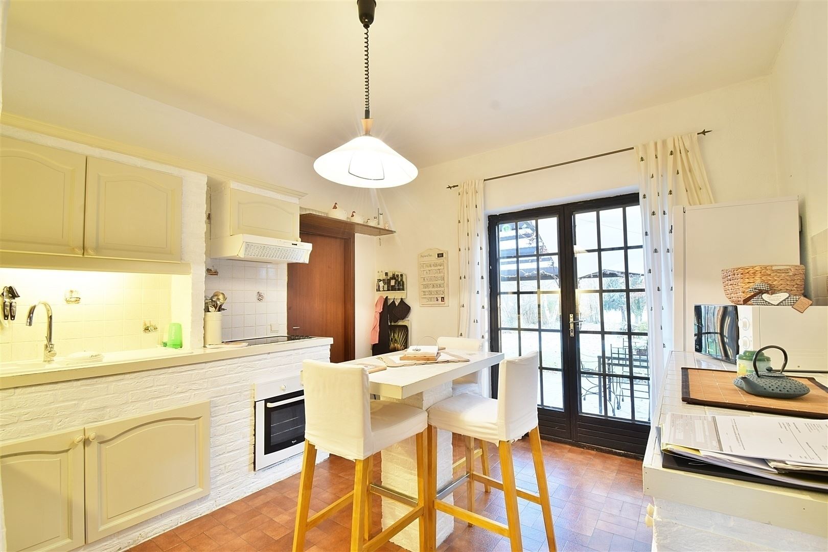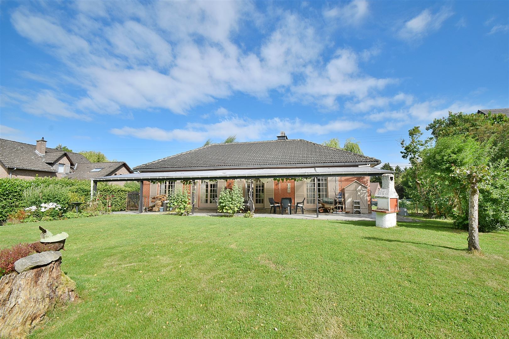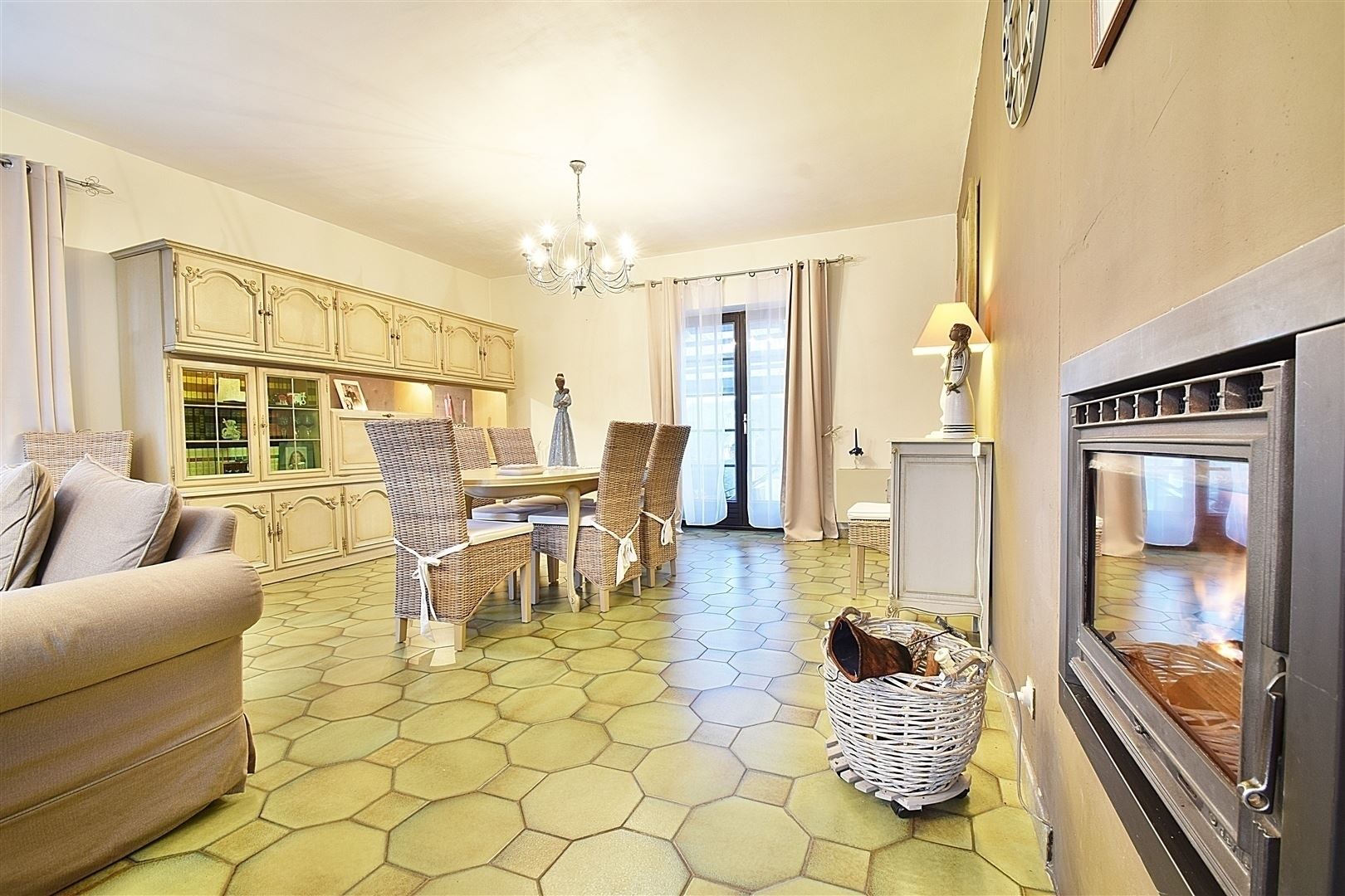 Rez-de-chaussée : Hall d'entrée avec toilette indépendante, un spacieux séjour de +/- 50 m² ouvert sur la salle à manger ave une K7 à bois, une cuisine entièrement équipée, 4 chambres dont une pouvant faire office de bureau et une salle de douche. Elle comprend également une grande terrasse et un beau jardin plat orientés SUD.