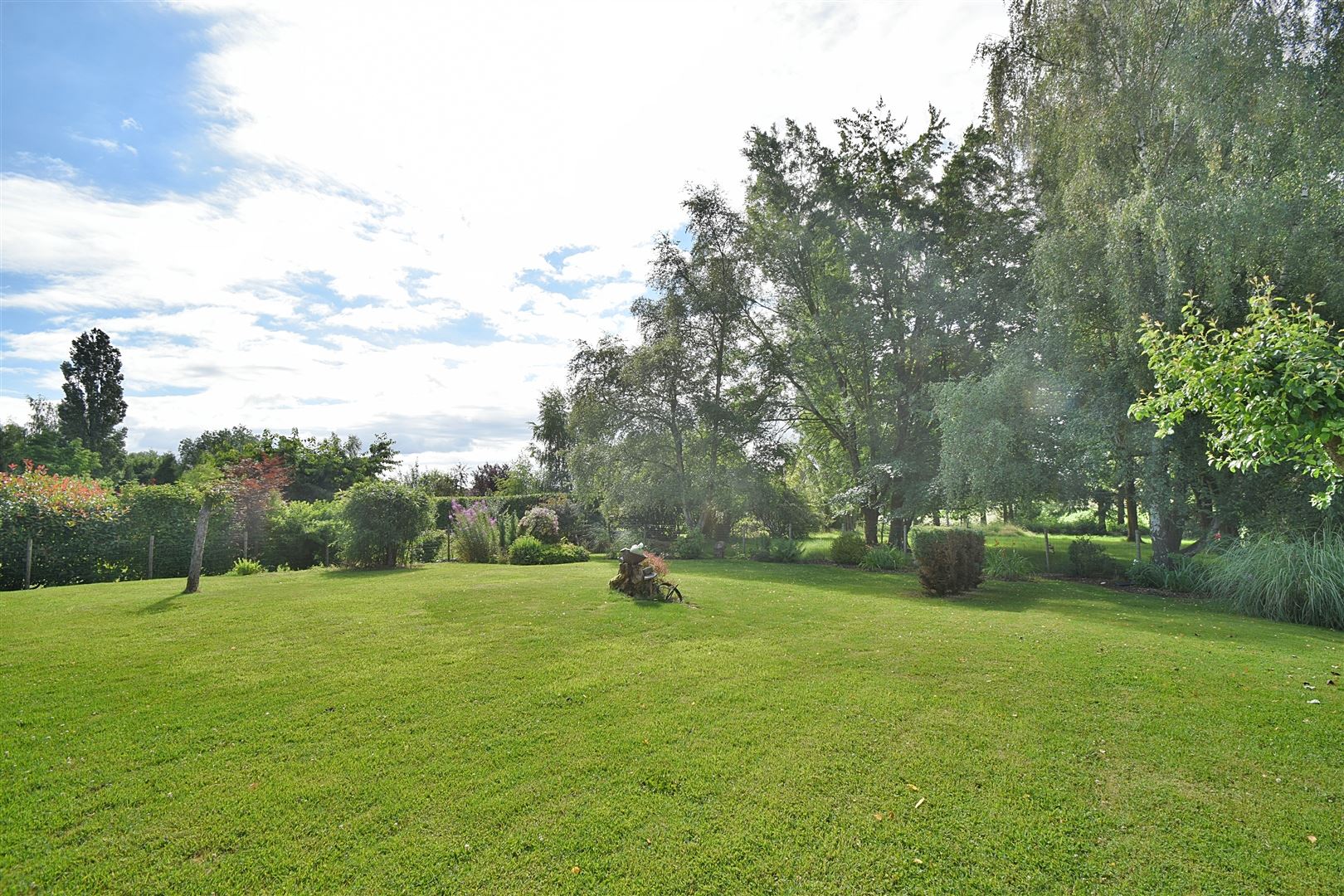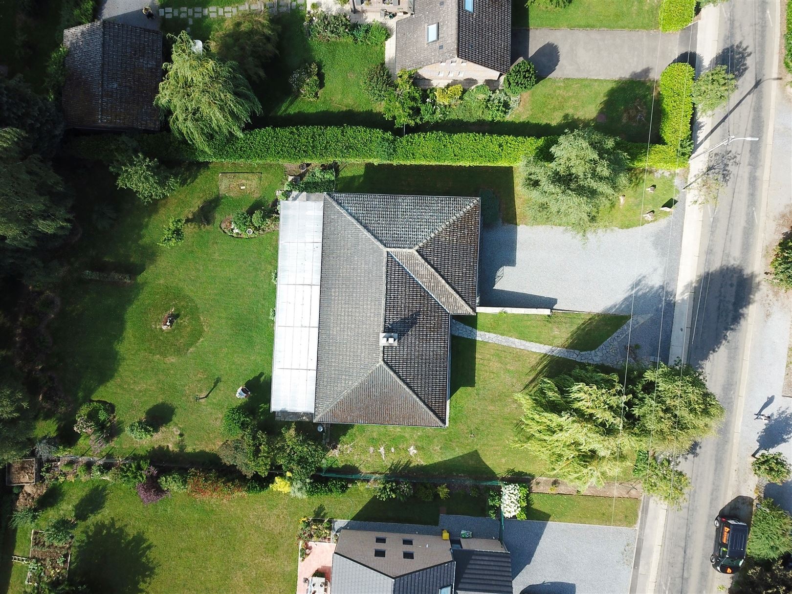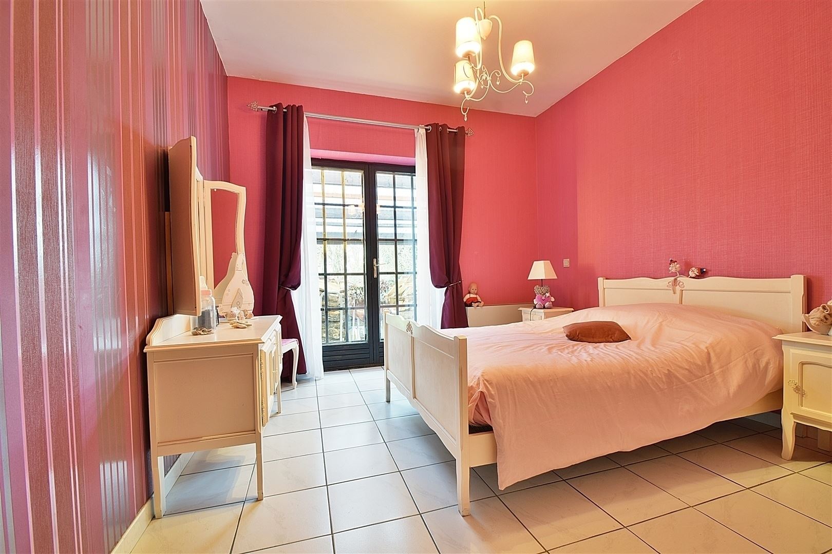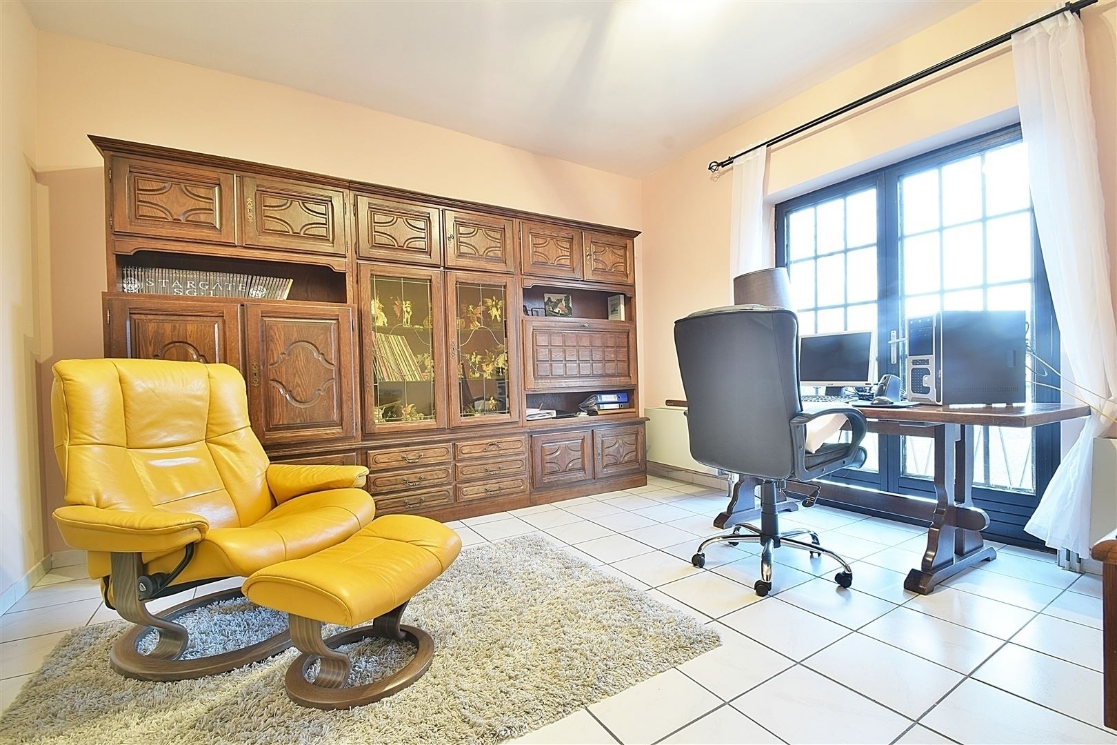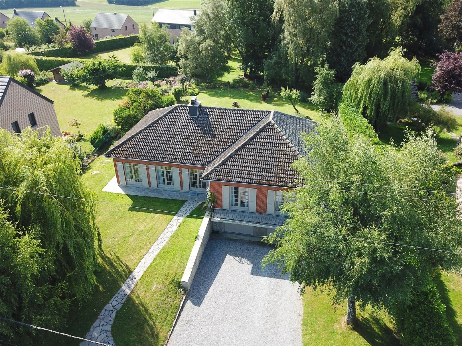 Rez-de-chaussée : Hall d'entrée avec toilette indépendante, un spacieux séjour de +/- 50 m² ouvert sur la salle à manger ave une K7 à bois, une cuisine entièrement équipée, 4 chambres dont une pouvant faire office de bureau et une salle de douche. Elle comprend également une grande terrasse et un beau jardin plat orientés SUD.