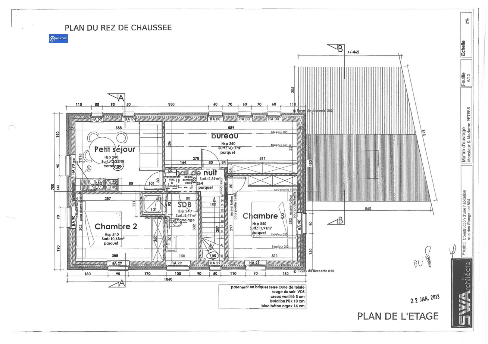 1er étage : Hall de nuit, salle de douche, trois chambres et un petit salon avec cuisine.