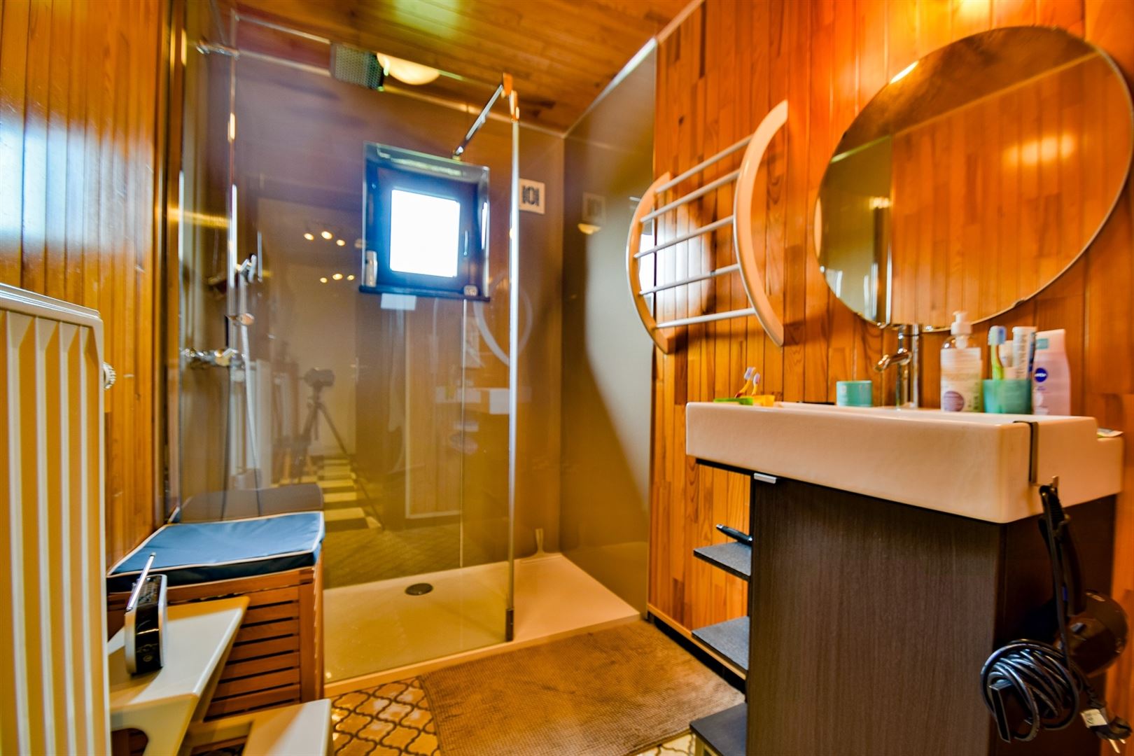 A l'entre-sol: deux agréables chambres ( +/-12m² et 10m²) et la salle-de-douche.