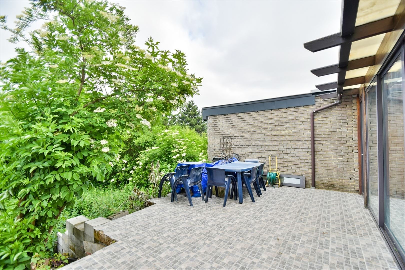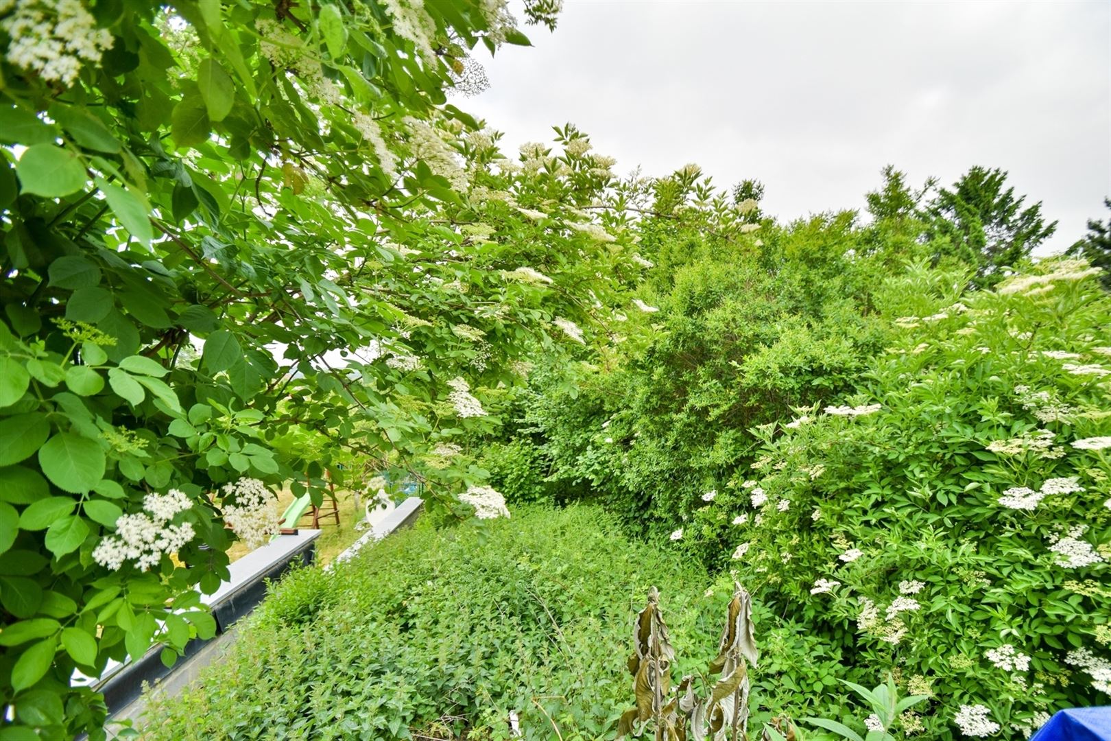 A l'extérieur: une superbe terrasse surplombant un jardin arboré orienté nord-ouest.