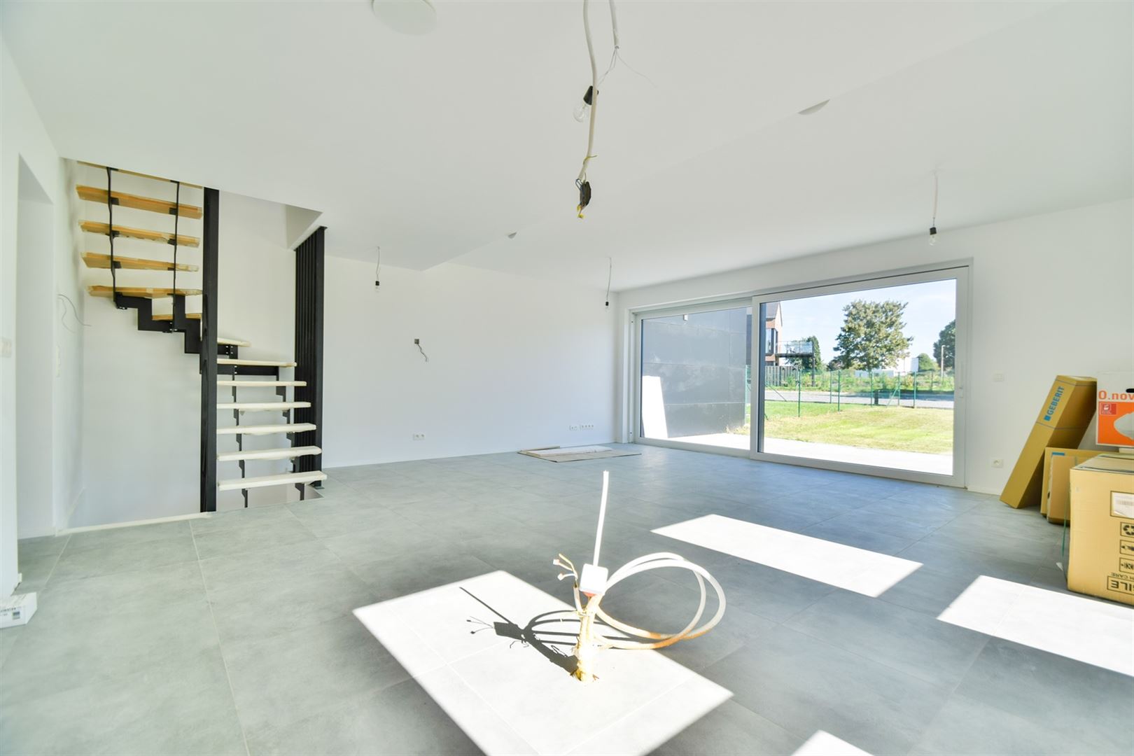 Au rez-de-jardin: un hall, un spacieux séjour ouvert sur la cuisine d'environ 43 m² offrant l'accès à la terrasse de +/- 15m², une chambre, une buanderie et une toilette indépendante.