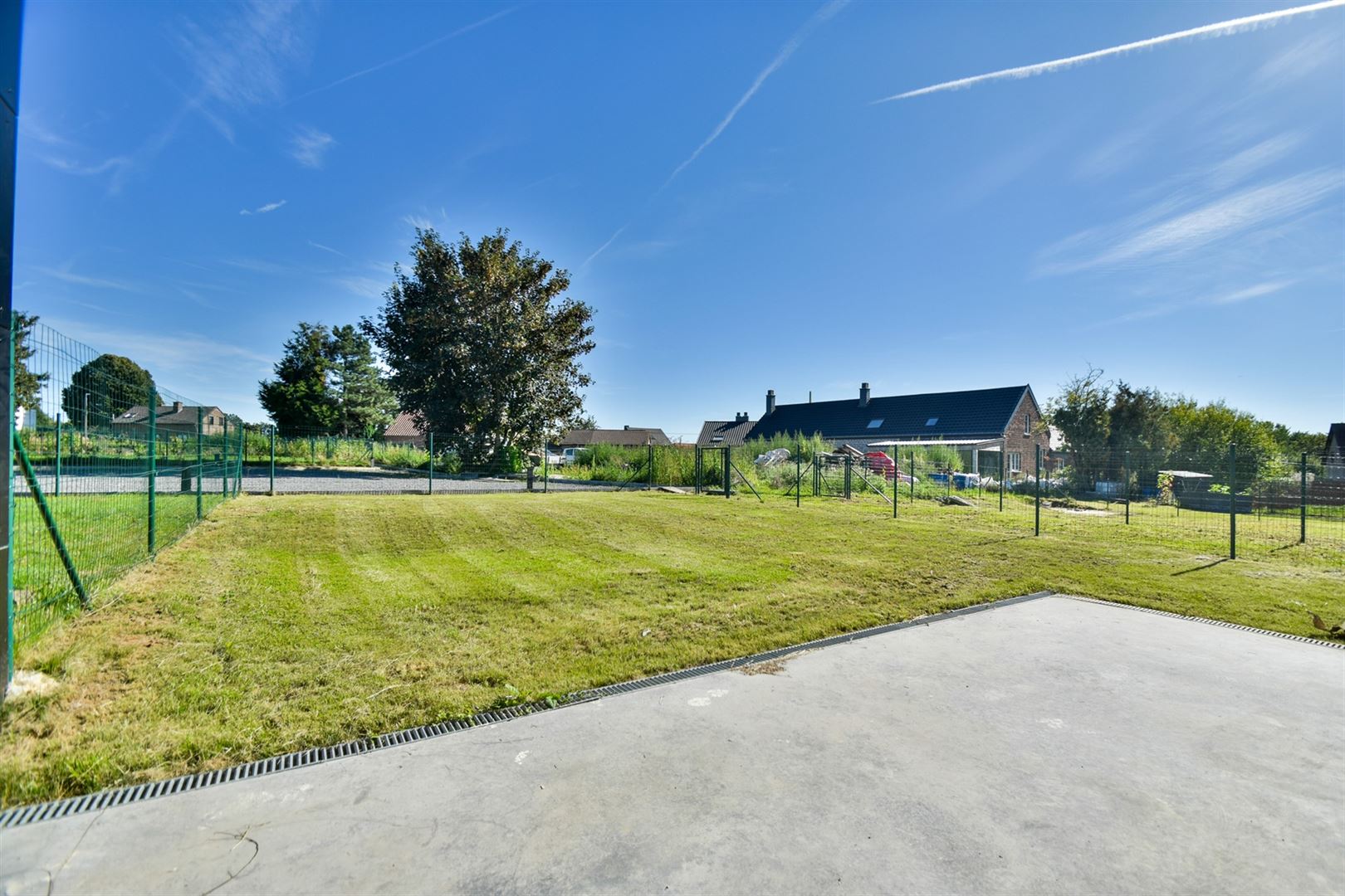 A l'extérieur: un agréable jardin devancé par une terrasse en béton lissé.