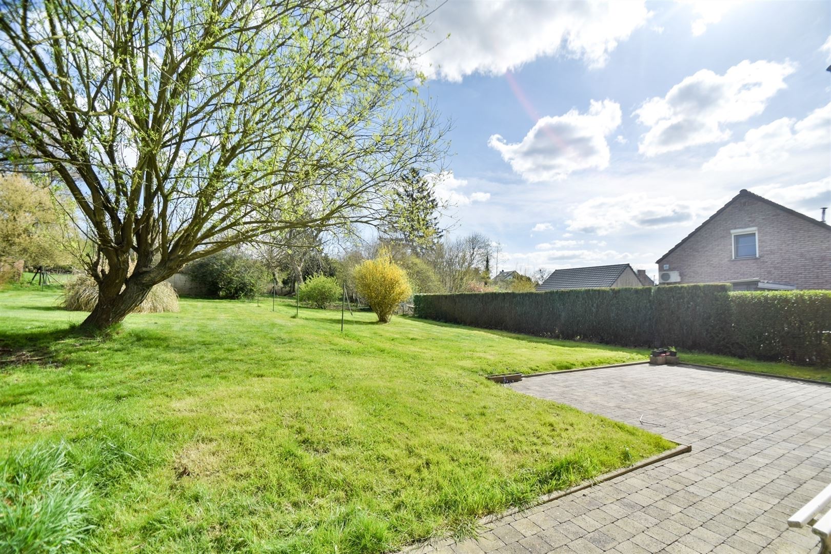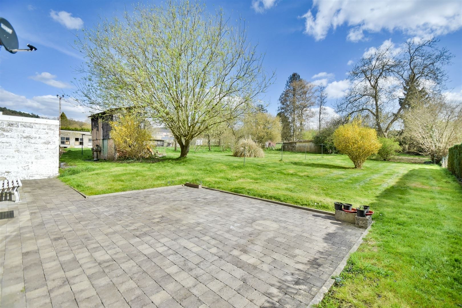 A l'extérieur: terrasse de 30 m², vaste jardin de +- 13 ares idéalement orienté Sud-Est ainsi qu'une remise de 30 m².