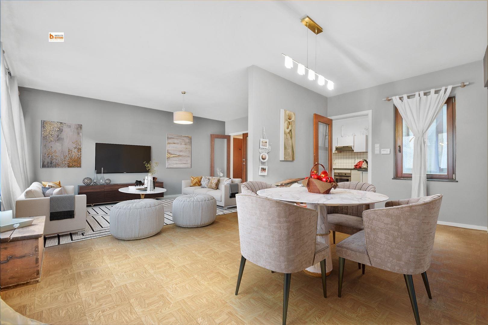 Hall d'entrée avec vestiaire, séjour ouvert sur la salle à manger (Photos Home staging) et donnant sur une cuisine semi-équipée, une spacieuse chambre de +/- 21 m2 et une deuxième chambre, une salle de bain avec lavabo sur meuble, une toilette indépendante et un débarras. Il comprend également une terrasse, très bien orientée de +/- 40 m2, très RARE en centre-ville !!