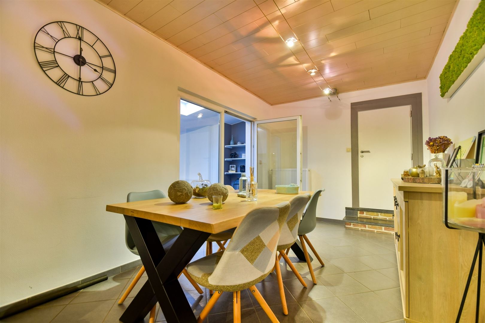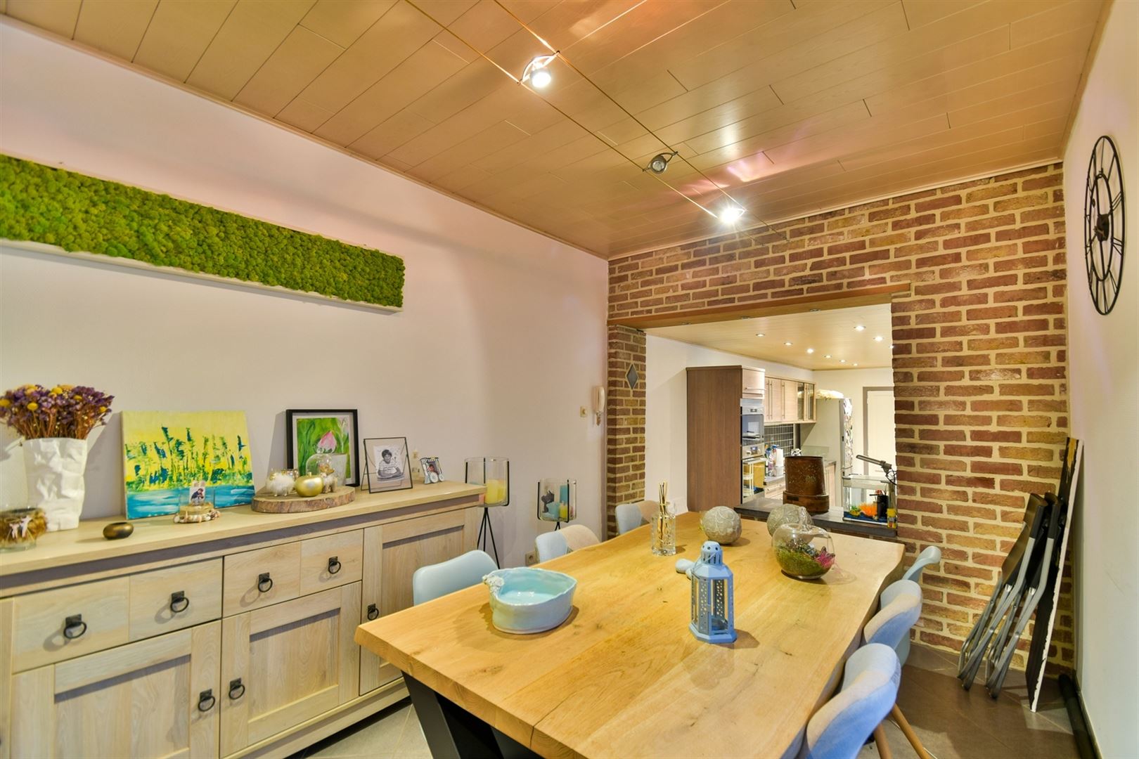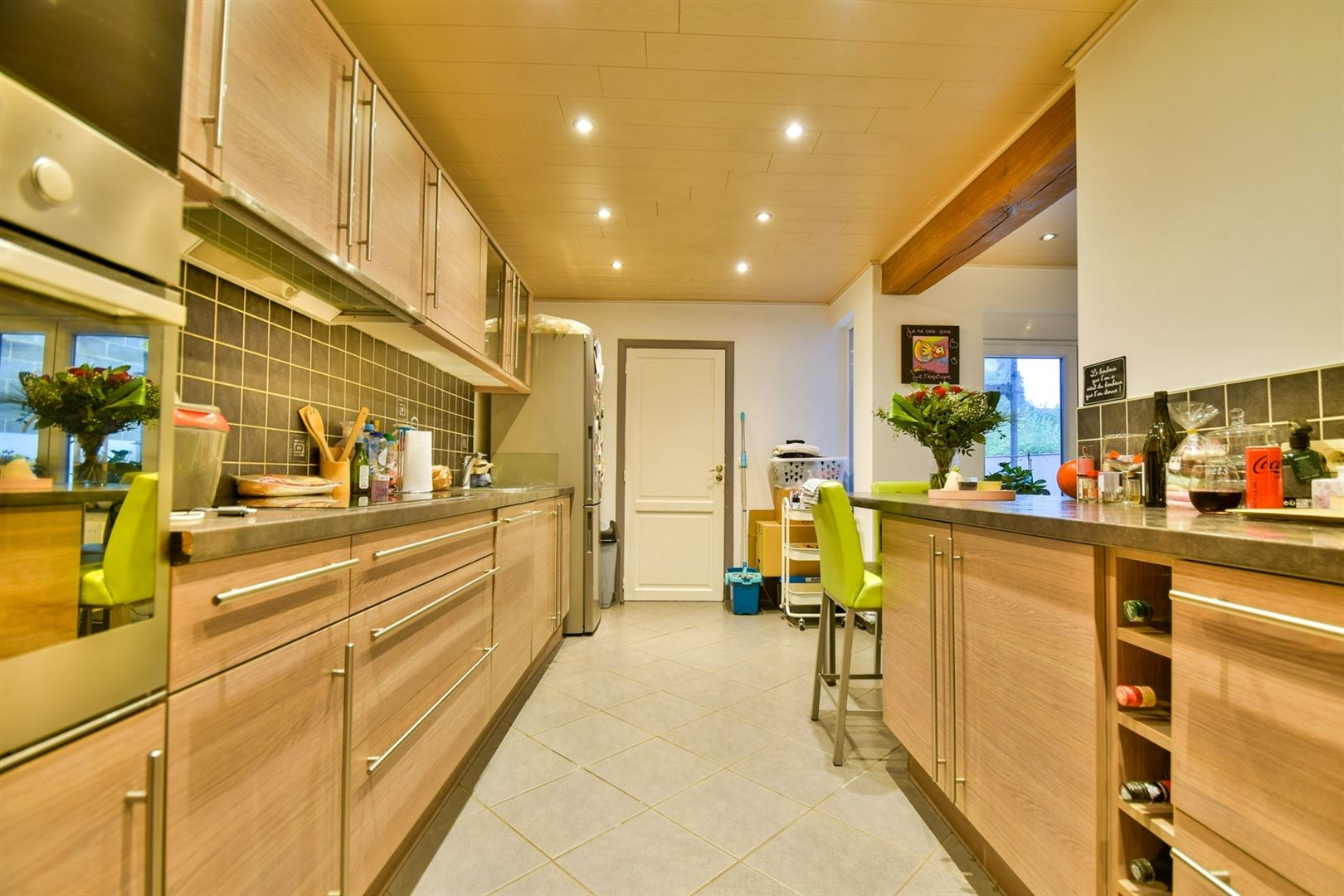 Au rez-de-chaussée: une salle-à-manger ouverte sur la cuisine hyper-équipée, un lumineux salon de 23m² proposant une cassette à bois et l'accès à la terrasse, une salle-de-bain et un espace buanderie.