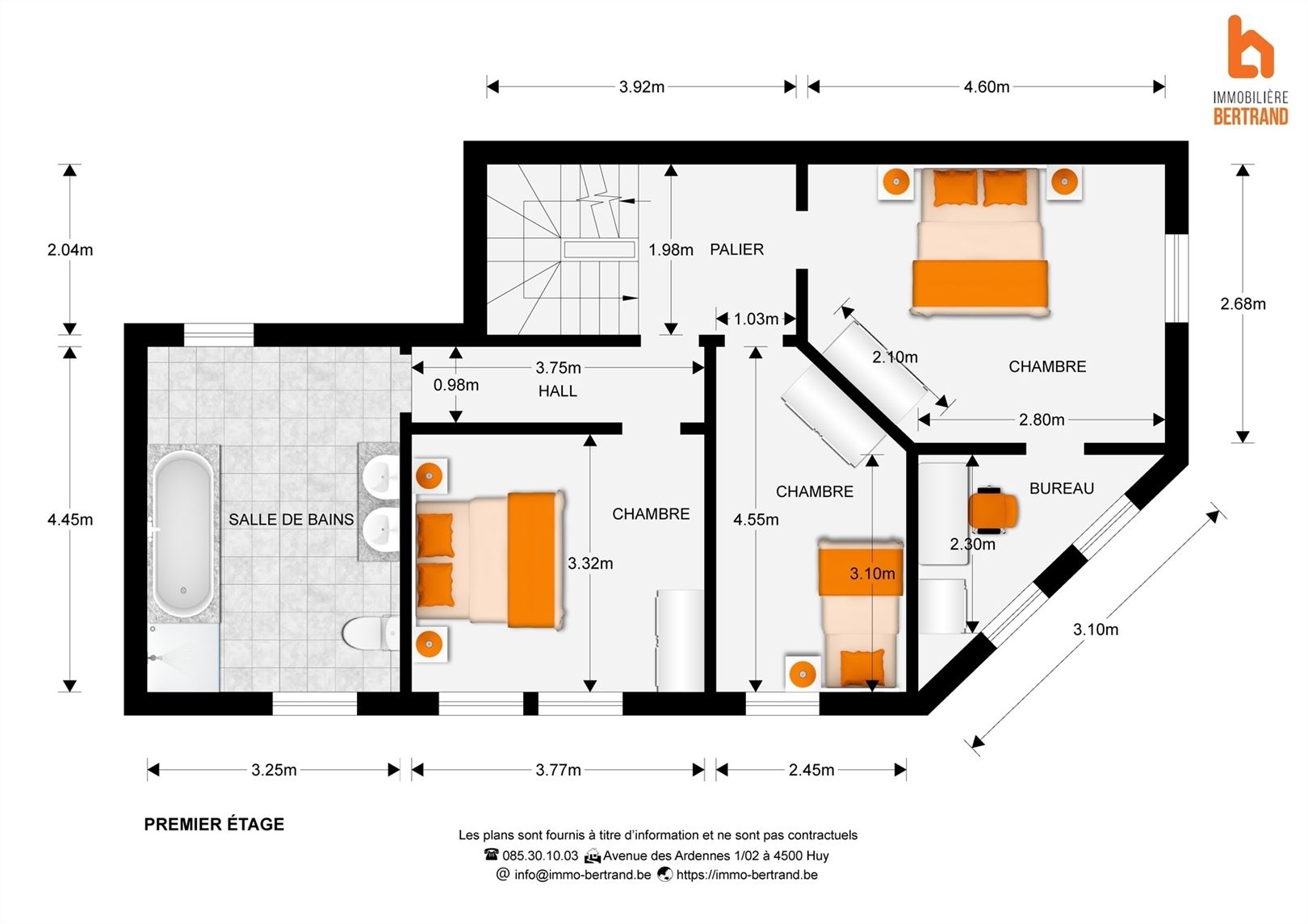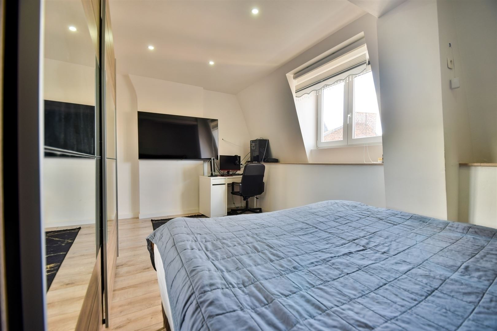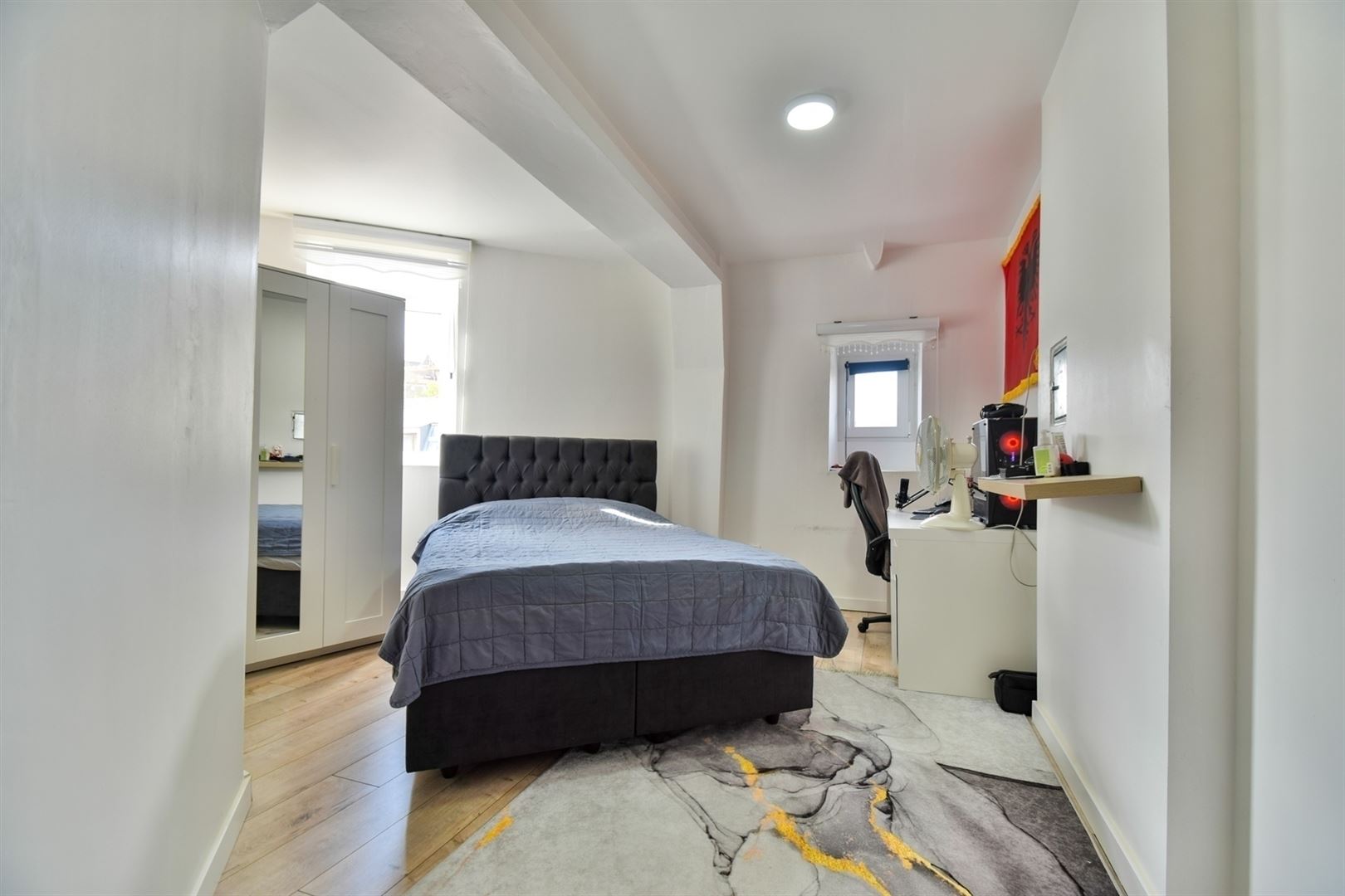 Au 1er étage: 3 agréables chambres (+/- 13m², 13m² et 11m²) dont une avec espace bureau et une salle de bain.