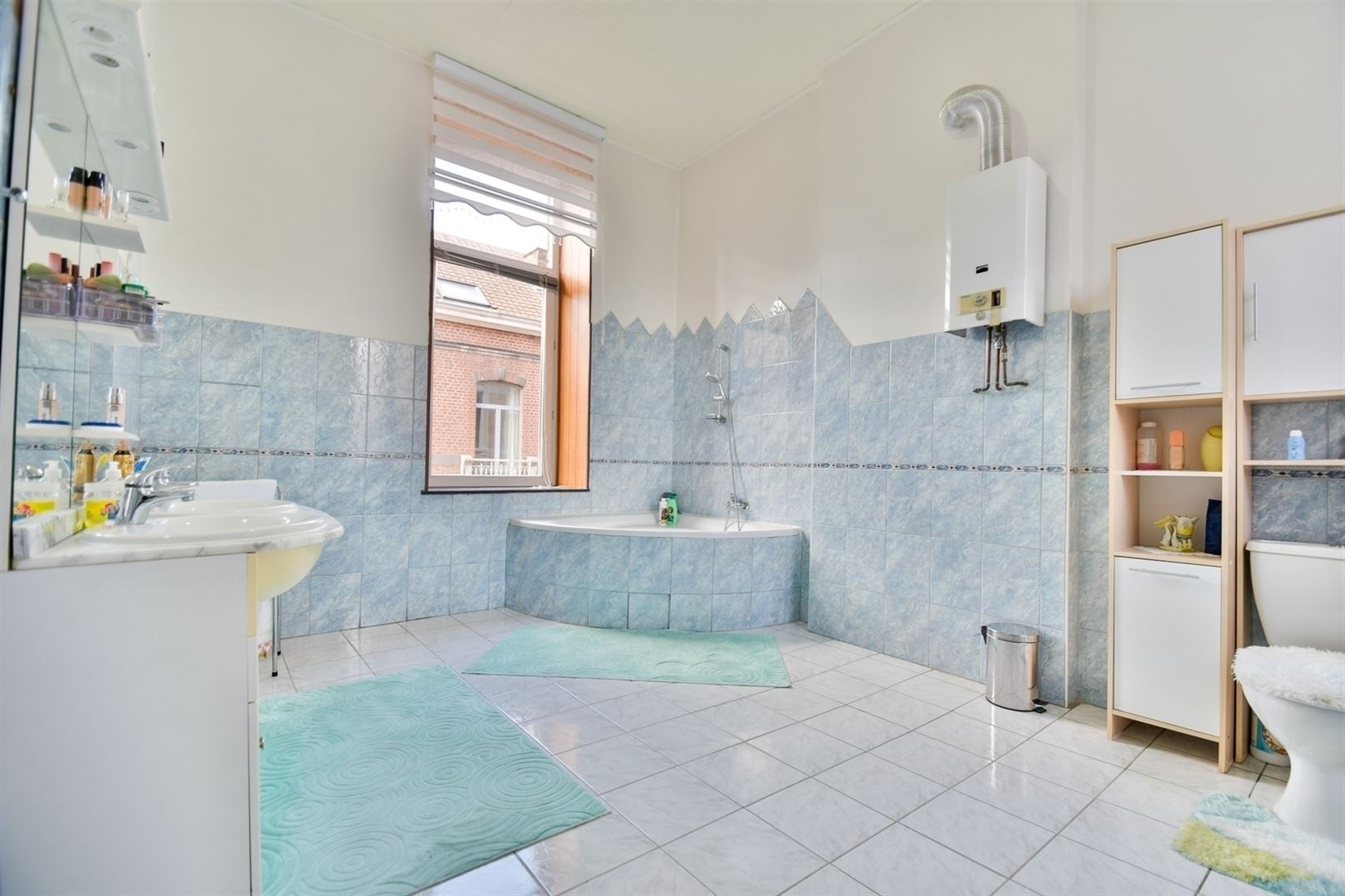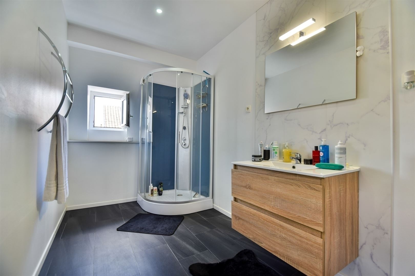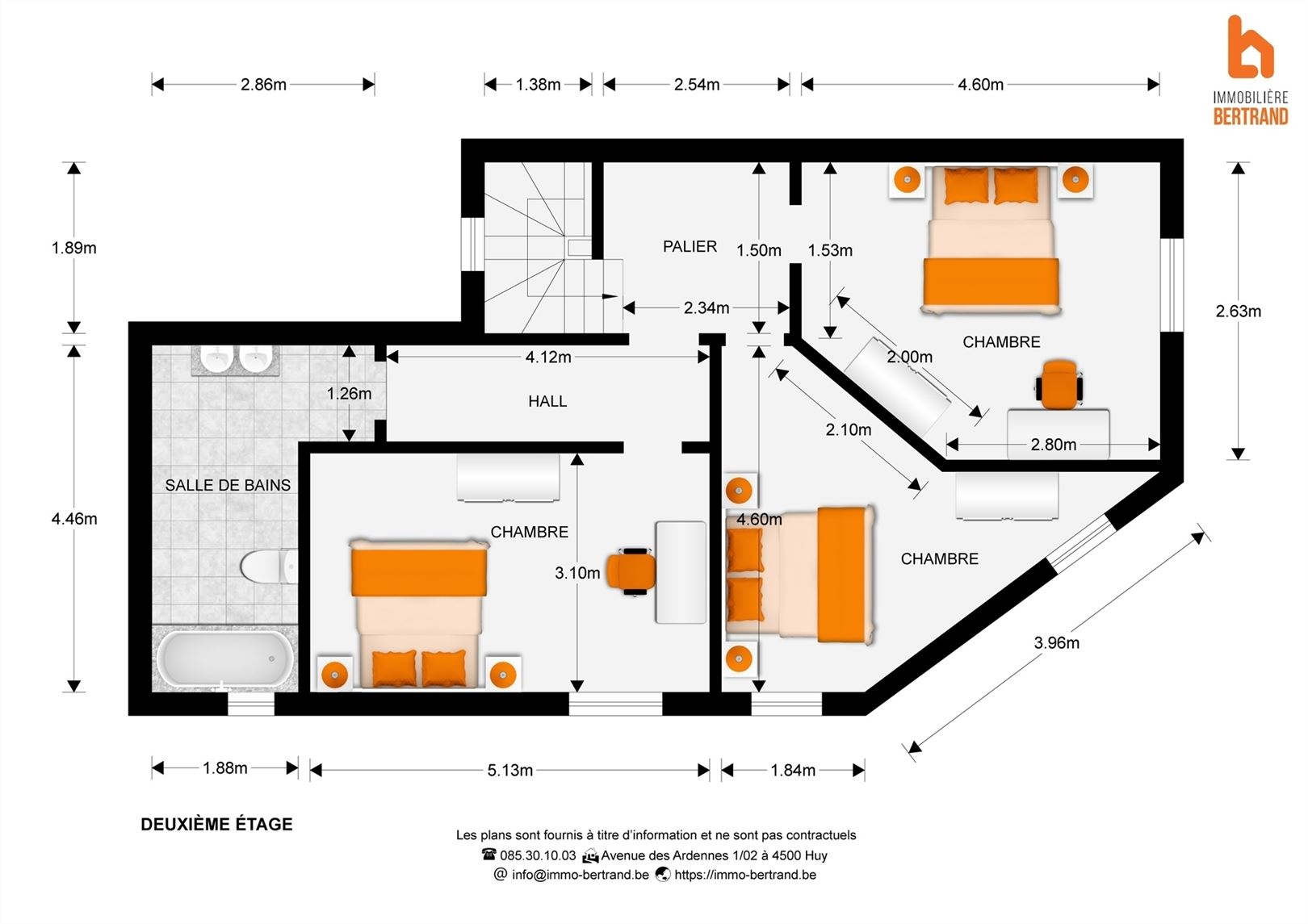 Au 1er étage: 3 agréables chambres (+/- 13m², 13m² et 11m²) dont une avec espace bureau et une salle de bain.