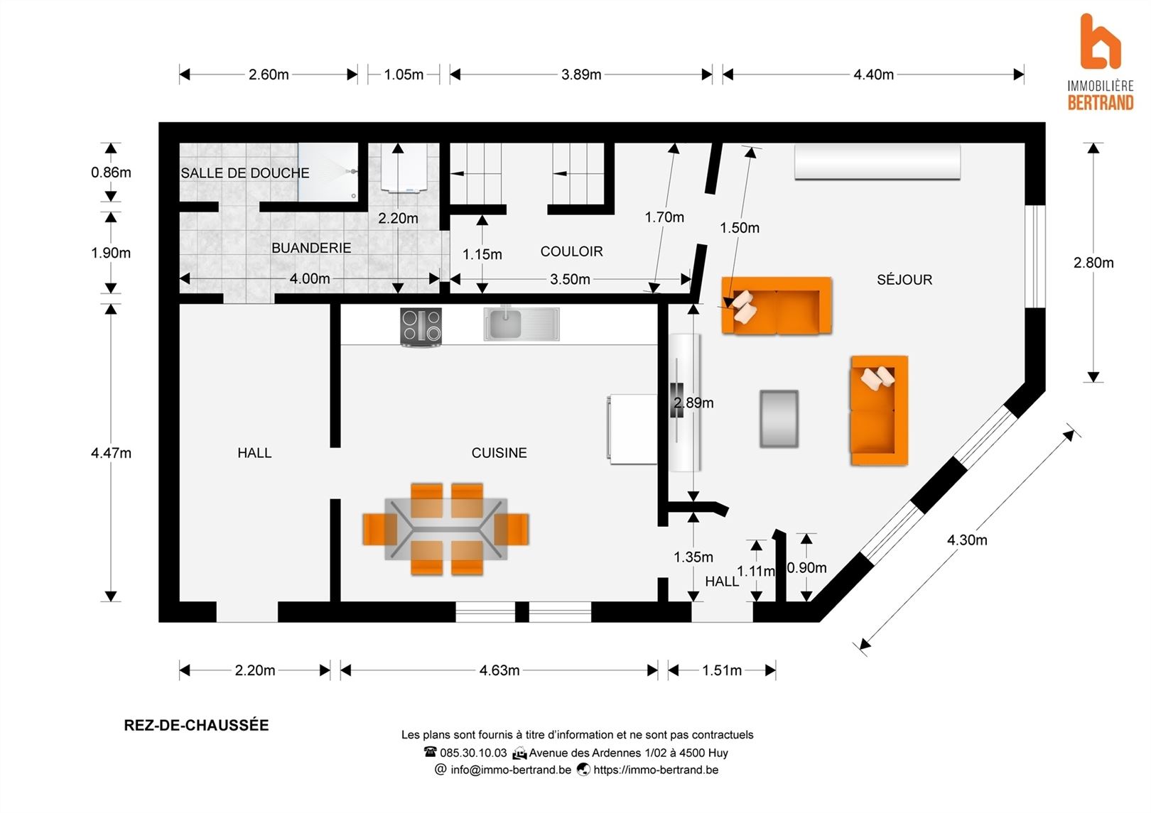 Au rez-de-chaussée: deux entrées indépendantes, un vaste et lumineux séjour de 30m², une salle-à-manger ouverte sur une cuisine équipée, une buanderie et une salle de douche.