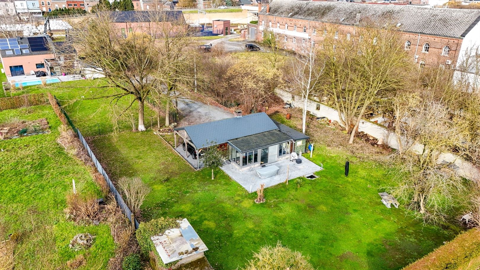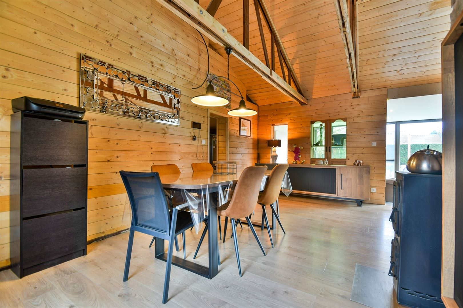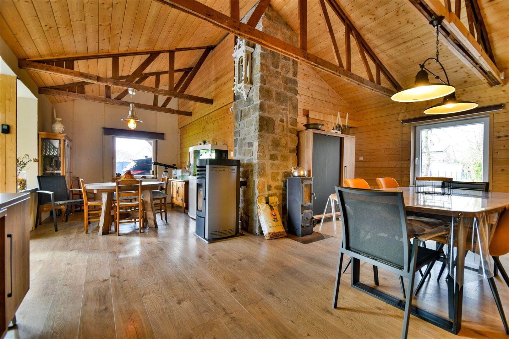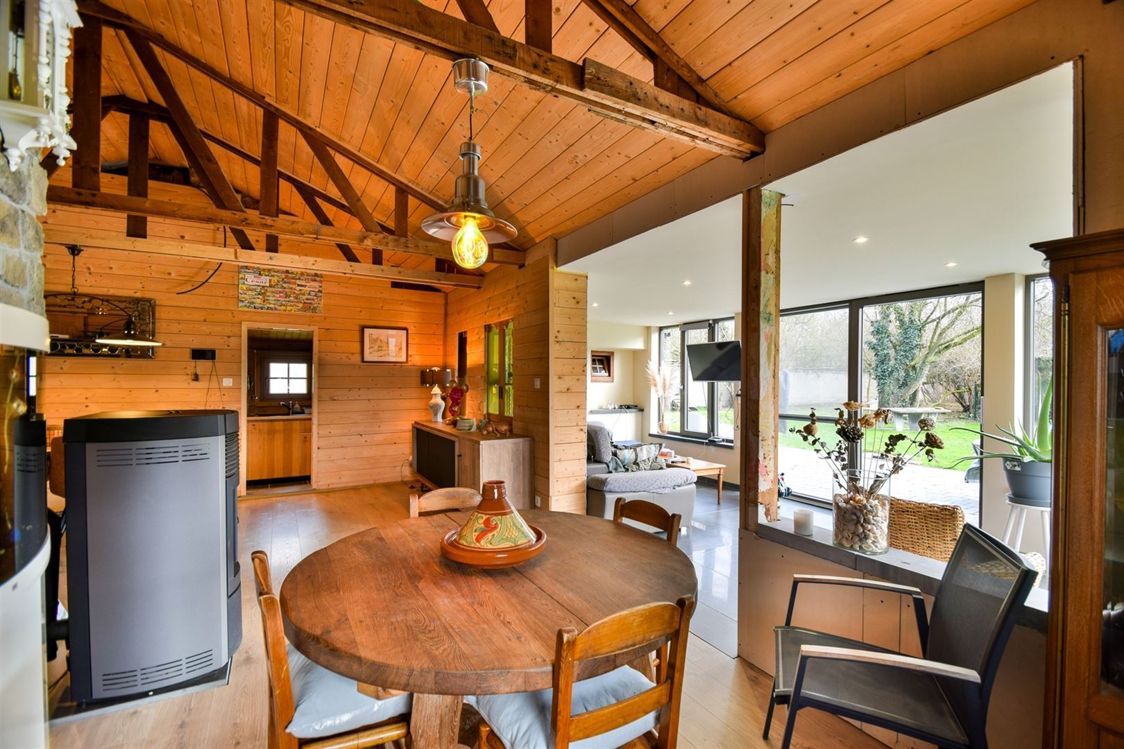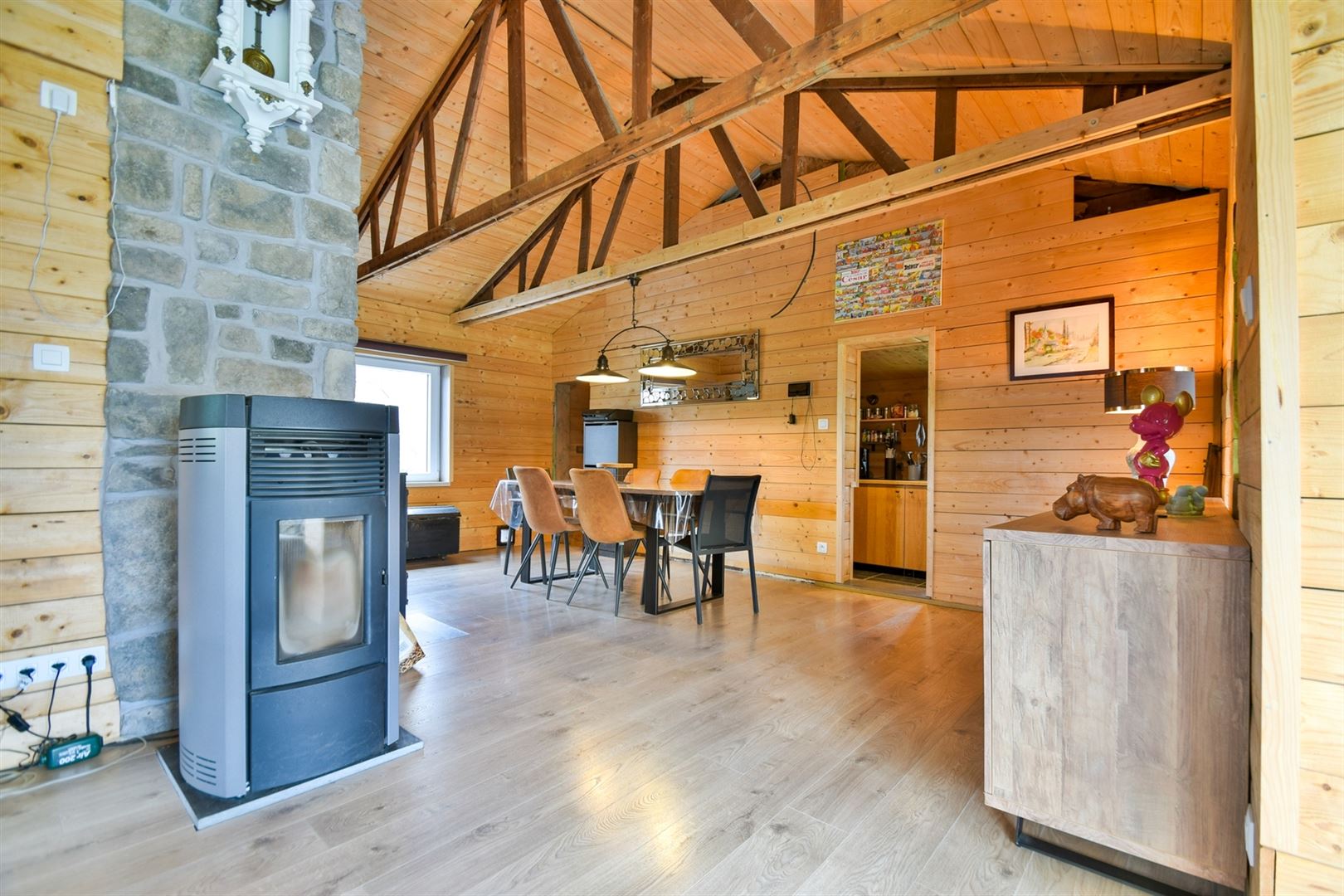 Caractéristiques techniques : châssis PVC double vitrage, chauffage via poêle à pellets, toiture en ardoises, PEB D.