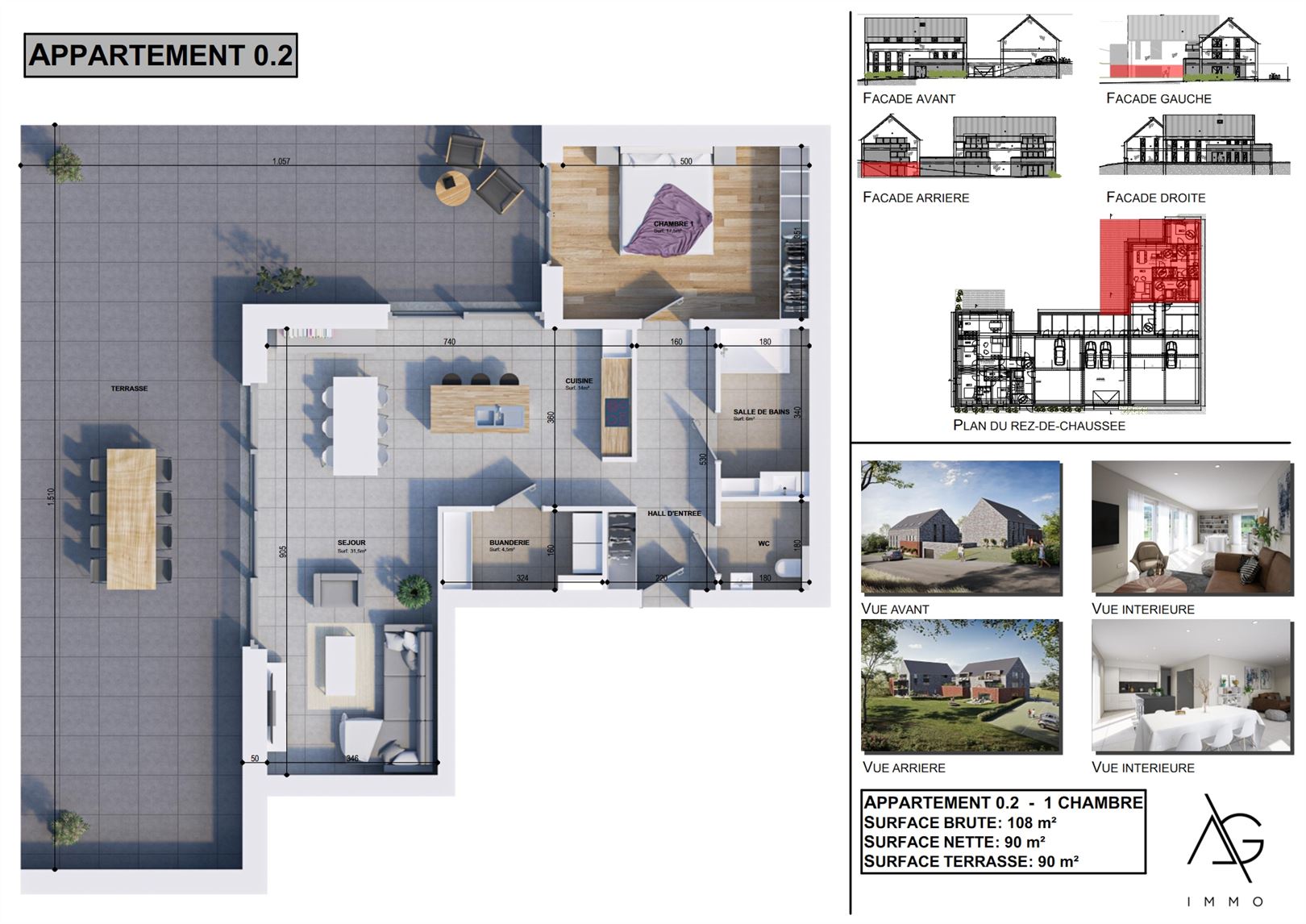 Situé au cœur du charmant village de Nandrin, cet appartement d'une chambre de 90 m², conçu pour être accessible aux personnes à mobilité réduite, offre une magnifique terrasse de 90 m² ainsi qu'un jardin privatif. L'agencement de l'appartement comprend un hall d'entrée avec des toilettes séparées et une salle de douche, un spacieux séjour avec une cuisine ouverte, une buanderie et une chambre. Les finitions sont de haute qualité, avec un ascenseur et une isolation thermique et acoustique soigneusement réalisée. Le prix comprend une cuisine entièrement équipée ainsi que des revêtements de sol en carrelage et/ou parquet. Il est également possible d'acheter une cave et un emplacement de parking, intérieur ou extérieur, en supplément. Le paiement est prévu à la livraison, qui est estimée pour 2026. La vente est soumise à la TVA de 21%