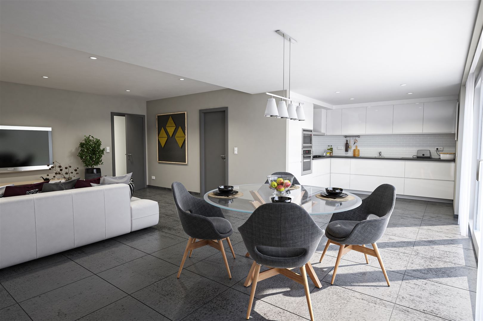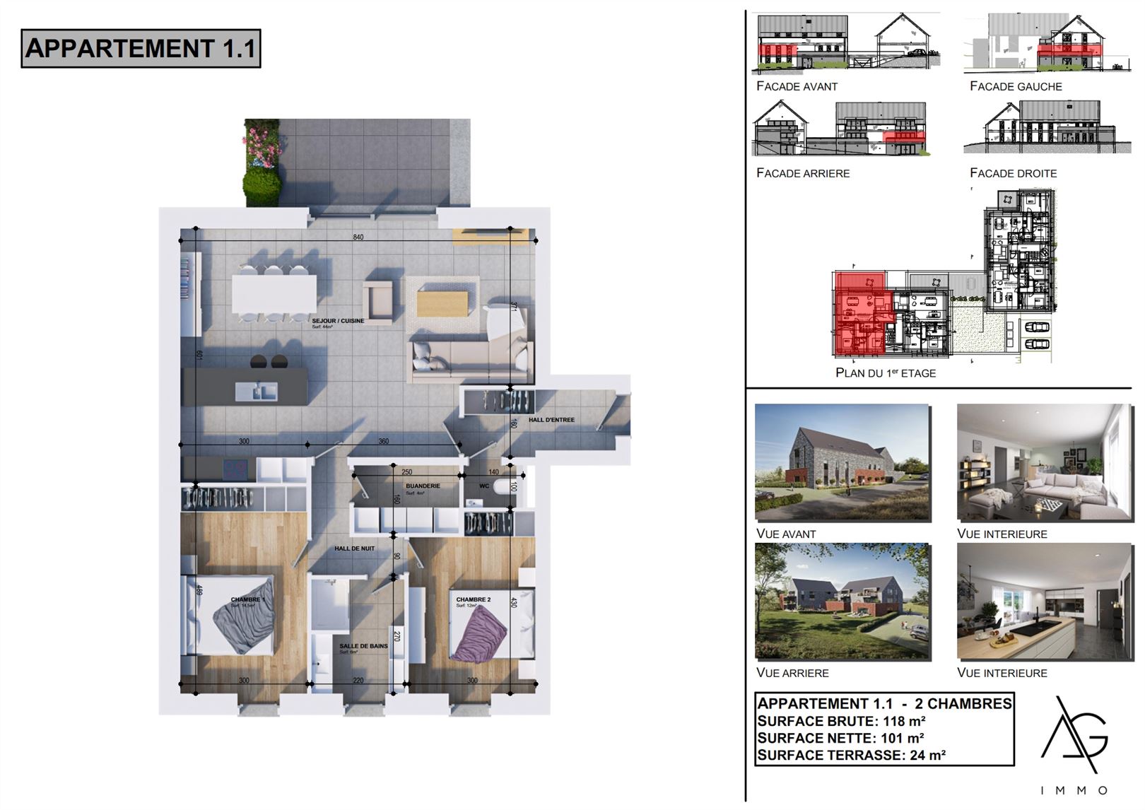 Situé au cœur du charmant village de Nandrin, appartement 2 chambres de 101 m² situé au 1er étage de la résidence avec une spacieuse terrasse de 24 m² . L'agencement de l'appartement comprend un hall d'entrée avec des toilettes séparées un grand séjour avec cuisine ouverte, une arrière-cuisine, 2 chambres, une salle de douche et une buanderie. Les finitions sont de haute qualité, avec un ascenseur et une isolation thermique et acoustique soigneusement réalisée. Le prix comprend une cuisine entièrement équipée ainsi que des revêtements de sol en carrelage et/ou parquet. Il est également possible d'acheter une cave et un emplacement de parking, intérieur ou extérieur, en supplément. Le paiement est prévu à la livraison, qui est estimée pour 2026. La vente est soumise à la TVA de 21%