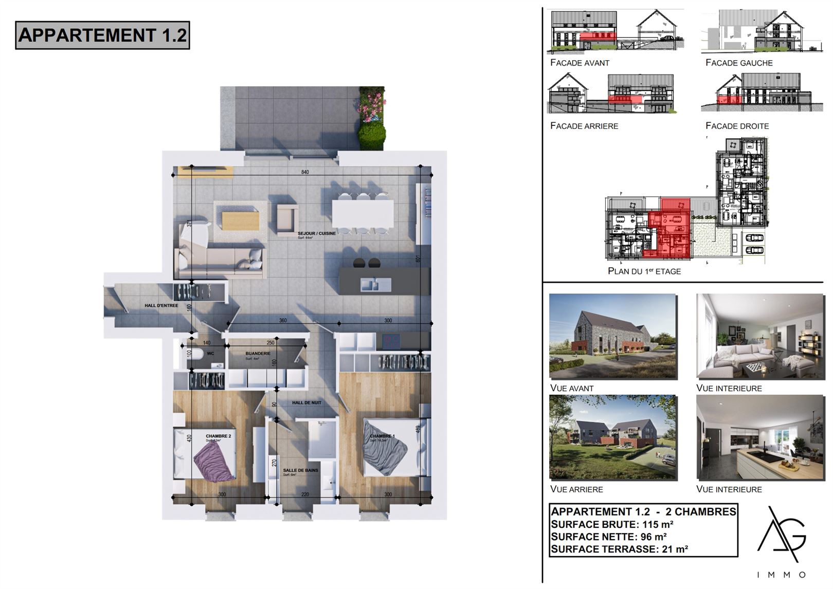 Situé au cœur du charmant village de Nandrin, appartement 2 chambres de 96 m² situé au 1er étage de la résidence avec une spacieuse terrasse de 20 m² . L'agencement de l'appartement comprend un hall d'entrée avec des toilettes séparées un grand séjour avec cuisine ouverte, une arrière-cuisine, 2 chambres, une salle de douche et une buanderie. Les finitions sont de haute qualité, avec un ascenseur et une isolation thermique et acoustique soigneusement réalisée. Le prix comprend une cuisine entièrement équipée ainsi que des revêtements de sol en carrelage et/ou parquet. Il est également possible d'acheter une cave et un emplacement de parking, intérieur ou extérieur, en supplément. Le paiement est prévu à la livraison, qui est estimée pour 2026. La vente est soumise à la TVA de 21%