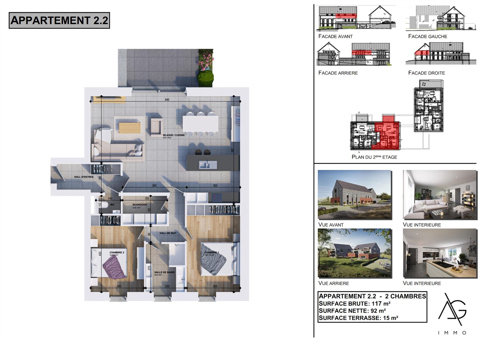 Situé au cœur du charmant village de Nandrin, appartement 2 chambres de 97 m² situé au 2e étage de la résidence avec une spacieuse terrasse de 15 m² . L'agencement de l'appartement comprend un hall d'entrée avec des toilettes séparées un grand séjour avec cuisine ouverte, une arrière-cuisine, 2 chambres, une salle de douche et une buanderie. Les finitions sont de haute qualité, avec un ascenseur et une isolation thermique et acoustique soigneusement réalisée. Le prix comprend une cuisine entièrement équipée ainsi que des revêtements de sol en carrelage et/ou parquet. Il est également possible d'acheter une cave et un emplacement de parking, intérieur ou extérieur, en supplément. Le paiement est prévu à la livraison, qui est estimée pour 2026. La vente est soumise à la TVA de 21%