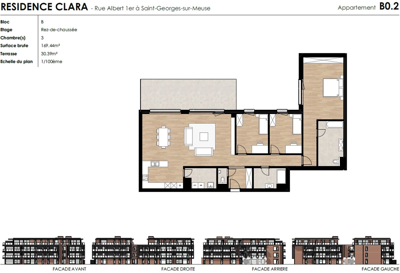 Situé au rez-de-chaussée du "Bloc B", ce bel appartement est composé d'un beau séjour ouvert sur la cuisine entièrement équipée et offrant l'accès à la terrasse de 30 m², 3 agréables chambres, une salle de douche, une salle de bain, une buanderie et une toilette indépendante. Caractéristiques techniques : PEB "A" annoncé, grandes ouvertures sur l'extérieur avec vue sur jardin, châssis aluminium triple vitrage, chauffage par le sol via pompe à chaleur individuelle air/eau, panneaux photovoltaïques, VMC double flux et ASCENSEUR.