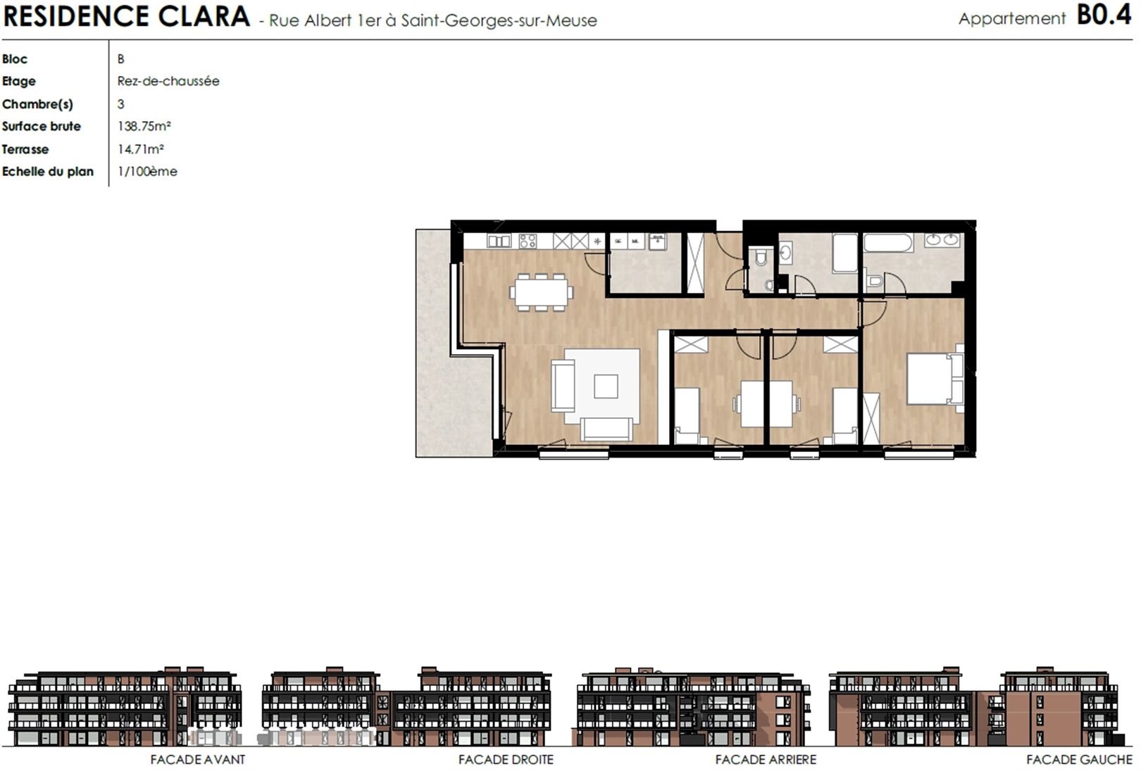 Situé au rez-de-chaussée du "Bloc B", ce bel appartement est composé d'un beau séjour ouvert sur la cuisine entièrement équipée et offrant l'accès à la terrasse de 14 m², 3 agréables chambres, une salle de douche, une salle de bain, une buanderie et une toilette indépendante. Caractéristiques techniques : PEB "A" annoncé, grandes ouvertures sur l'extérieur avec vue sur jardin, châssis aluminium triple vitrage, chauffage par le sol via pompe à chaleur individuelle air/eau, panneaux photovoltaïques, VMC double flux et ASCENSEUR.