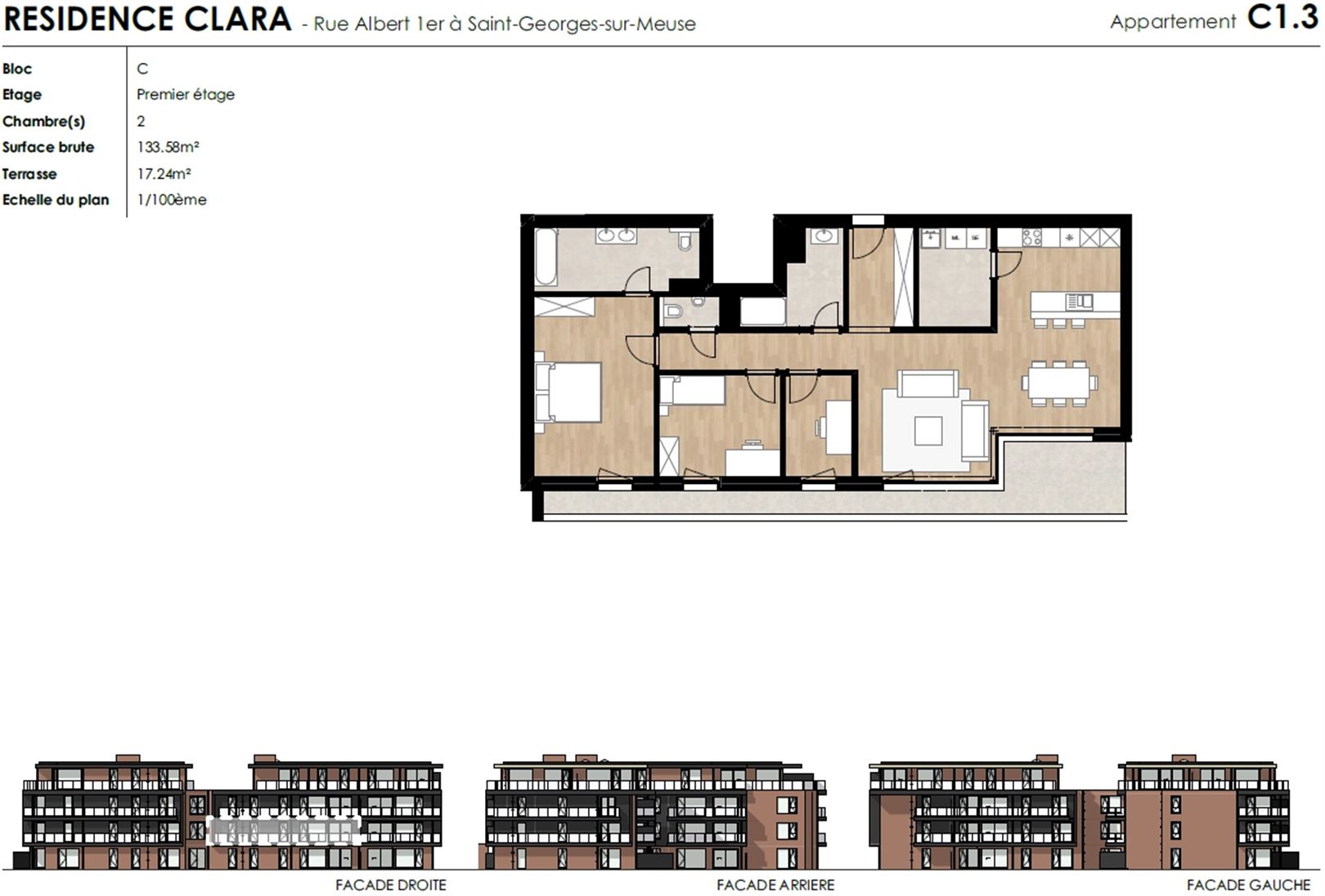 Situé au 1er étage du "Bloc C", ce bel appartement est composé d'un beau séjour ouvert sur la cuisine entièrement équipée et offrant l'accès à la terrasse de 17 m², 2 agréables chambres, un bureau, une salle de douche, une salle de bain, une buanderie et une toilette indépendante.