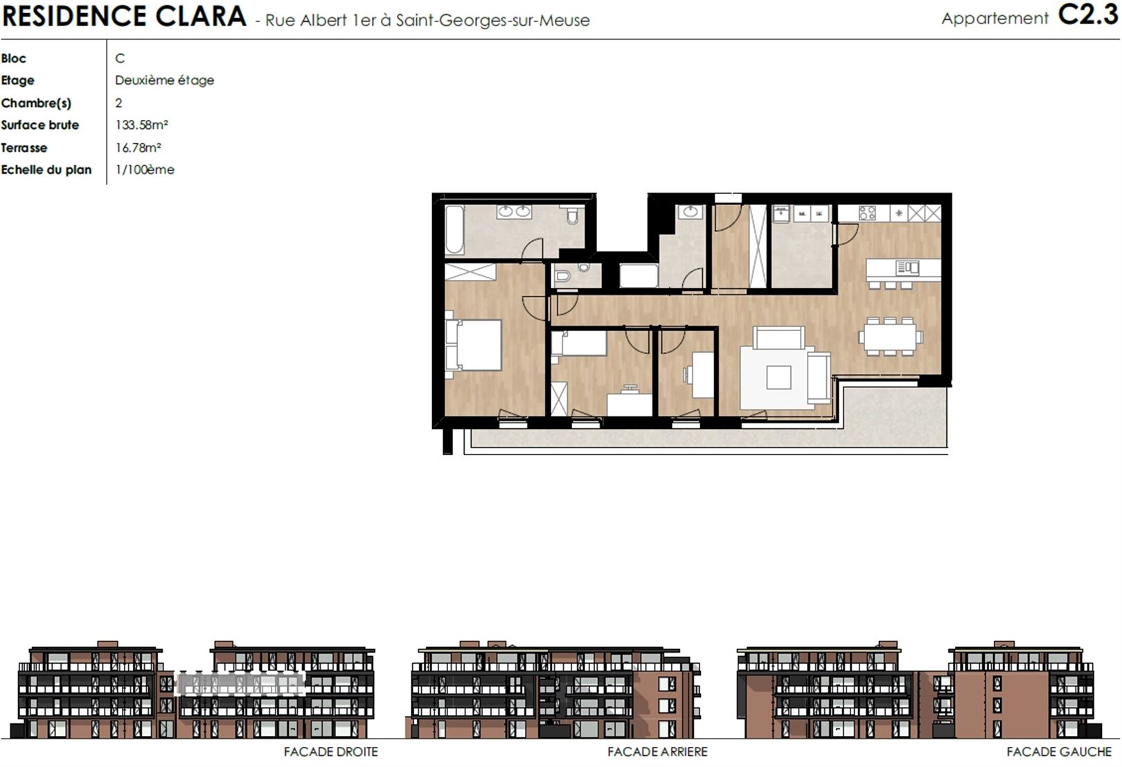 Situé au 2ème étage du "Bloc C", ce bel appartement est composé d'un beau séjour ouvert sur la cuisine entièrement équipée et offrant l'accès à la terrasse de 16 m², 3 agréables chambres, une salle de douche, une salle de bain, une buanderie et une toilette indépendante.