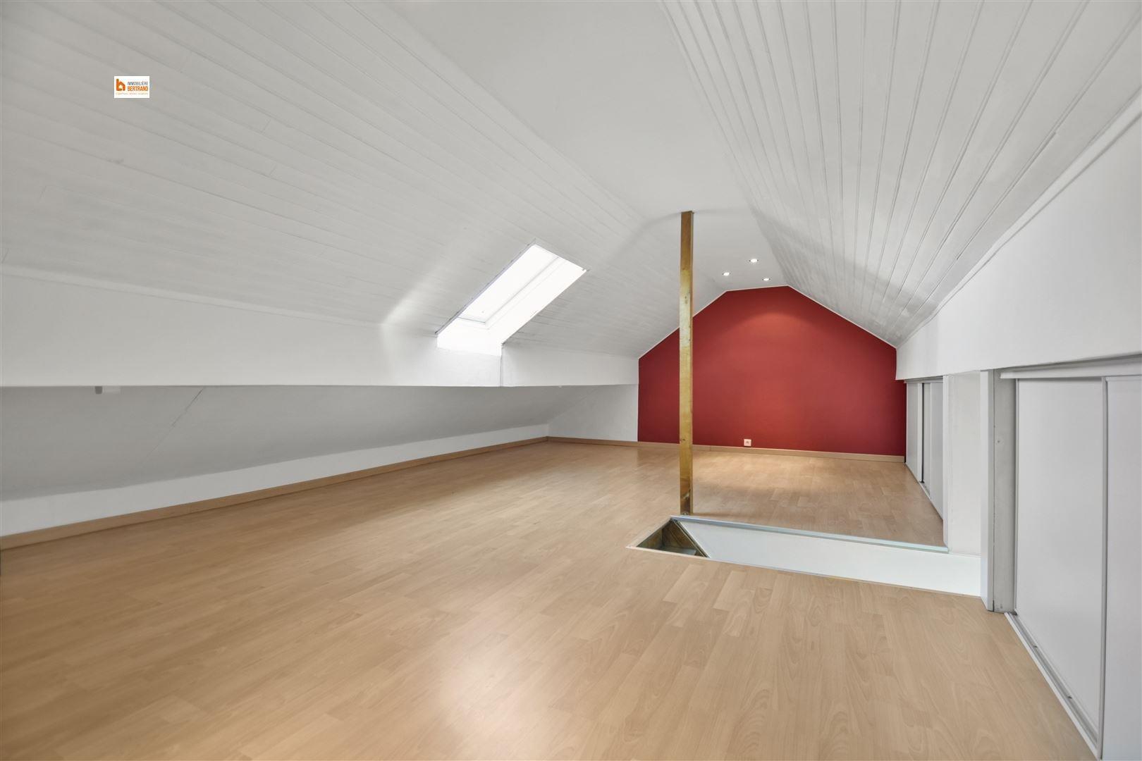 2 étage : Spacieuse chambre de +/- 21 m² avec rangement dans la mansarde sur le tout le long.