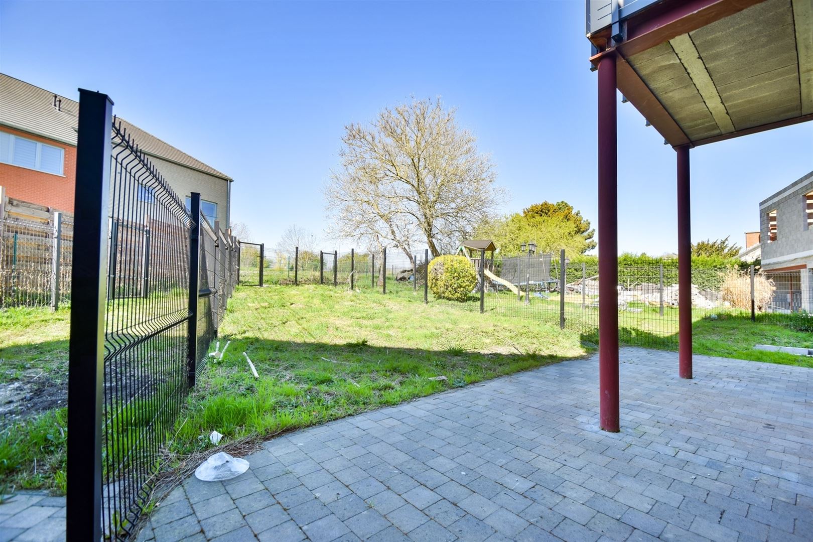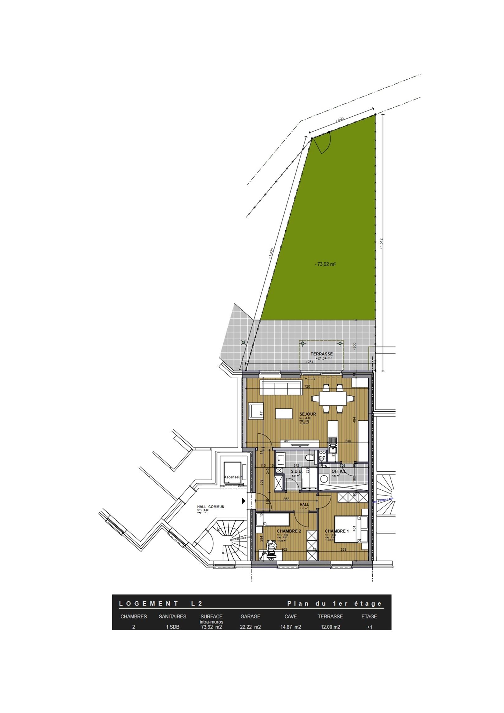 Au rez-de-jardin: un hall d'entrée desservant un beau séjour ouvert sur la cuisine équipée pour une superficie de 32m², une terrasse de 22m² et un jardin de 74m², 2 agréables chambres (12m² et 10m²) une salle-de-douche et une buanderie.Parking et cave en supplément (21.500,00€ HTVA).