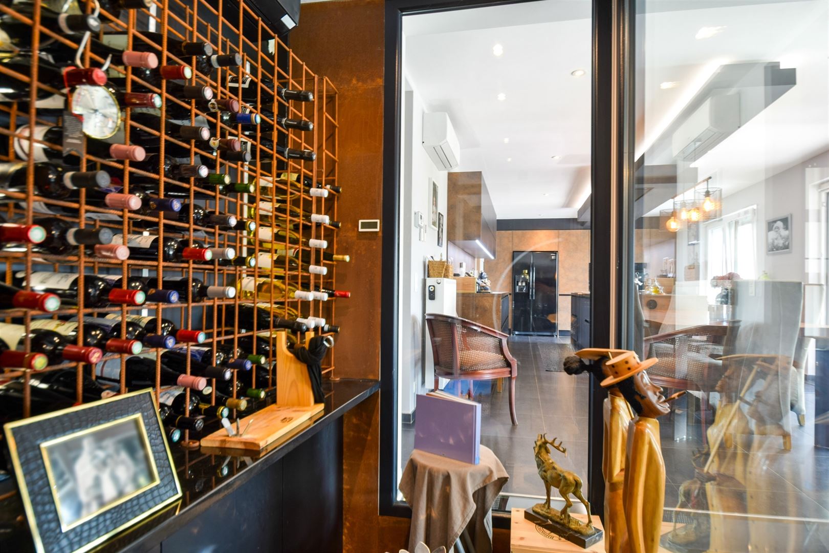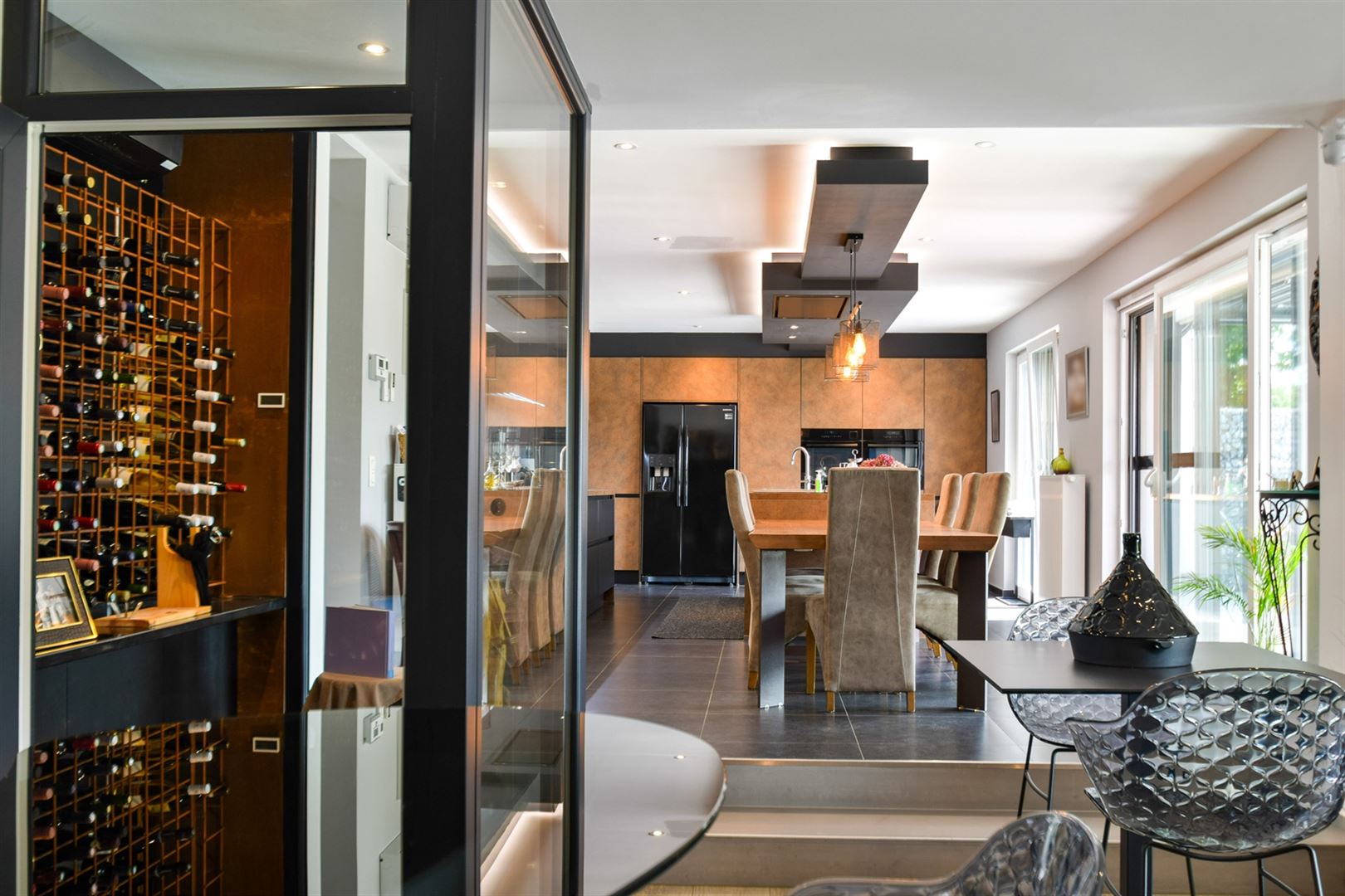 un hall d'entrée, un spacieux salon de 27 m² avec insert au gaz, agrémenté d'une splendide cave à vin en pierre et d'un espace bar, une lumineuse salle à manger ouverte sur la cuisine entièrement équipée, 3 agréables chambres dont une suite parentale avec salle de douche et dressing pour une superficie totale de 23 m², une seconde salle de douche, un spacieux garage deux voitures de 34 m² équipé d'une cuisine supplémentaire.