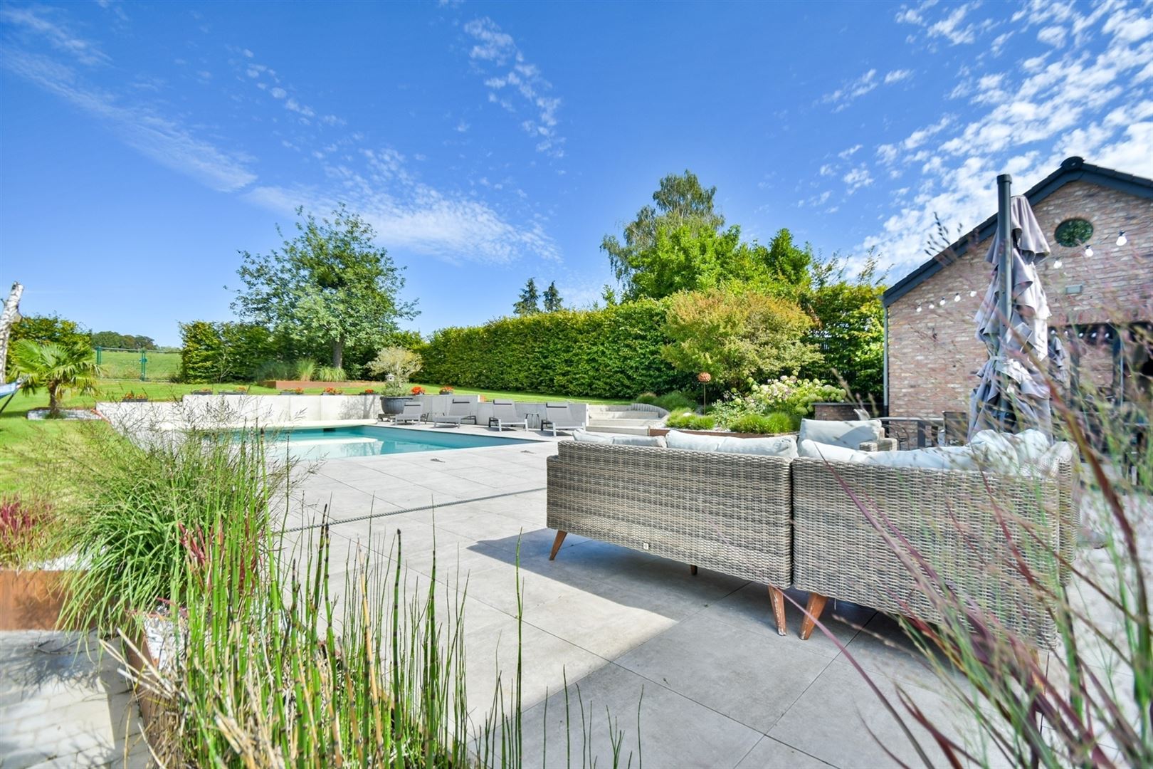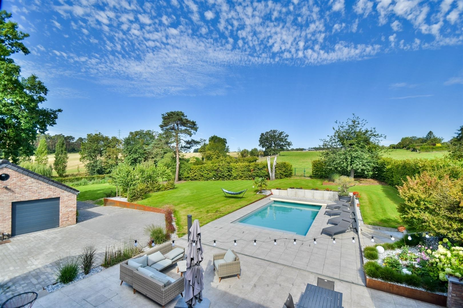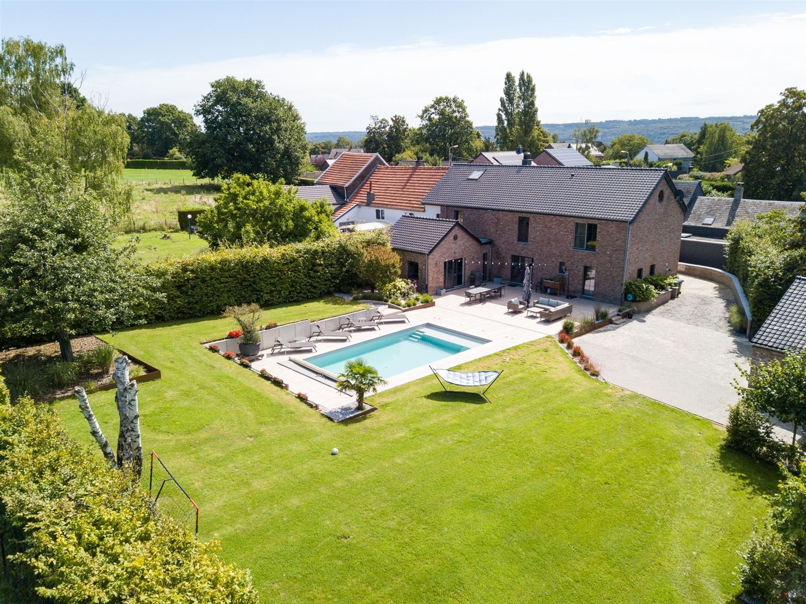 À l'extérieur : une grande terrasse de ± 90 m², une piscine extérieure chauffée avec volet électrique, deux carports, 2 boxes, un étang naturel et un superbe jardin arboré de ± 3.500 m². Le bien vous séduira par son environnement paisible, véritable havre de paix !