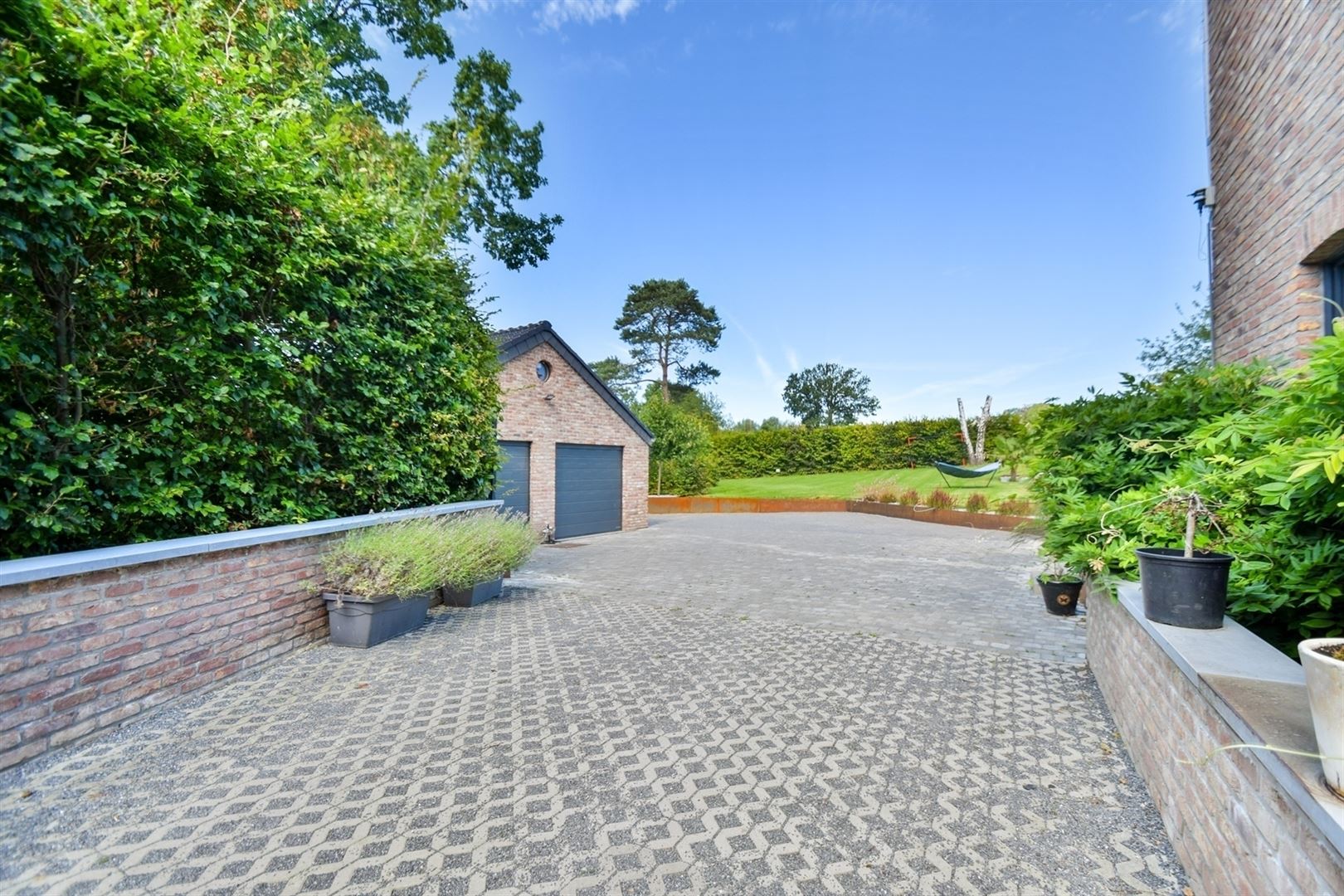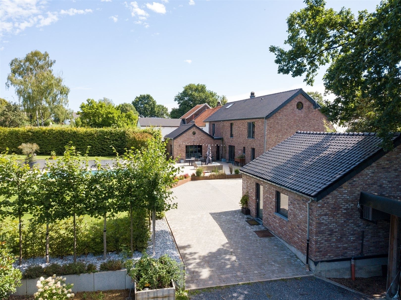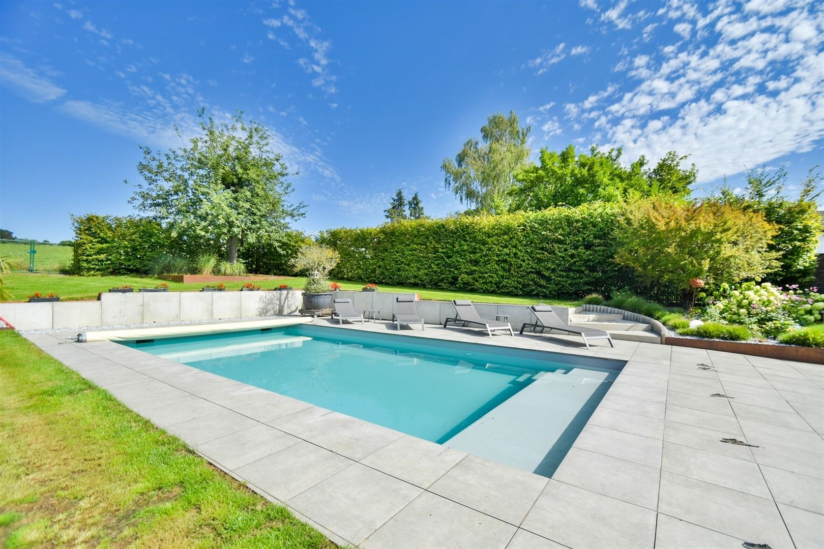 À l'extérieur : une grande terrasse de ± 90 m², une piscine extérieure chauffée avec volet électrique, deux carports, 2 boxes, un étang naturel et un superbe jardin arboré de ± 3.500 m². Le bien vous séduira par son environnement paisible, véritable havre de paix !
