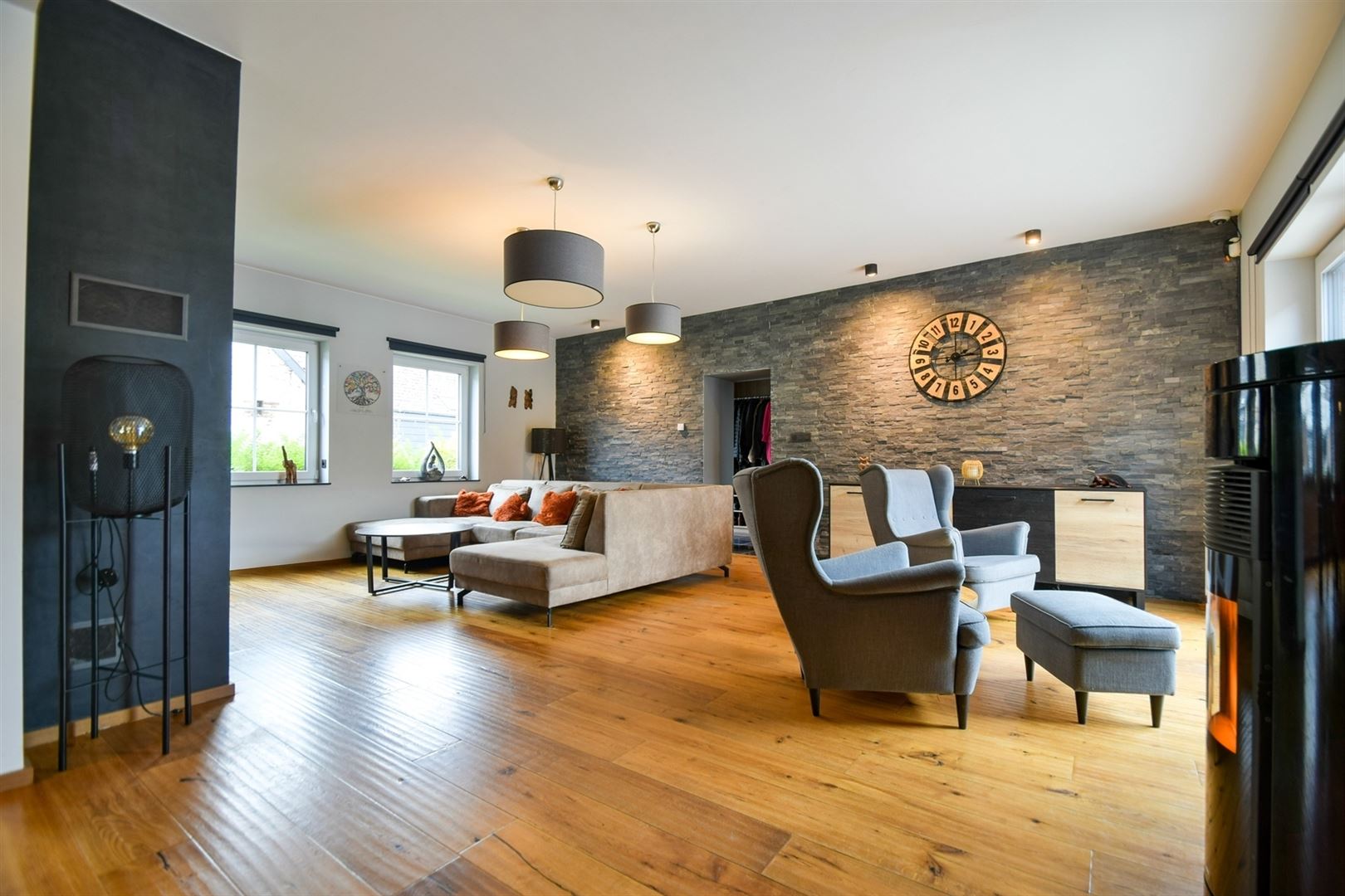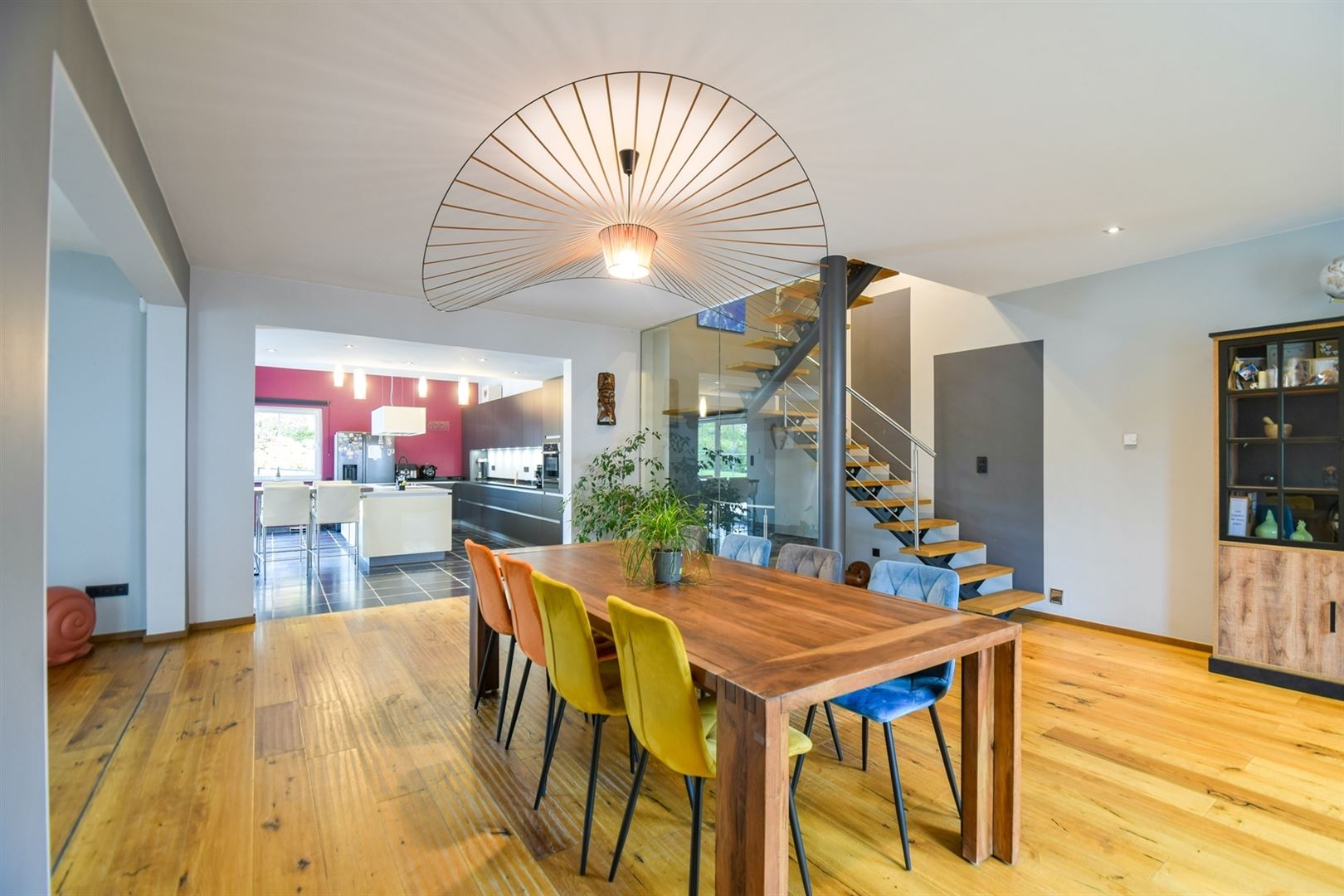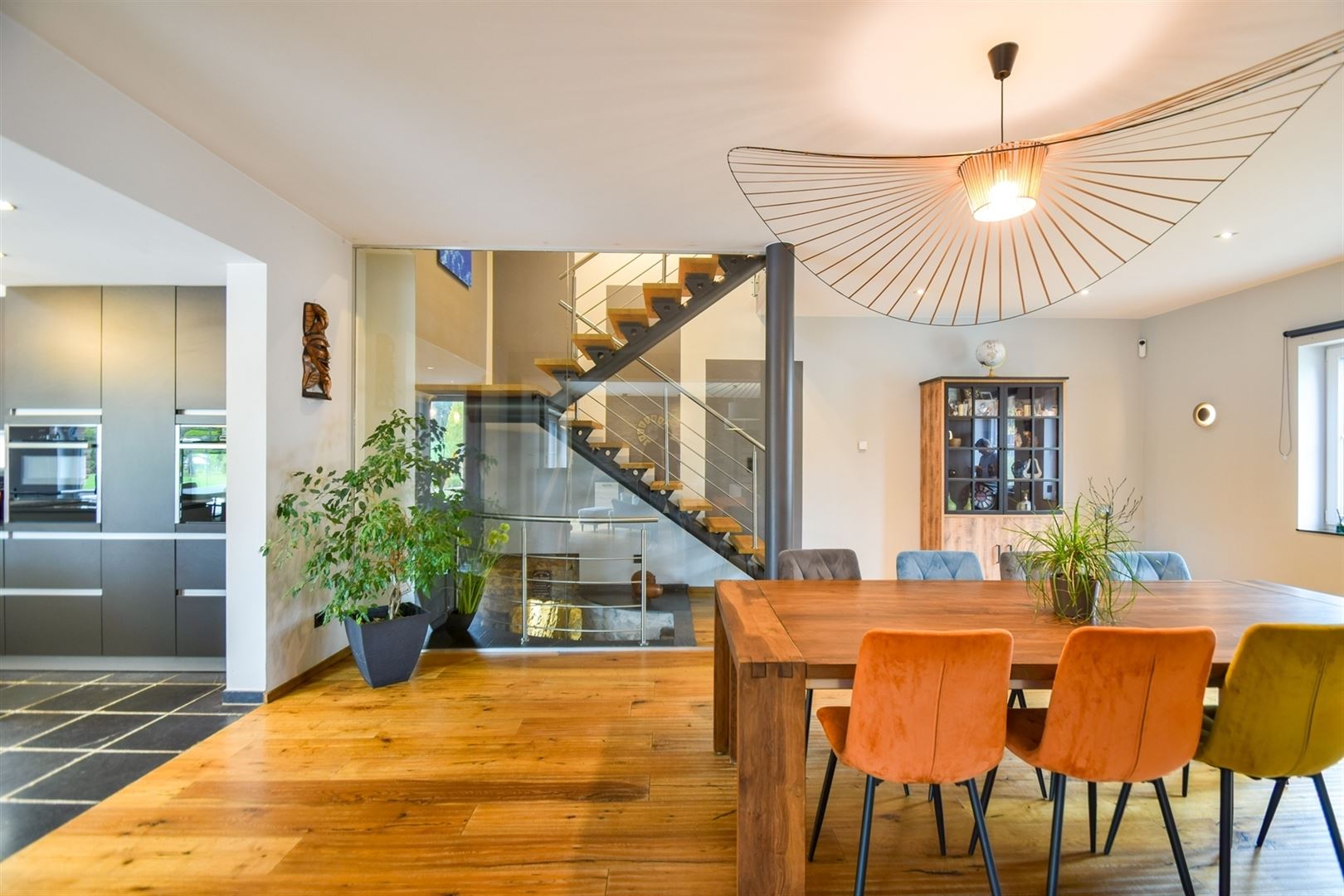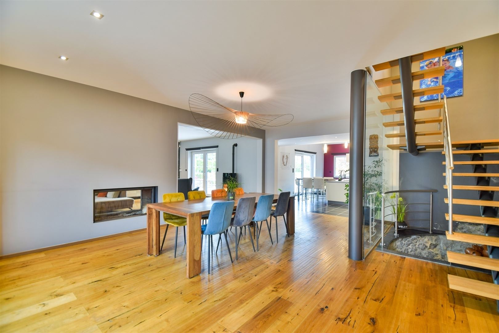Au rez-de-chaussée : hall d'entrée avec espace vestiaire et WC indépendant, bureau avec accès indépendant (idéal pour profession libérale), spacieux séjour de ± 78 m² avec cassette à bois double face et poêle à pellets, cave à vin de caractère, lumineuse cuisine entièrement équipée avec accès à la terrasse, chaufferie et deux grands garages avec mezzanine.