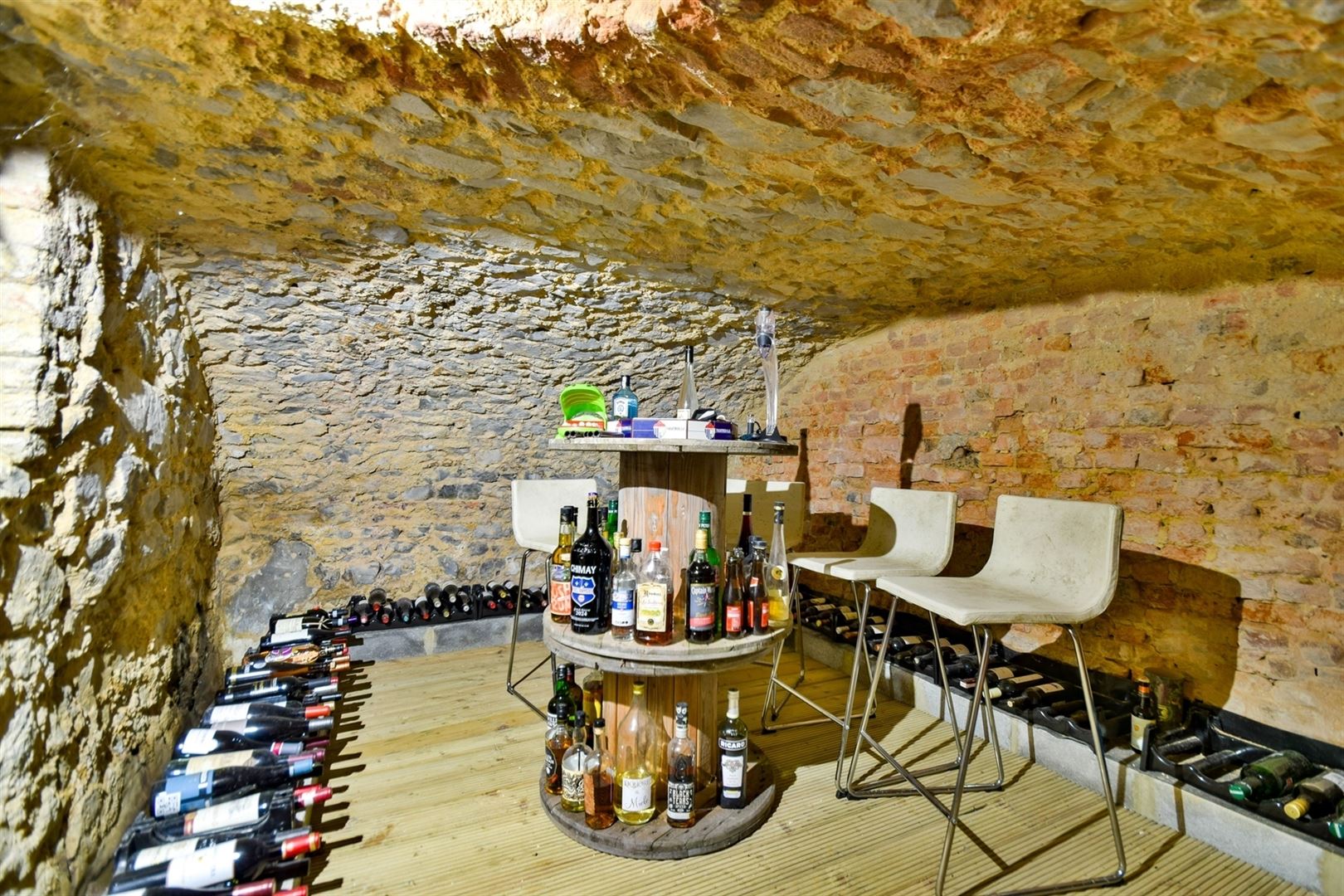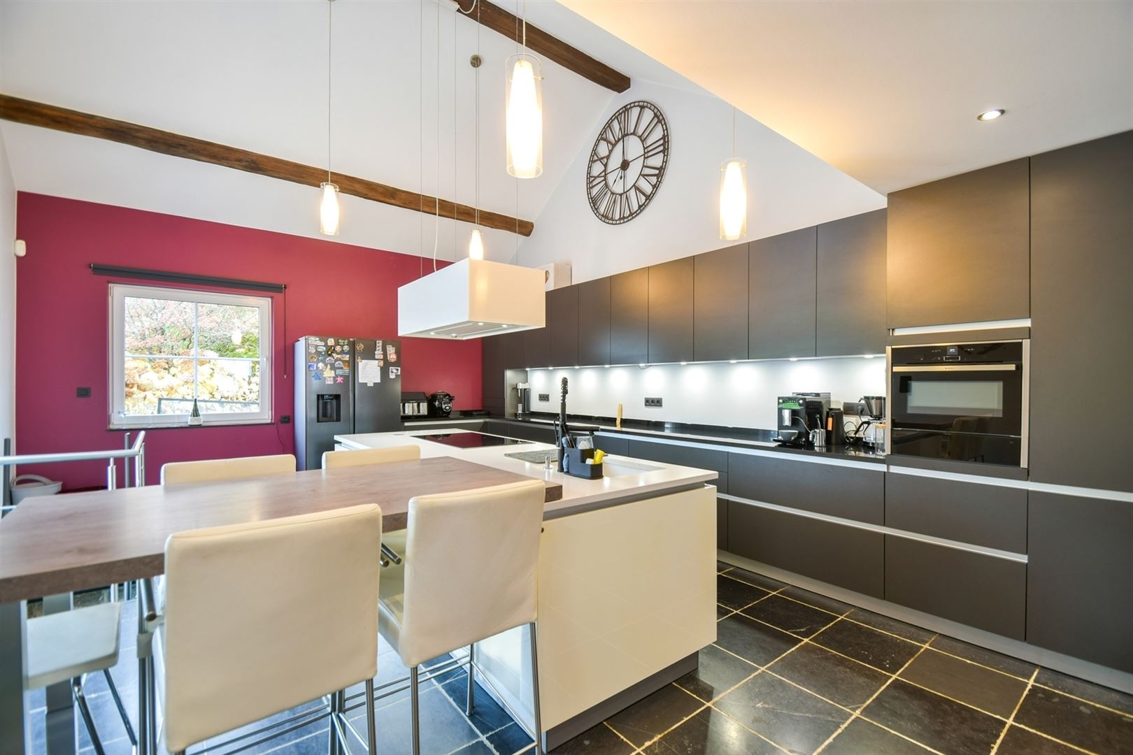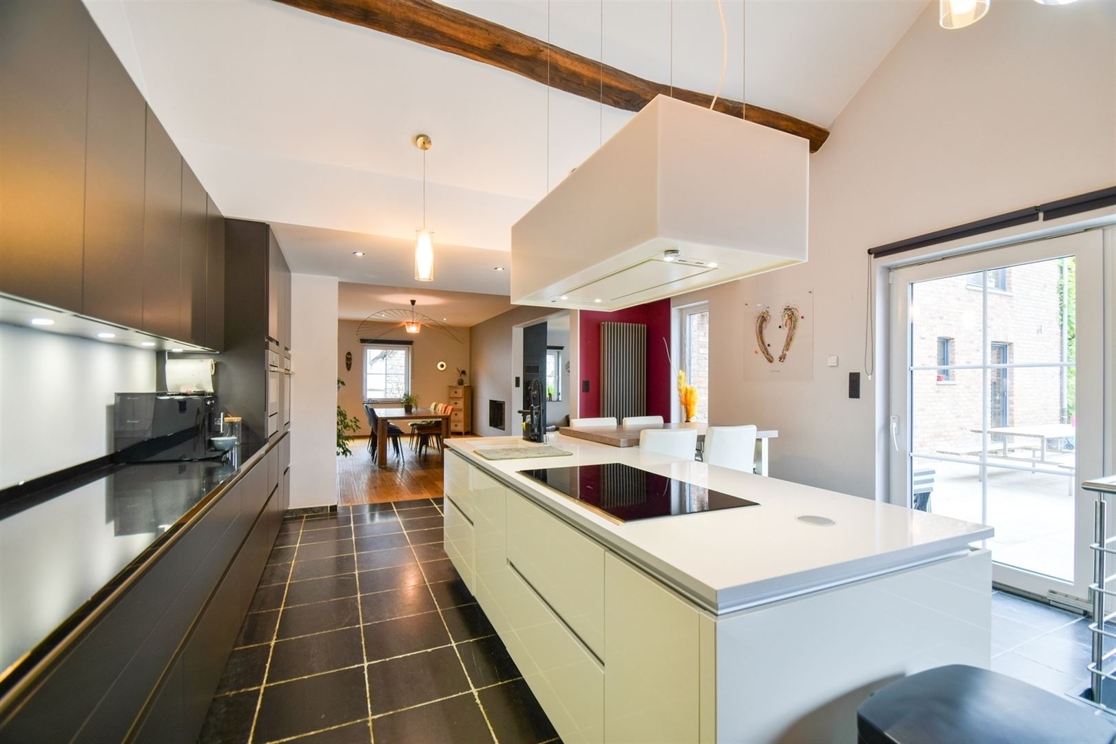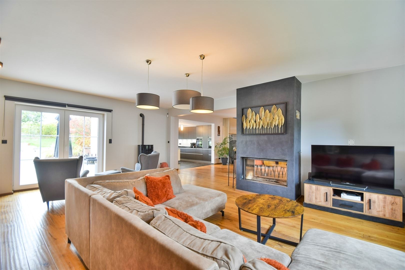 Au rez-de-chaussée : hall d'entrée avec espace vestiaire et WC indépendant, bureau avec accès indépendant (idéal pour profession libérale), spacieux séjour de ± 78 m² avec cassette à bois double face et poêle à pellets, cave à vin de caractère, lumineuse cuisine entièrement équipée avec accès à la terrasse, chaufferie et deux grands garages avec mezzanine.