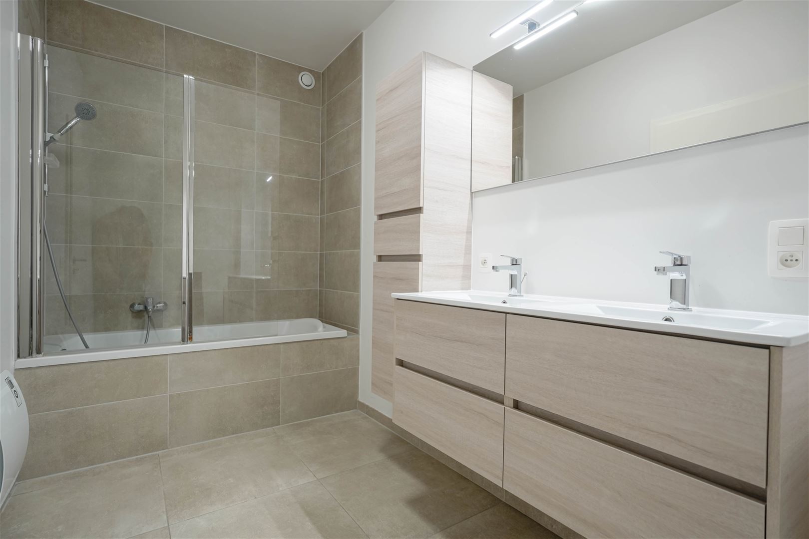 L’appartement dispose également d’une buanderie équipée pour l’installation d’une machine à laver et d’un sèche-linge, avec de nombreux rangements, d’un WC indépendant, de deux belles chambres (12 et 18m²) ainsi que d’une salle de bain avec meuble double vasque.