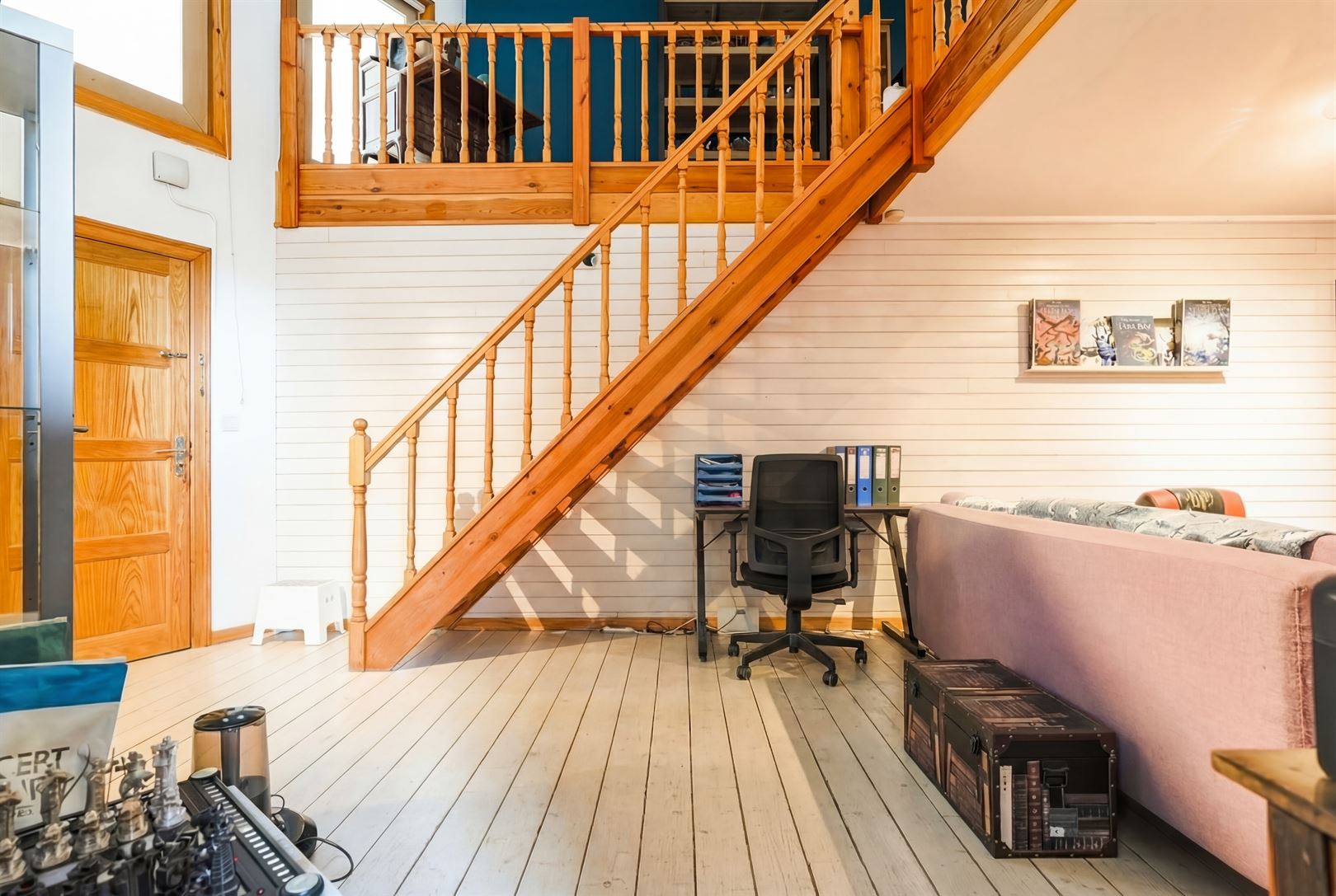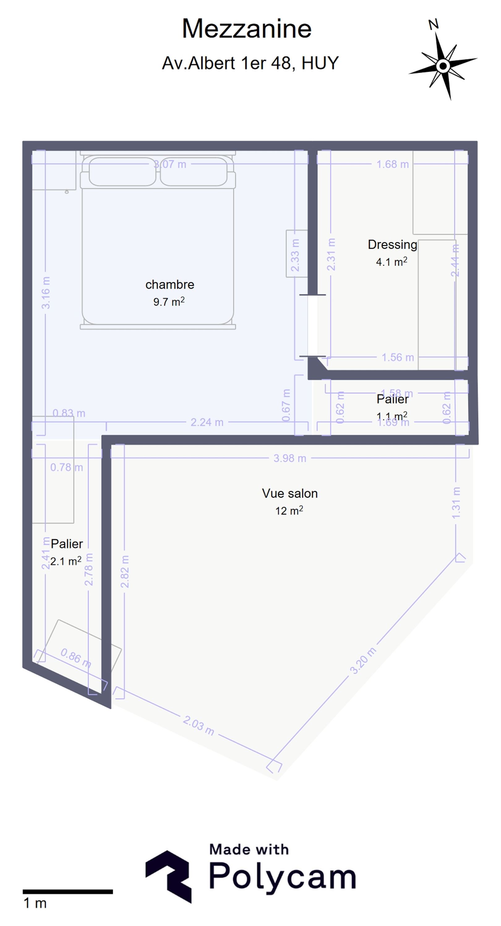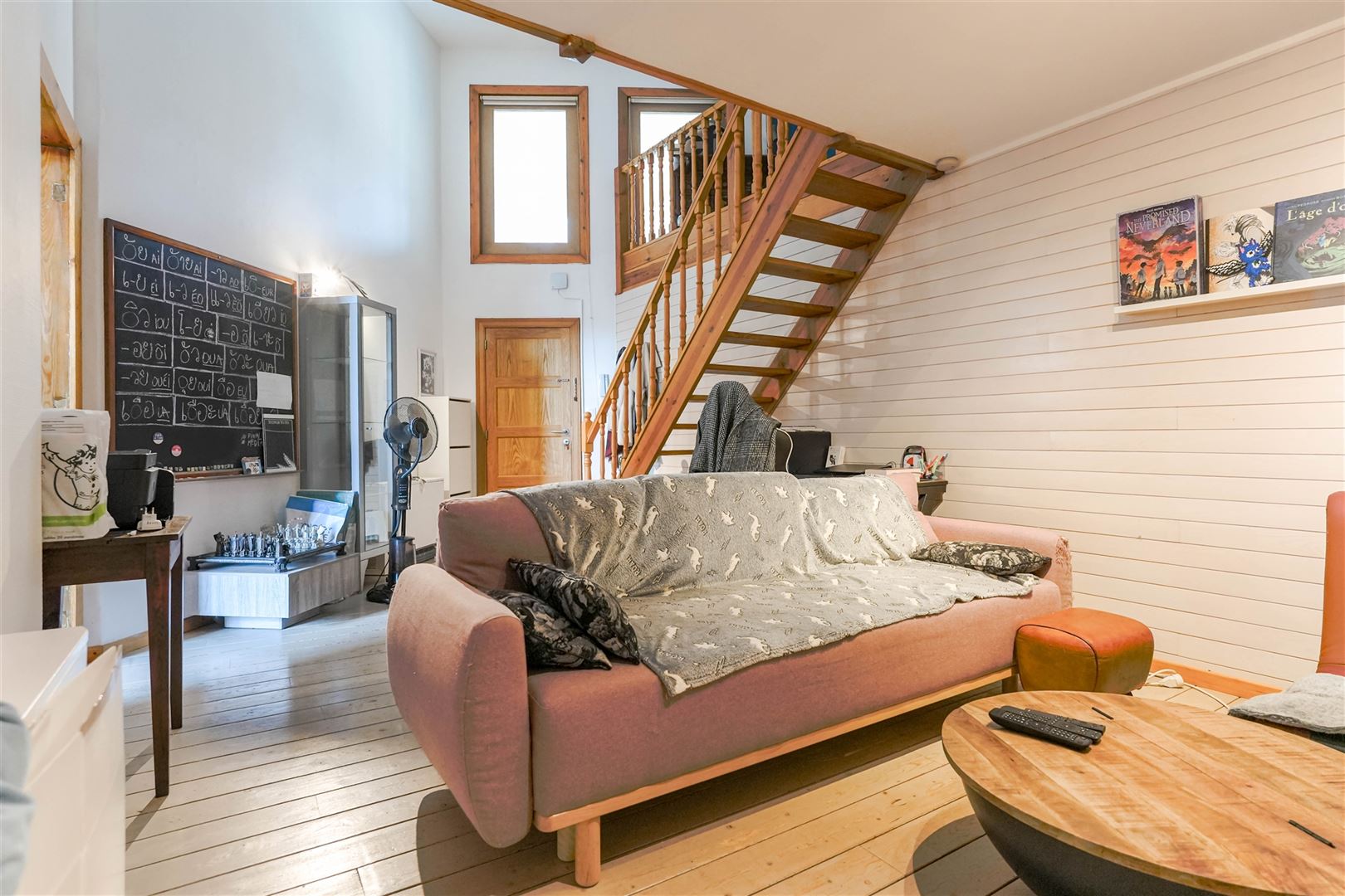 Au 1er étage : beau séjour de 22 m², cuisine équipée de 14 m² et salle-de-douche, agréable chambre en mezzanine de 11 m² avec dressing.